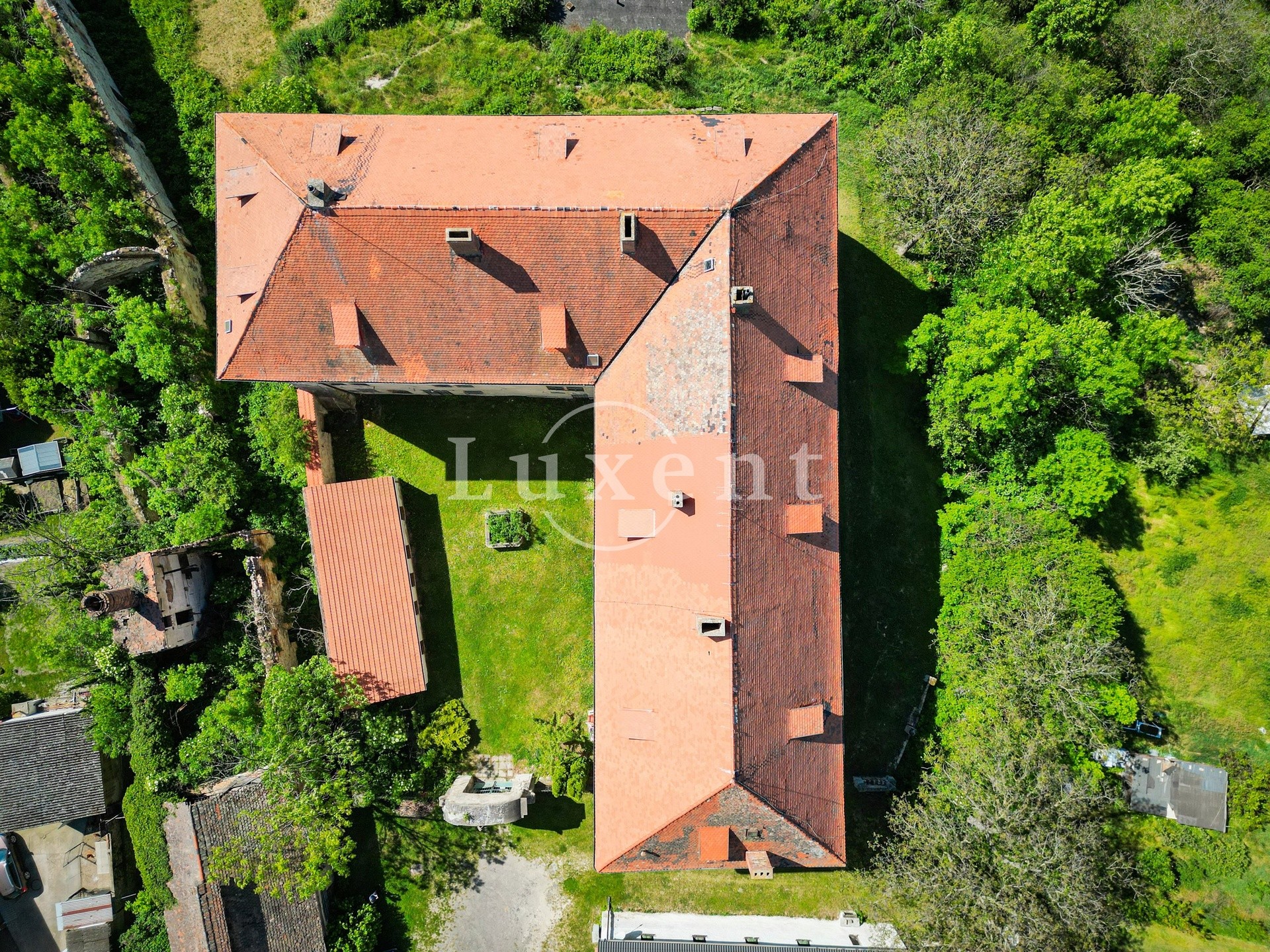 Das zweiflügelige Schloss in L-Form ist von einem ausgedehnten Wirtschaftshof umgeben. Im Norden führt ein barockes Tor mit einem neueren Zaun zu dem Schlosshof mit einem Brunnen. Eine Straße führt entlang des östlichen Zauns zum Wirtschaftshof und im Westen trennt eine ursprüngliche Straße den Wirtschaftshof von einem angrenzenden Garten. Vom Aussichtspunkt am südlichen Hauptflügel des Schlosses führen Überreste einer alten Steintreppe zum unteren Hof. Hier sind auch stützende Mauern zu sehen, die diese beiden Bereiche trennen.