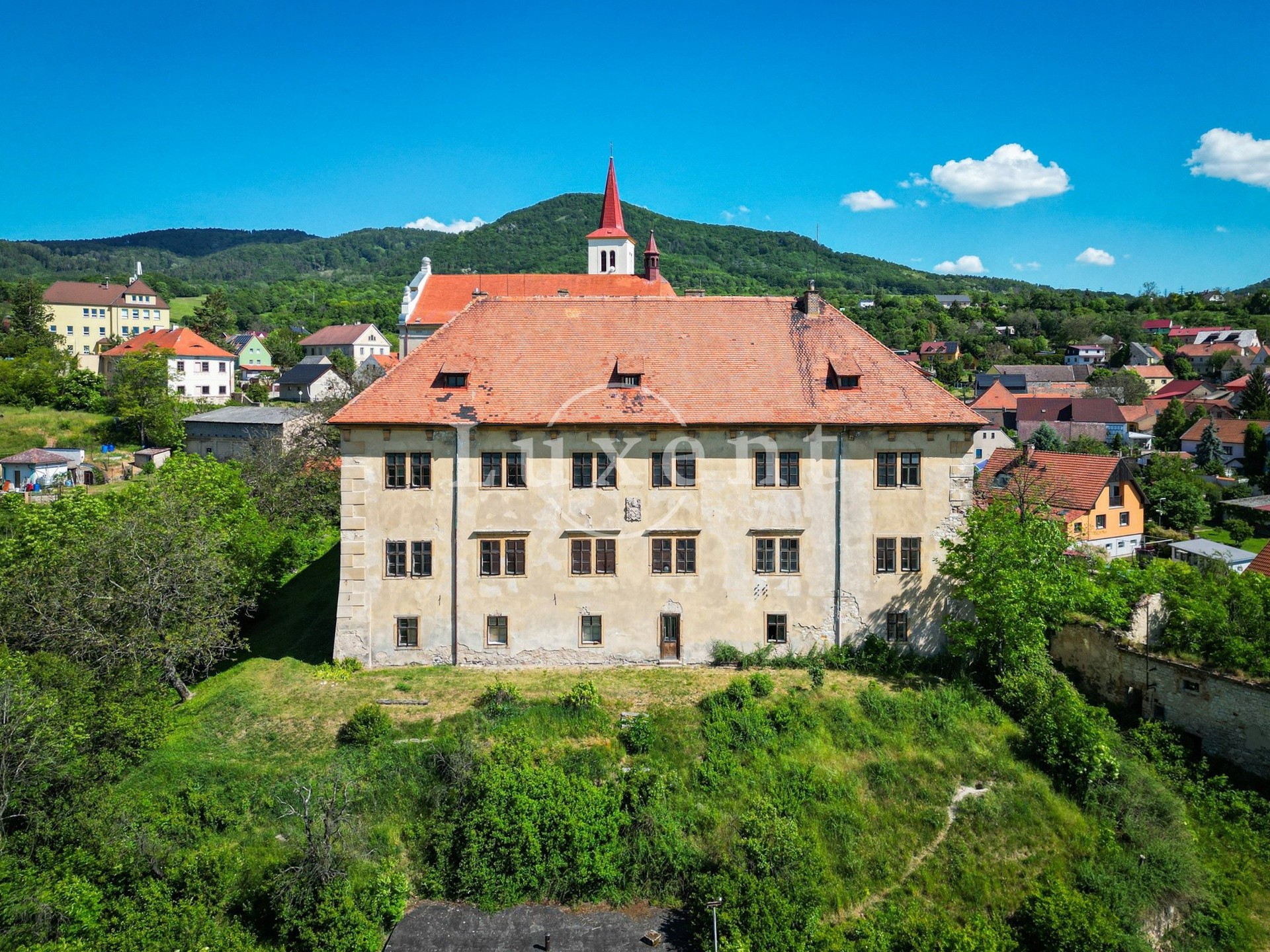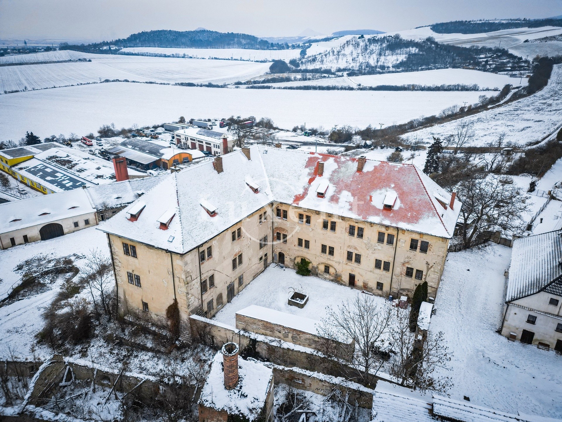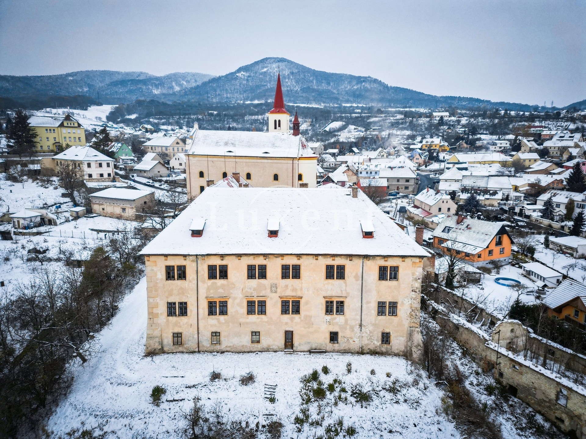 Das Schloss thront am Hang und bildet mit dem angrenzenden Gutshof und der Kirche St. Peter und Paul ein markantes Ensemble mit atemberaubendem Blick auf Litoměřice und die Landschaft des Böhmischen Mittelgebirges.