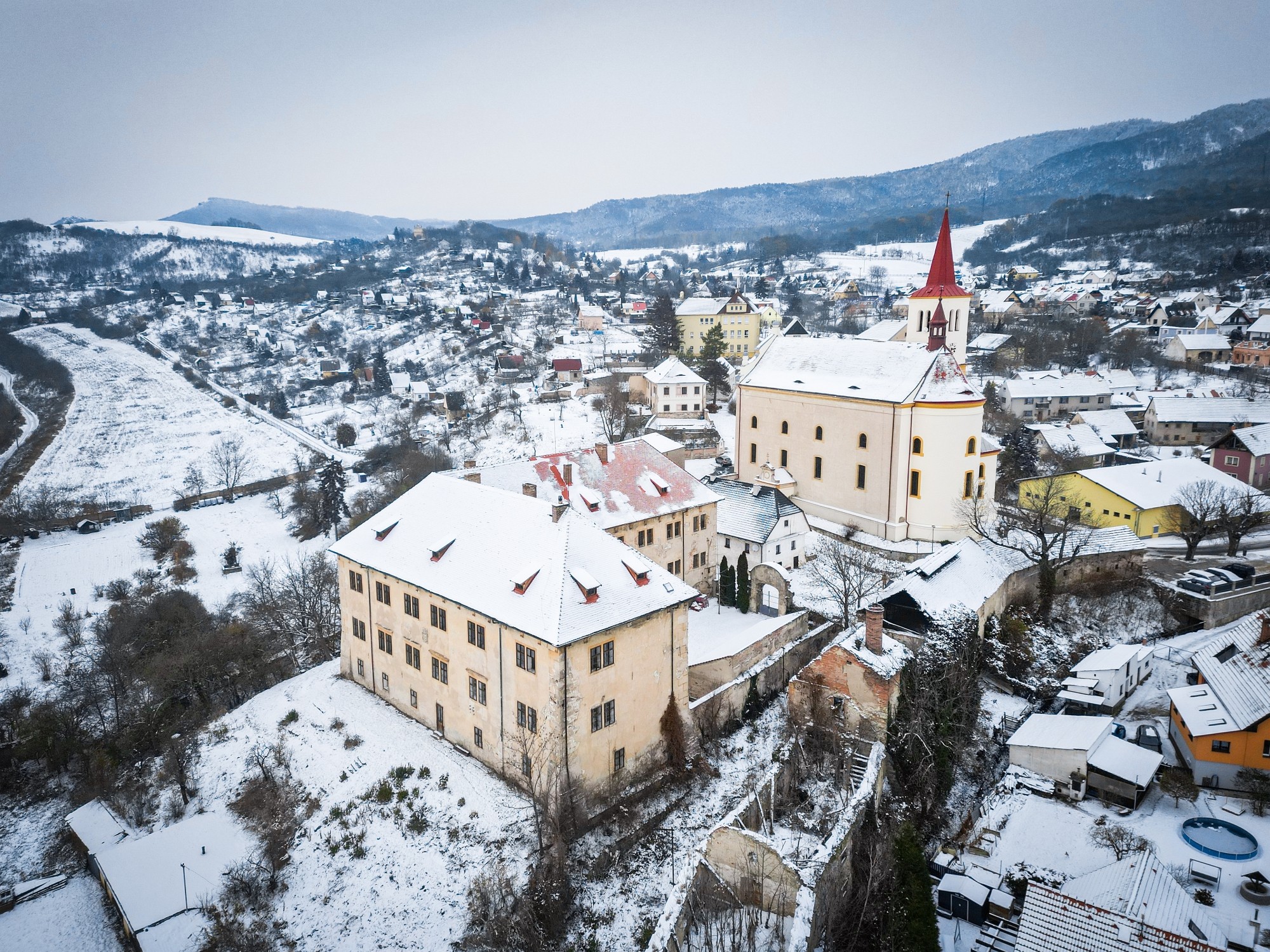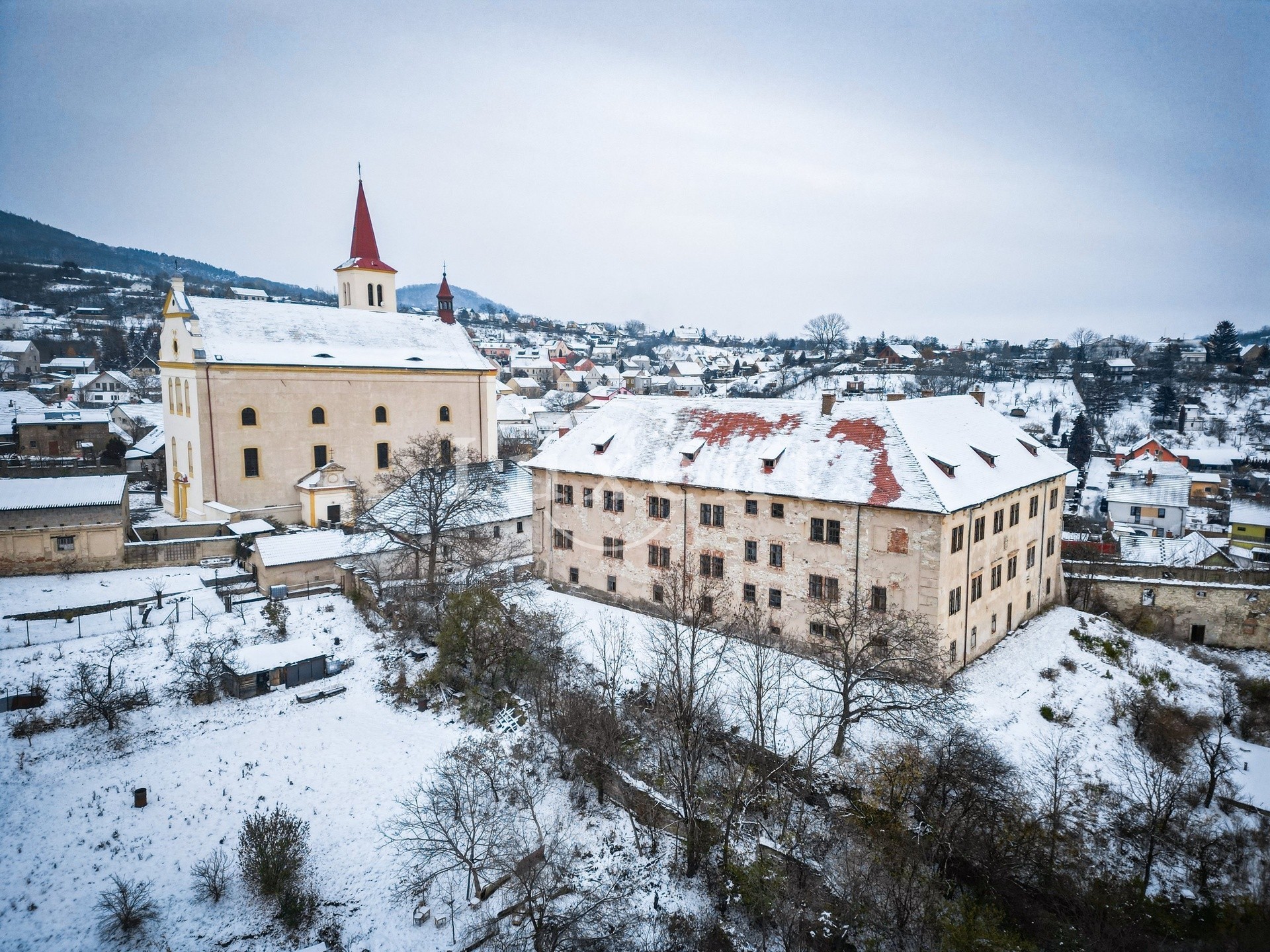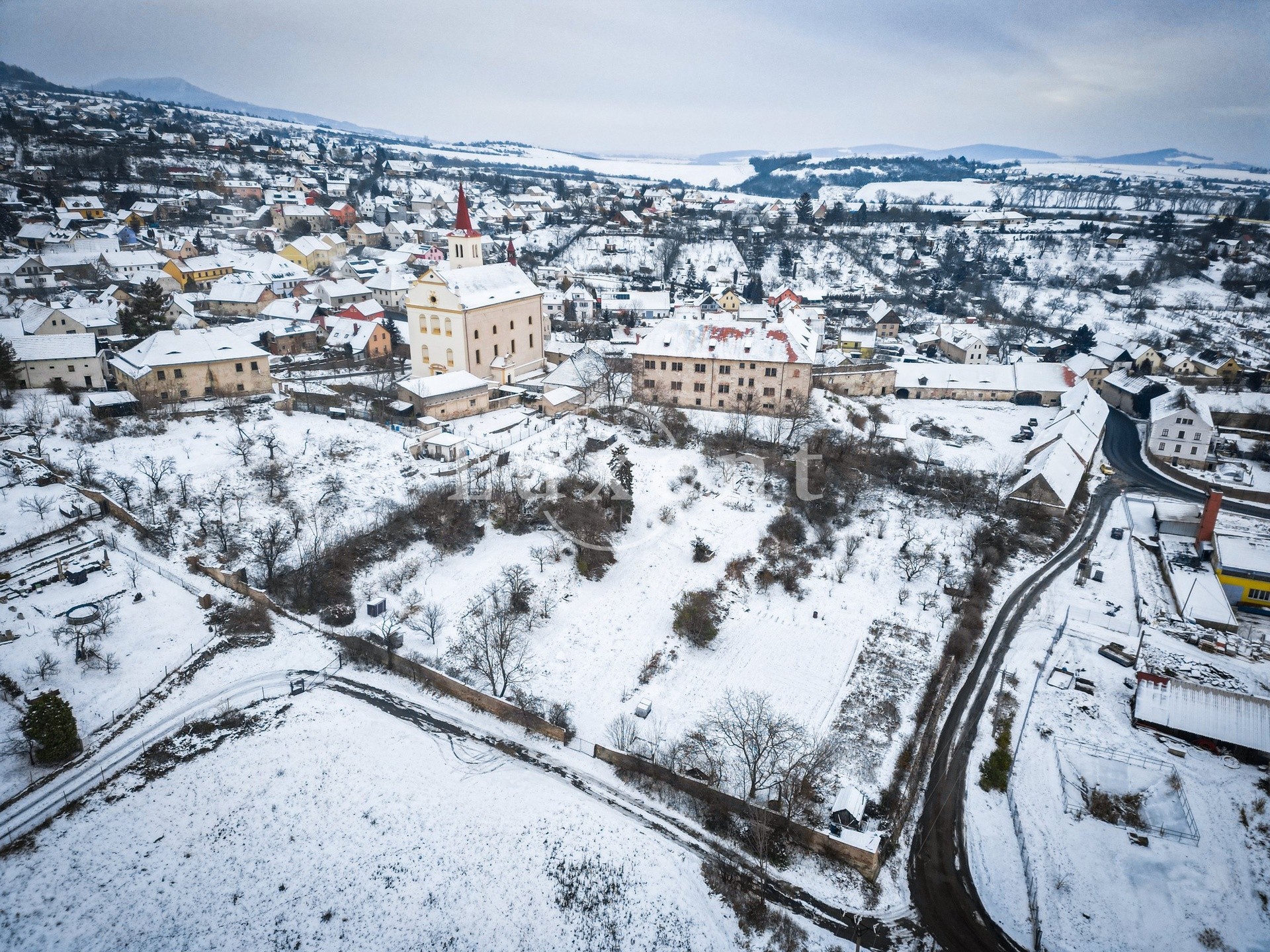 Das Schloss thront am Hang und bildet mit dem angrenzenden Gutshof und der Kirche St. Peter und Paul ein markantes Ensemble mit atemberaubendem Blick auf Litoměřice und die Landschaft des Böhmischen Mittelgebirges.