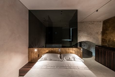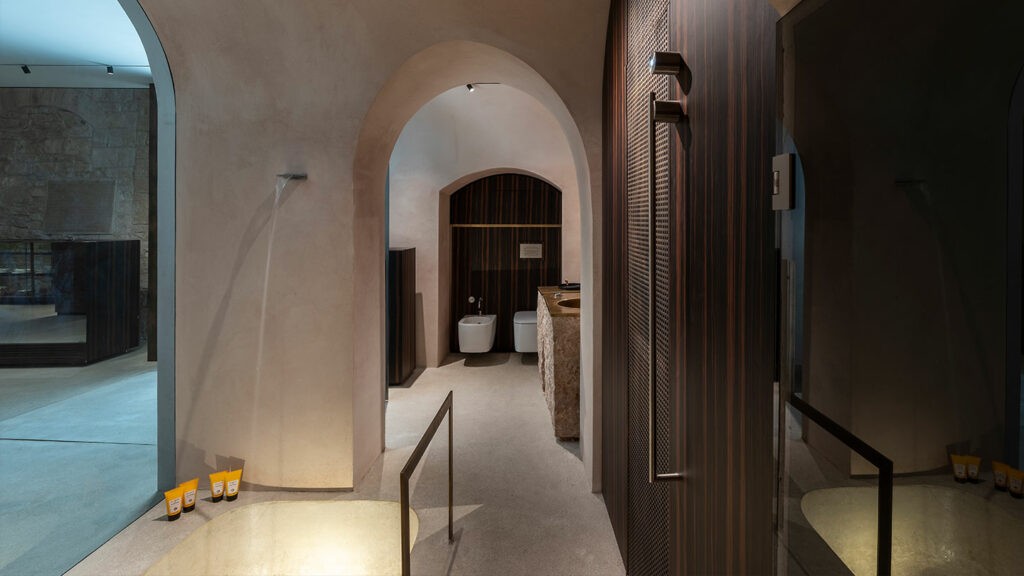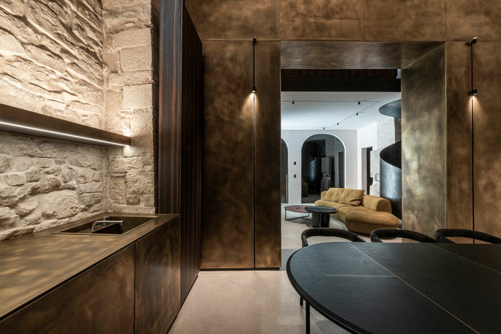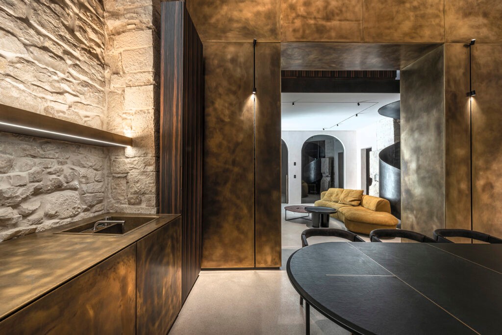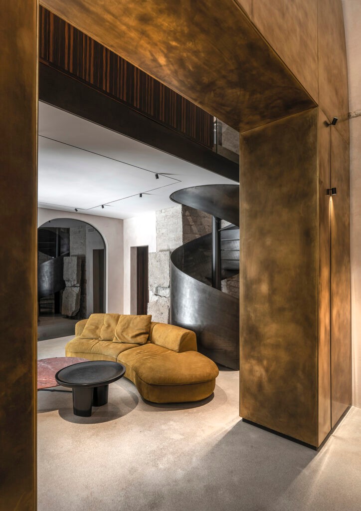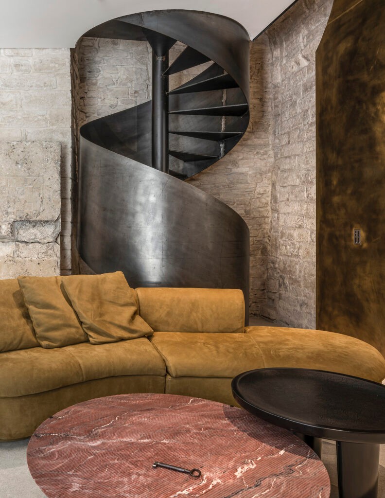 The main level (around 70 sq m) is defined by its extraordinary volume — up to 8 metres high — and by original masonry surfaces revealed by hand, exposing centuries-old stone and tuff. Above, a 30 sq m mezzanine adds a private, versatile layer: an intimate sleeping area, a study, or a quiet retreat overlooking the dramatic space below. Linking the two is a striking helical staircase in delabré steel, both sculptural and purposeful, a contemporary signature that respects the building’s soul.