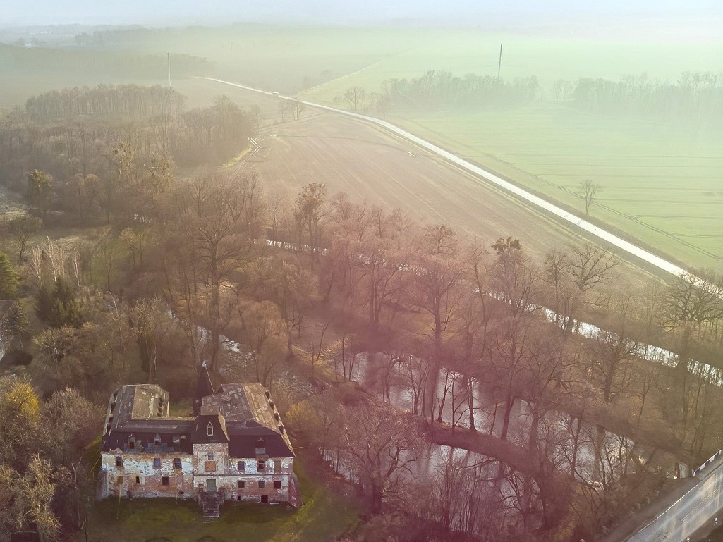 The castle in Komorowice is located 12 km south of Wrocław’s main square. The 2.28-hectare property, which dates back to the 14th century, is surrounded by small ponds, moats, and the Ślęza River.