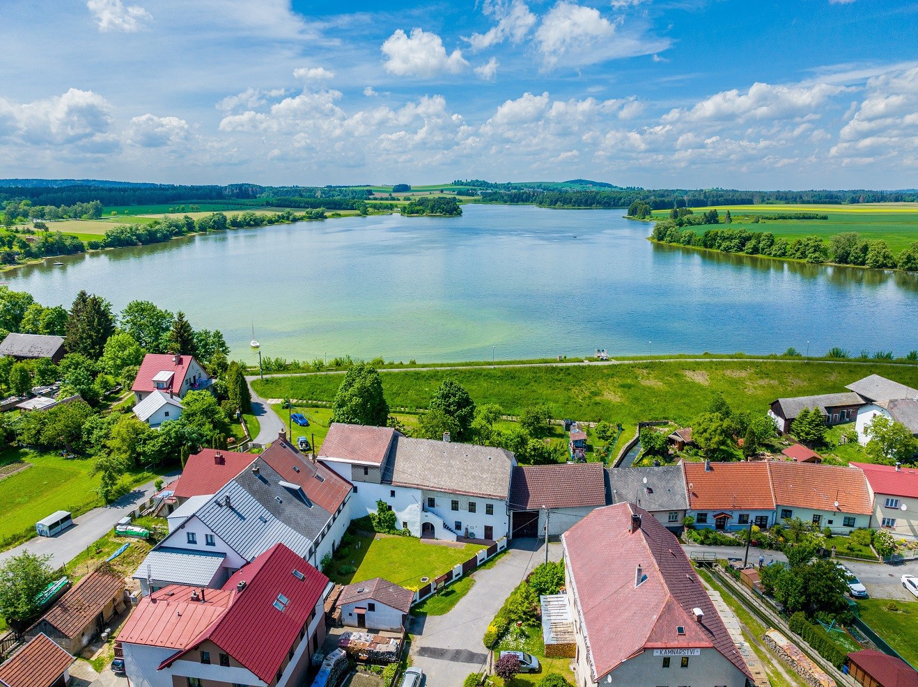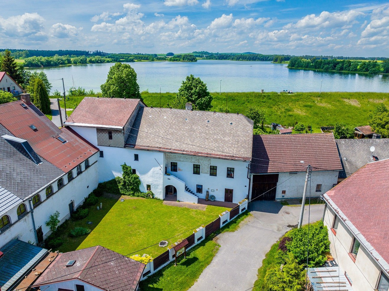 Former watermill in Nové Veselí, located in the Highlands region (Kraj Vysočina) of the Czech Republic. The property features a garden with green spaces and views of Wesseler Pond (Veselský rybník). The mill building dates back to the 14th century and retains well-preserved historic structure.