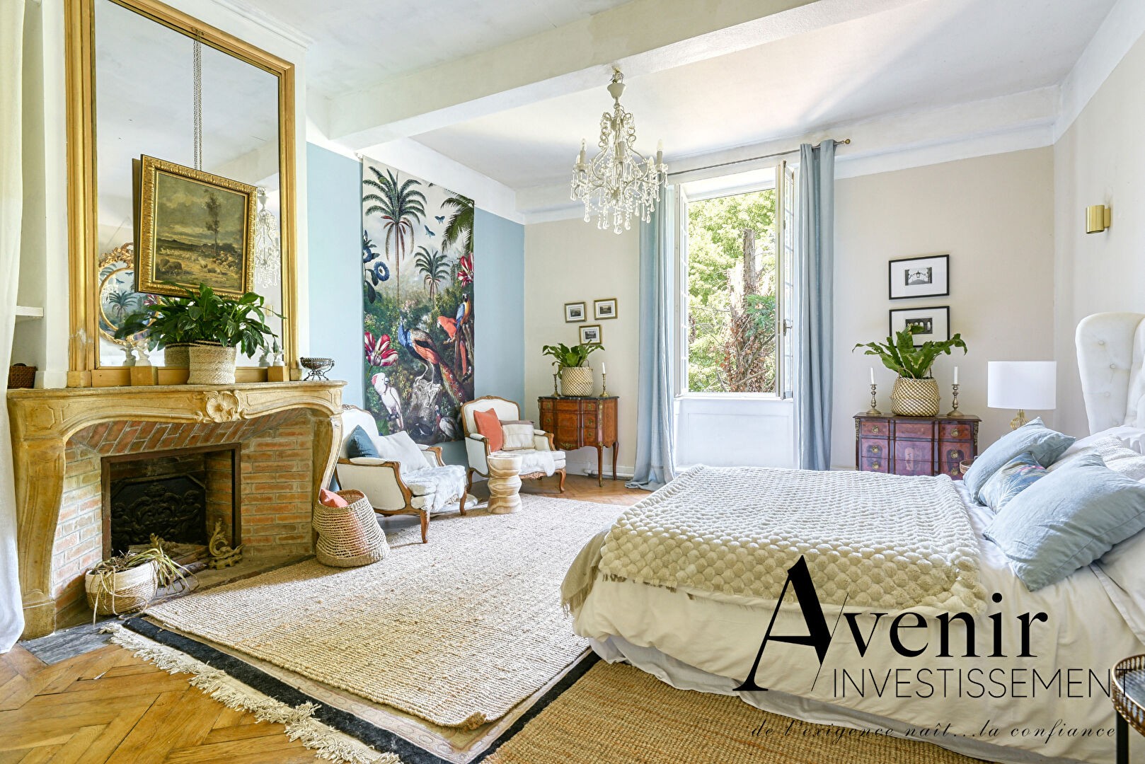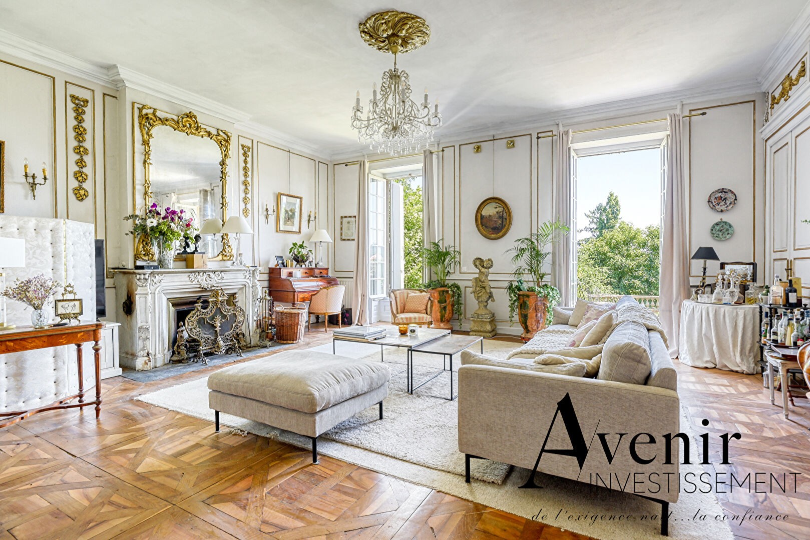The ground floor comprises formal reception rooms, including a drawing room, dining room, and library, all with southern aspects opening onto the terrace and gardens. The house retains its original architectural integrity, featuring period fireplaces, parquet flooring, and decorative wood panelling, complemented by the generous ceiling heights characteristic of the era. In total, the residence offers seven bedrooms, two bathrooms, and three shower rooms.