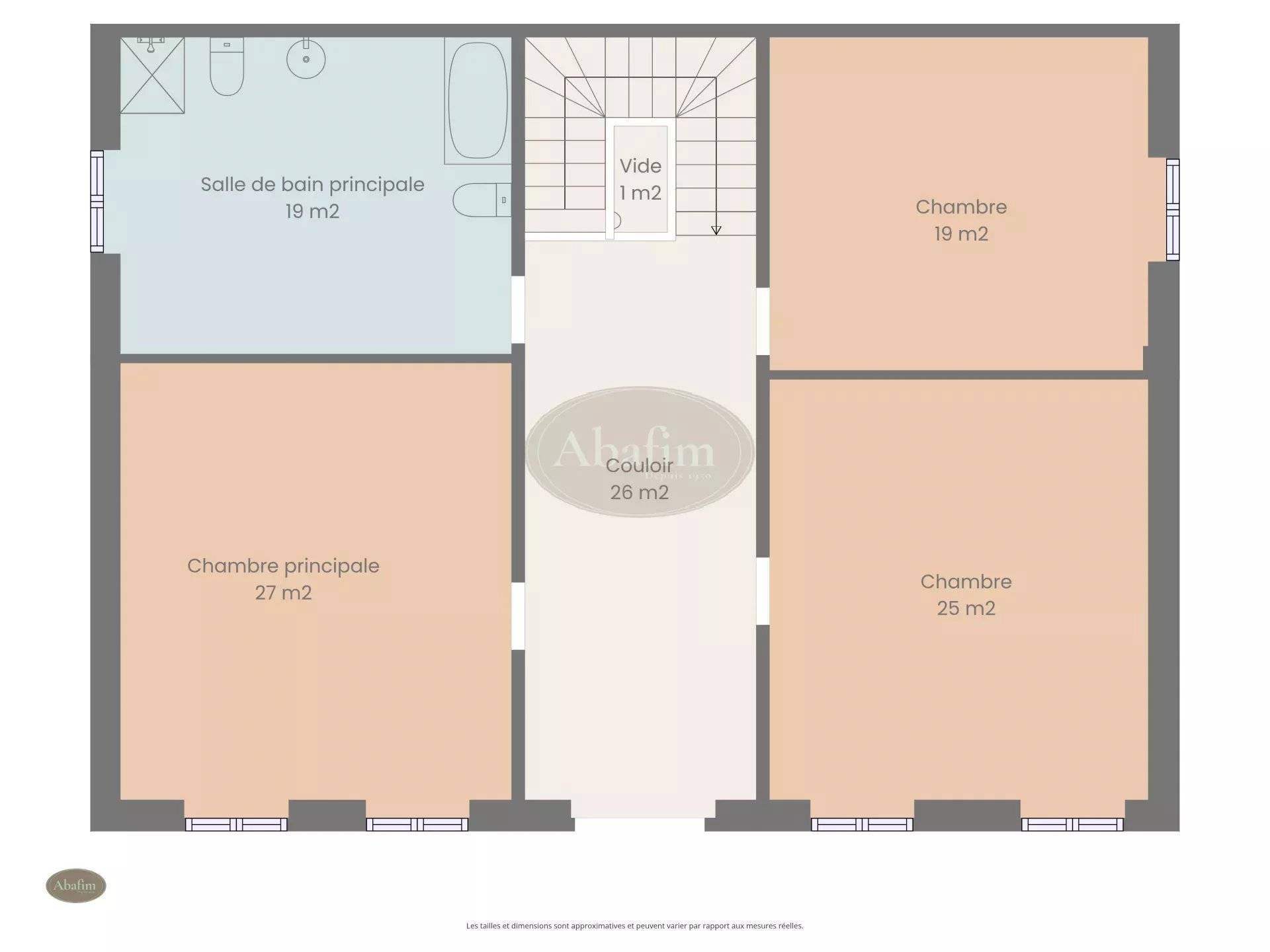 On the first floor, four spacious rooms of approximately 20 m² each comprise three bedrooms and a large bathroom with both shower and bathtub.