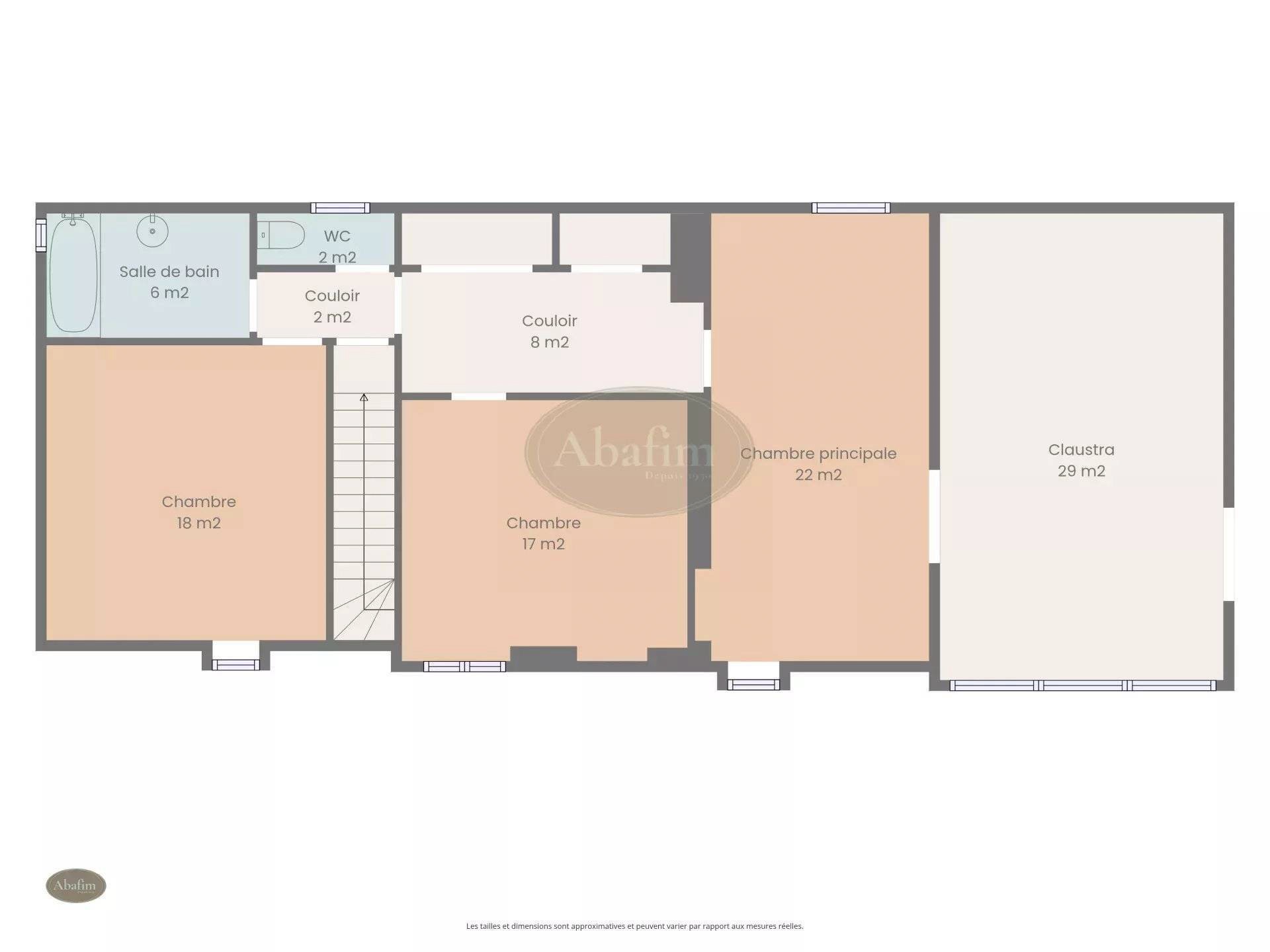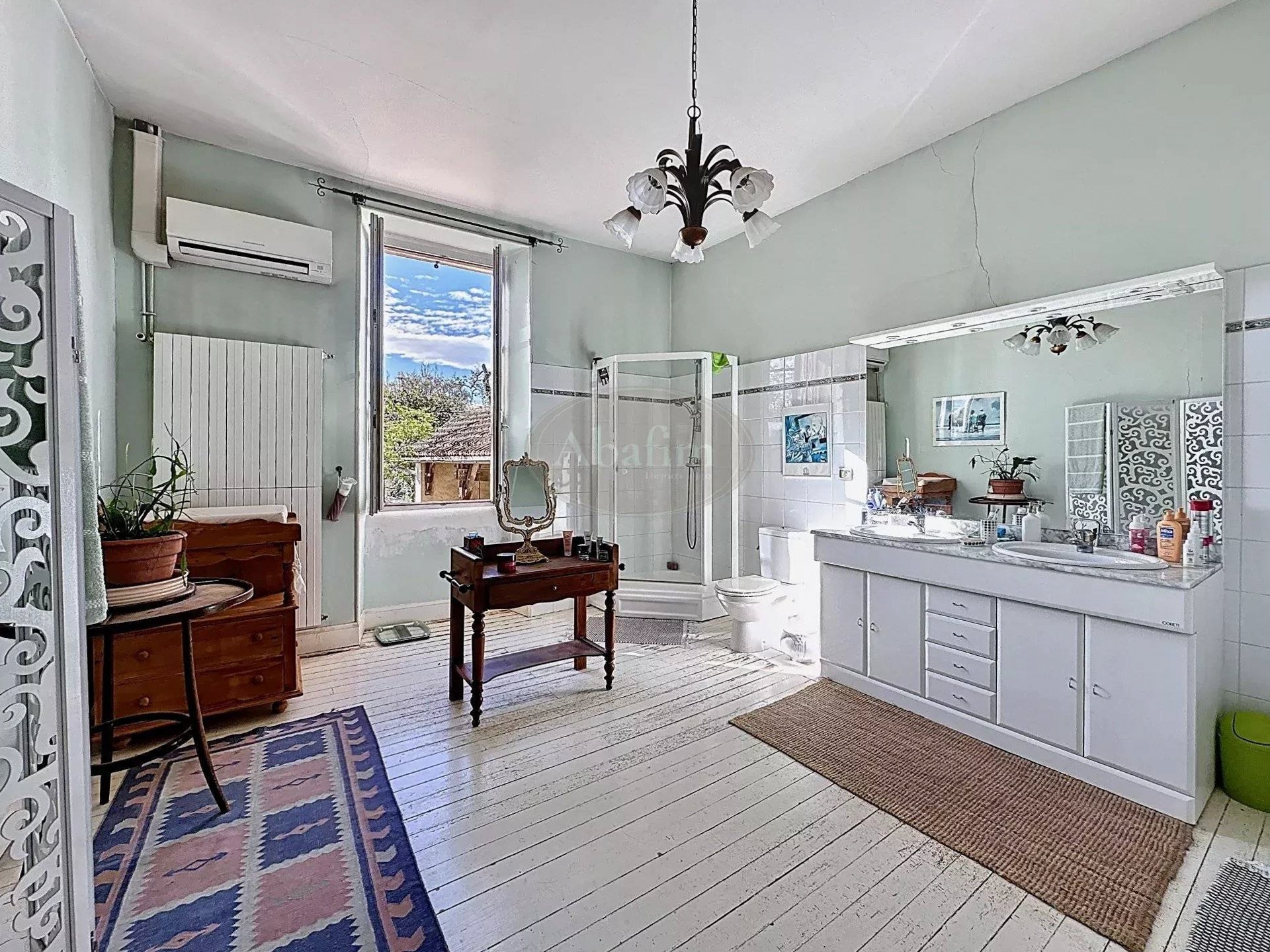 On the first floor, the guest house offers three large bedrooms, a bathroom with separate WC, and a 29 m² covered terrace adjoining the master bedroom.