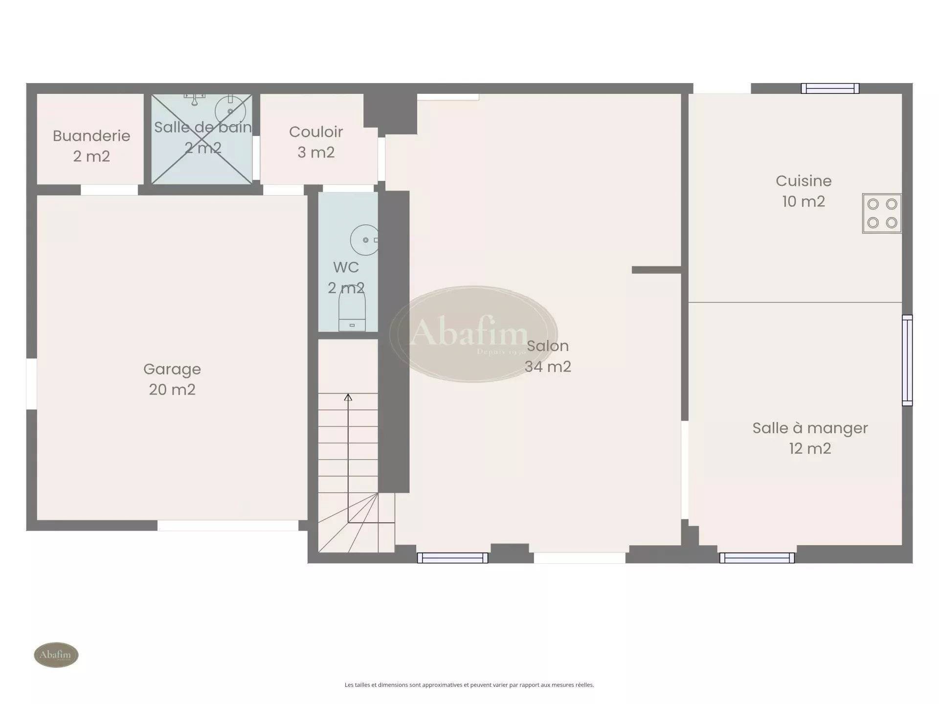 On the ground floor, four rooms are arranged around the grand entrance: office, kitchen, dining room and living room.