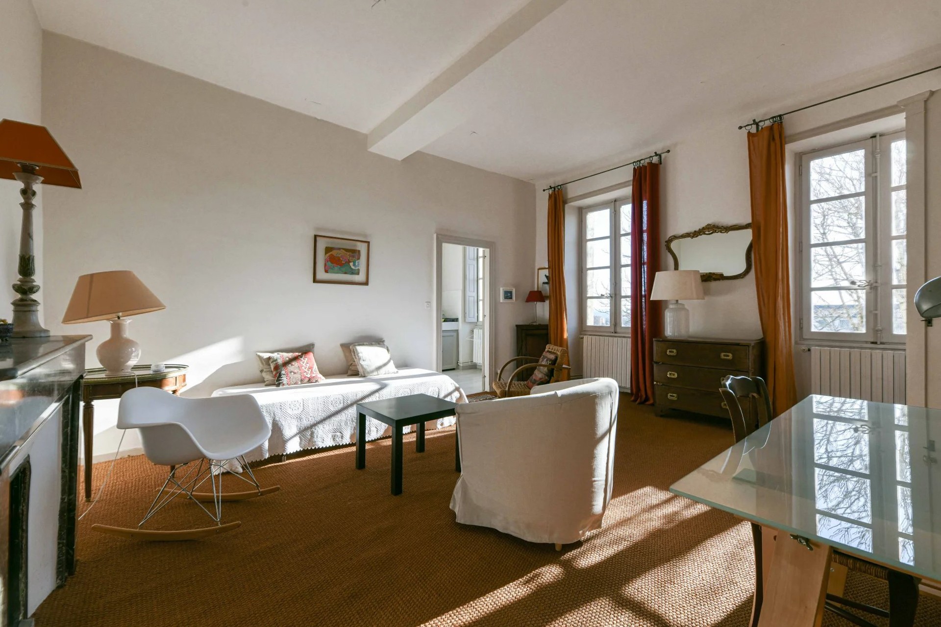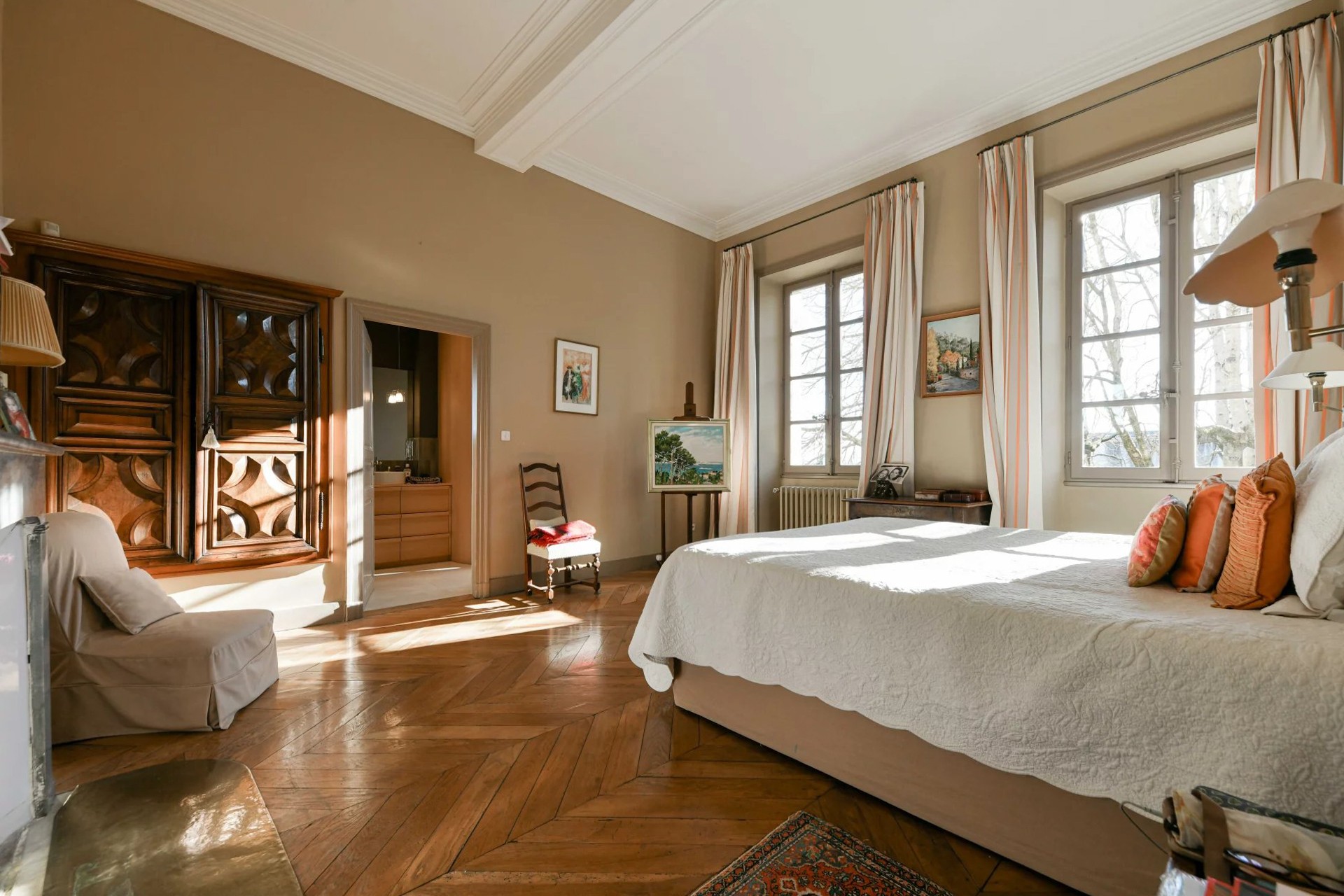 Returning to the ground floor, the main hall gives access to the first guest apartment of 72 m²: two bedrooms, a study and small kitchen. The wide quarter-turn staircase leads upstairs to the second guest apartment of 43 m², comprising entrance, kitchen/dining room, bedroom and bathroom.