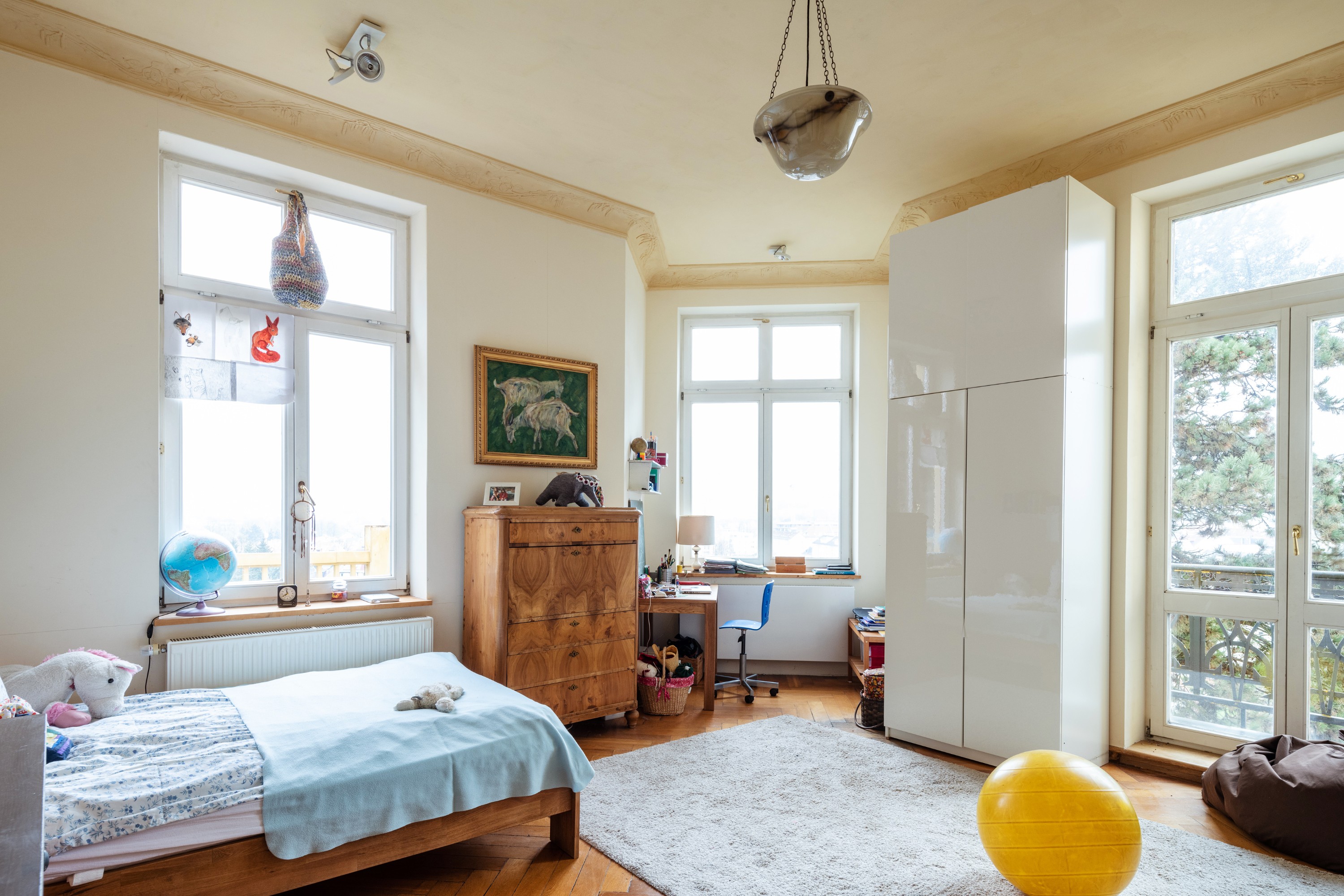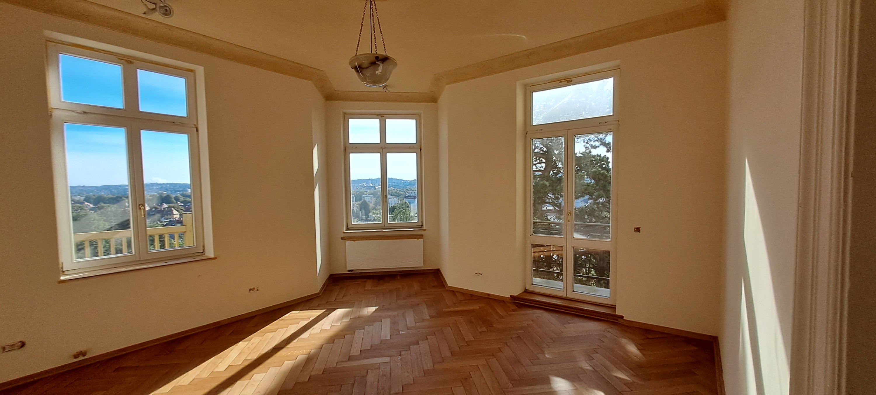 Doch nicht nur die Lage und die Außenfassade sind eindrucksvoll, sondern ebenso das Innere der Villa: hohe Decken, Eichenvollholzparkett sowie die Deckenstuckelemente und originalen Türen und Fenster machen den Charme der Wohnung aus.