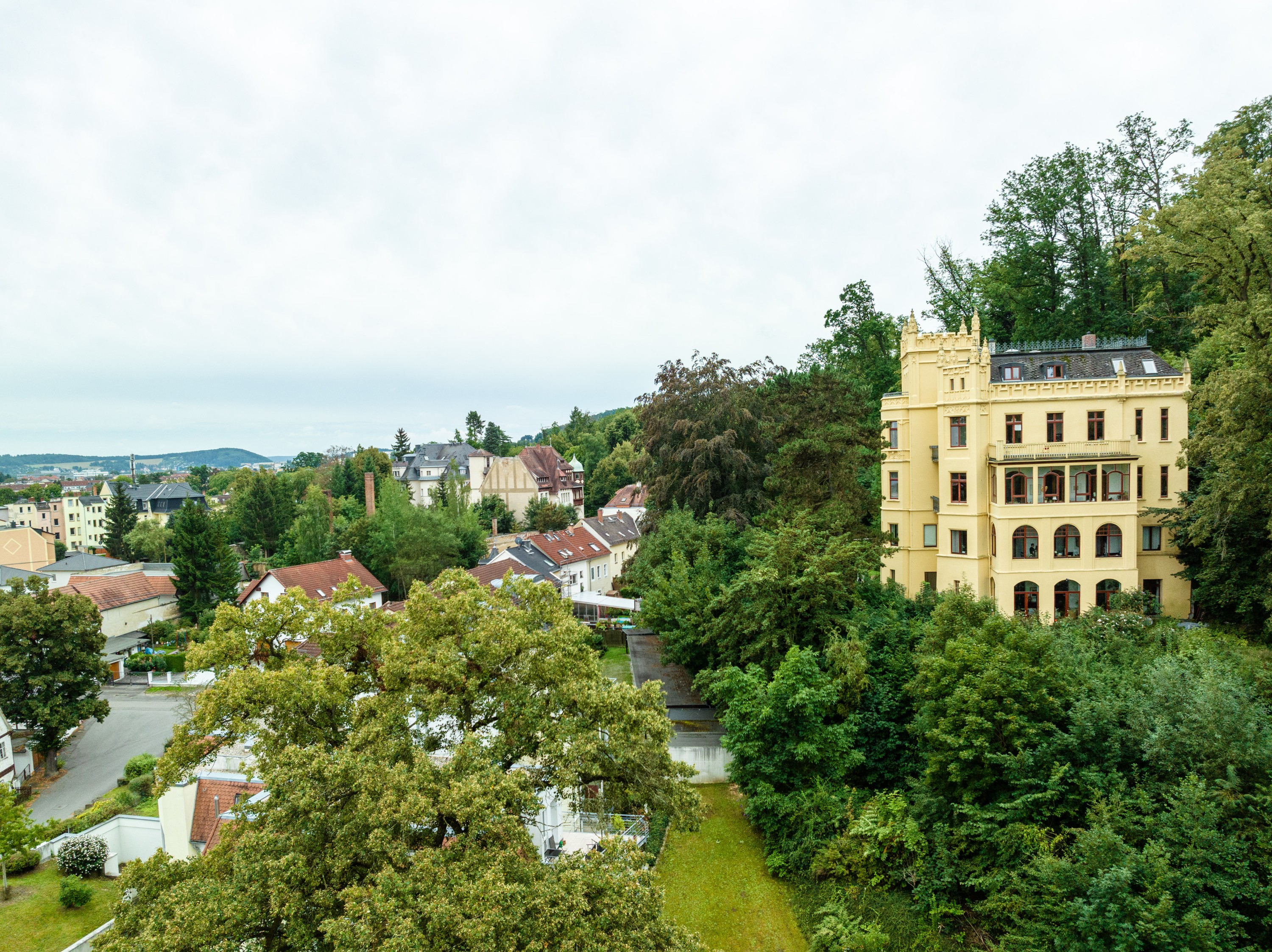 Die Villa Brehme, ein bedeutendes Einzeldenkmal aus den Jahren 1897 und 1910–15, zählt zu den markantesten historischen Gebäuden Geras. In exponierter Hanglage am Rand des Stadtwalds gelegen, bietet sie einen außergewöhnlichen Blick über die Stadt bis zum Rathaus sowie unmittelbare Nähe zu Natur und Erholung.