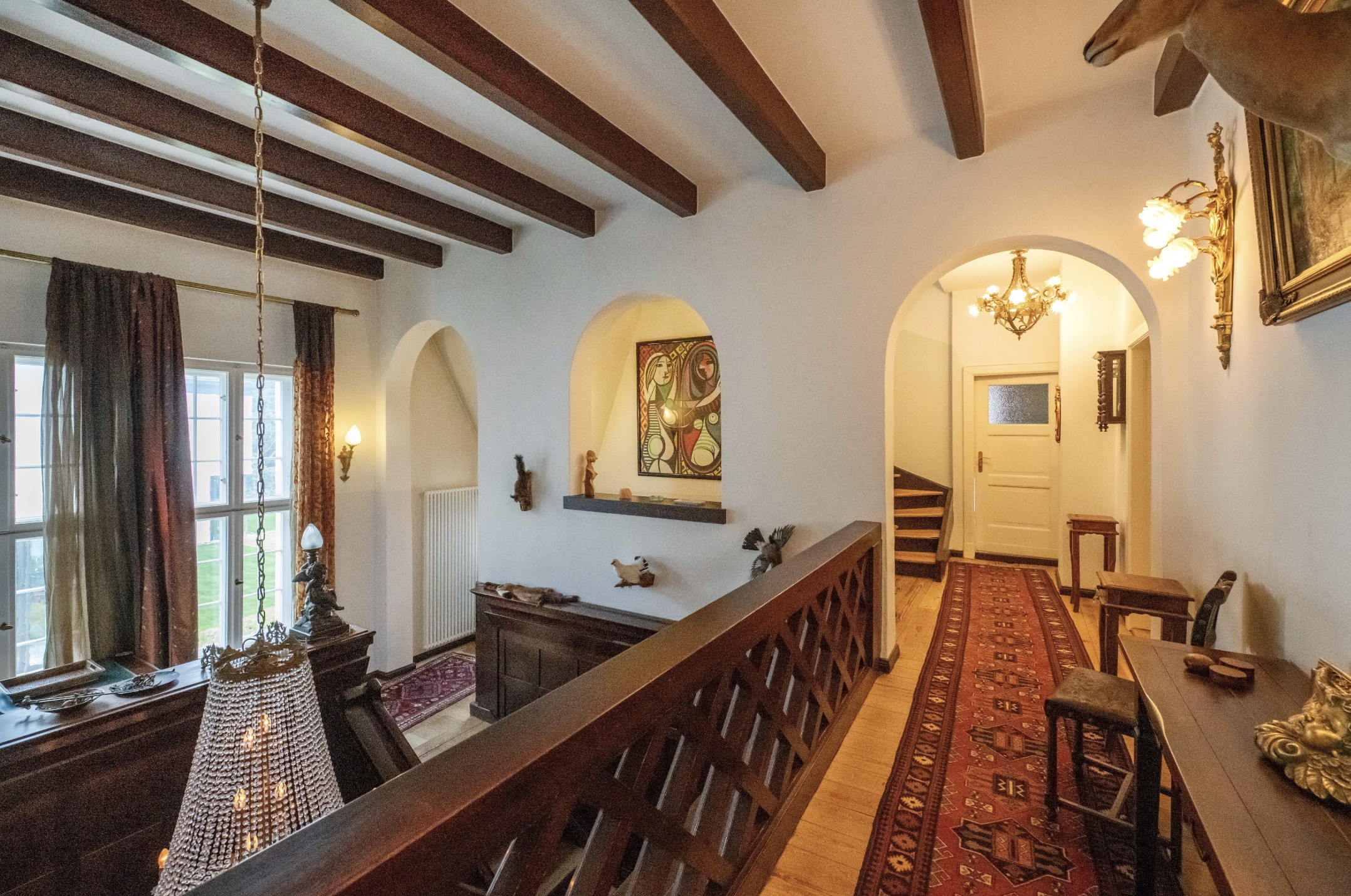 Extending to 563 m², the villa comprises 11 light-filled rooms—offering ample space for family, guests and bespoke living arrangements. The exposed timber framing speaks to a traditional craftsmanship that has become increasingly rare. Set within a park-like plot of 1,670 m², the garden reveals new aspects with every season.
