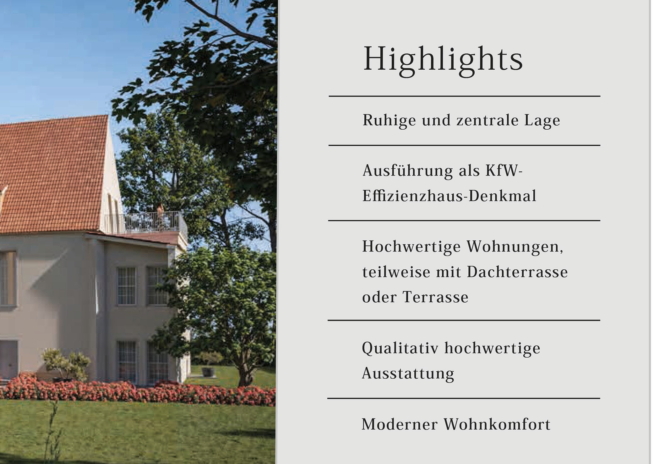 Construction start: Q2 2026. Completion: December 2027. Development according to KfW energy-efficient heritage building standards (energy-efficient renovation of a listed property).