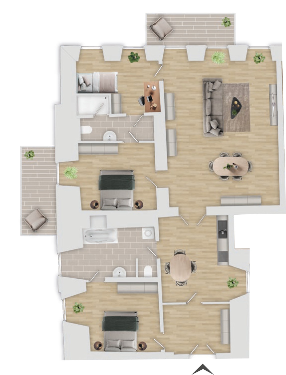 Features: solid oak parquet flooring, custom-designed wooden windows in keeping with the historic style, modern bathrooms, video intercom system, and a carbon-neutral building services concept.