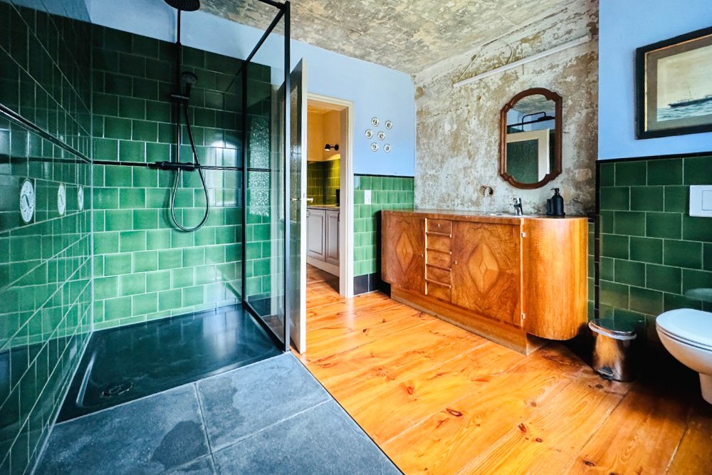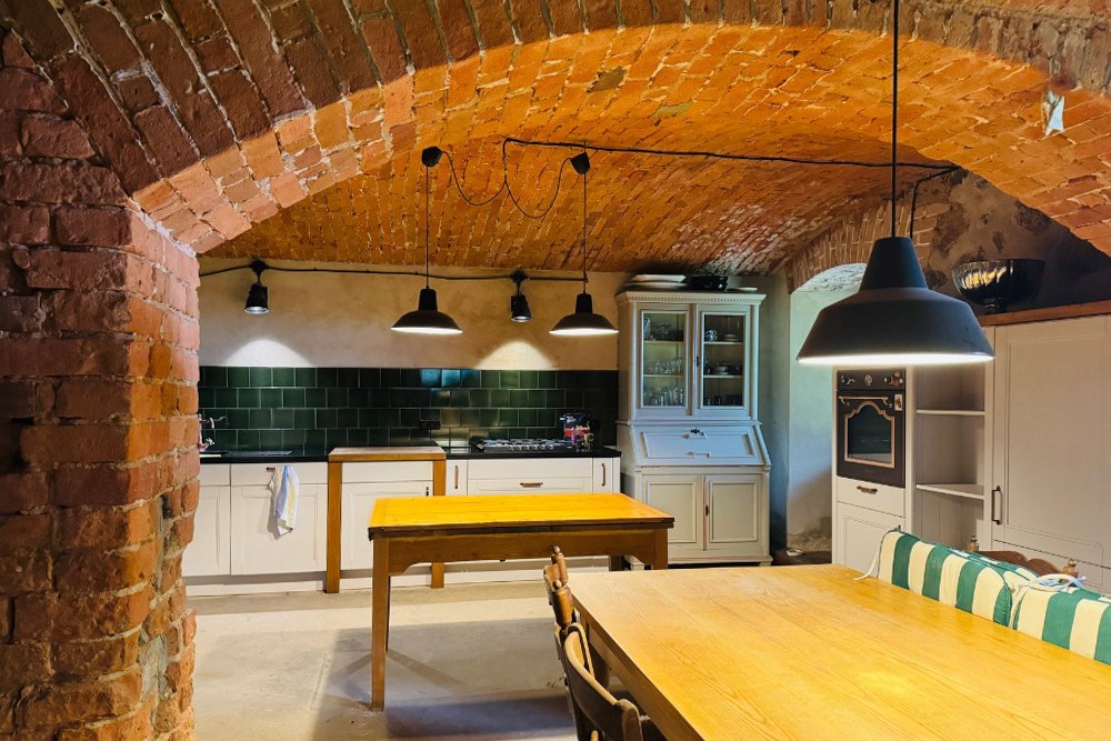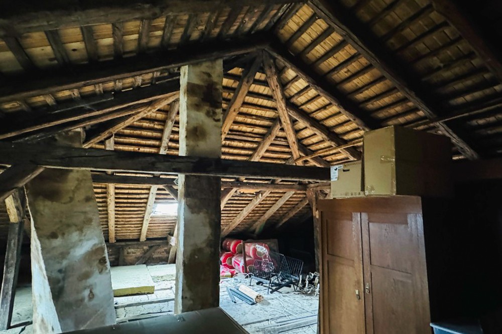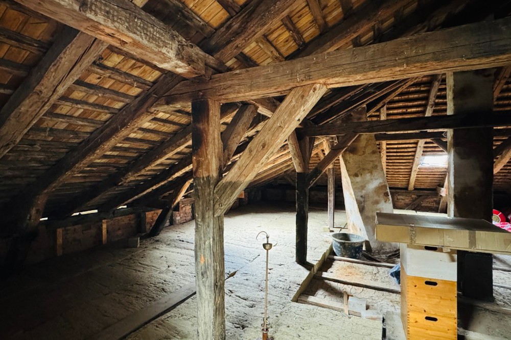 The half of the manor offered for sale reveals a carefully restored interior. The vaulted cellar houses the original manor kitchen with a cosy cast-iron stove. On the ground floor, a small guest apartment with private bathroom has been completed, alongside kitchen, dining area, and salon, which flow seamlessly onto an almost finished terrace. The first floor accommodates several bedrooms and a private guest suite, connected to the charming tower room currently used as a bedroom. This level also offers generous space for further expansion.