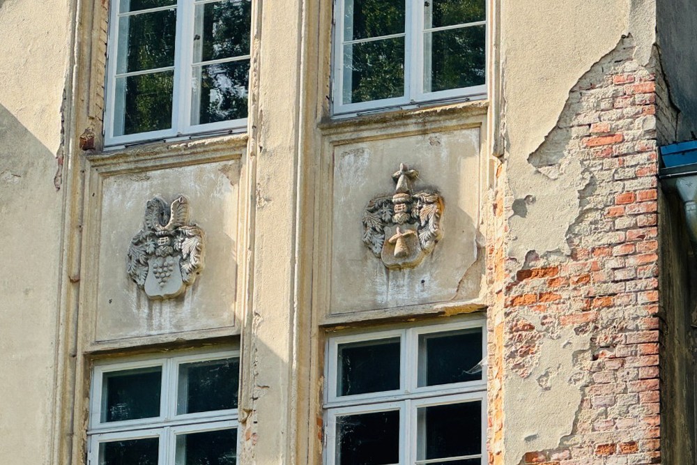 Beneath the rust-hued veil of centuries, the Kobrow Manor House still retains its historic presence. Built around 1860 in the neo-Gothic style, this two-storey stucco residence rises over a tall basement. A rectangular, three-storey tower with a pyramid roof and clock projects slightly off-centre along the façade, giving the building a distinctive silhouette. Above the main entrance, two coats of arms, those of the von Bülow and von Zeppelin families, reflect a varied ownership history from the 17th century to the post-1932 period.