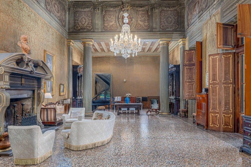 The villa comprises approximately 1,800 m² arranged over four levels. The piano nobile contains eight reception rooms with high ceilings, terraces, loggias, guest bathrooms and two bedrooms. The second floor has ten bedrooms, seven bathrooms and two salons. The third floor provides a further ten bedrooms with three bathrooms. Ground and semi-basement levels include two bedrooms, one bathroom, and service areas: kitchen, storerooms, wine cellars, wood storage, garage and ancillary spaces.