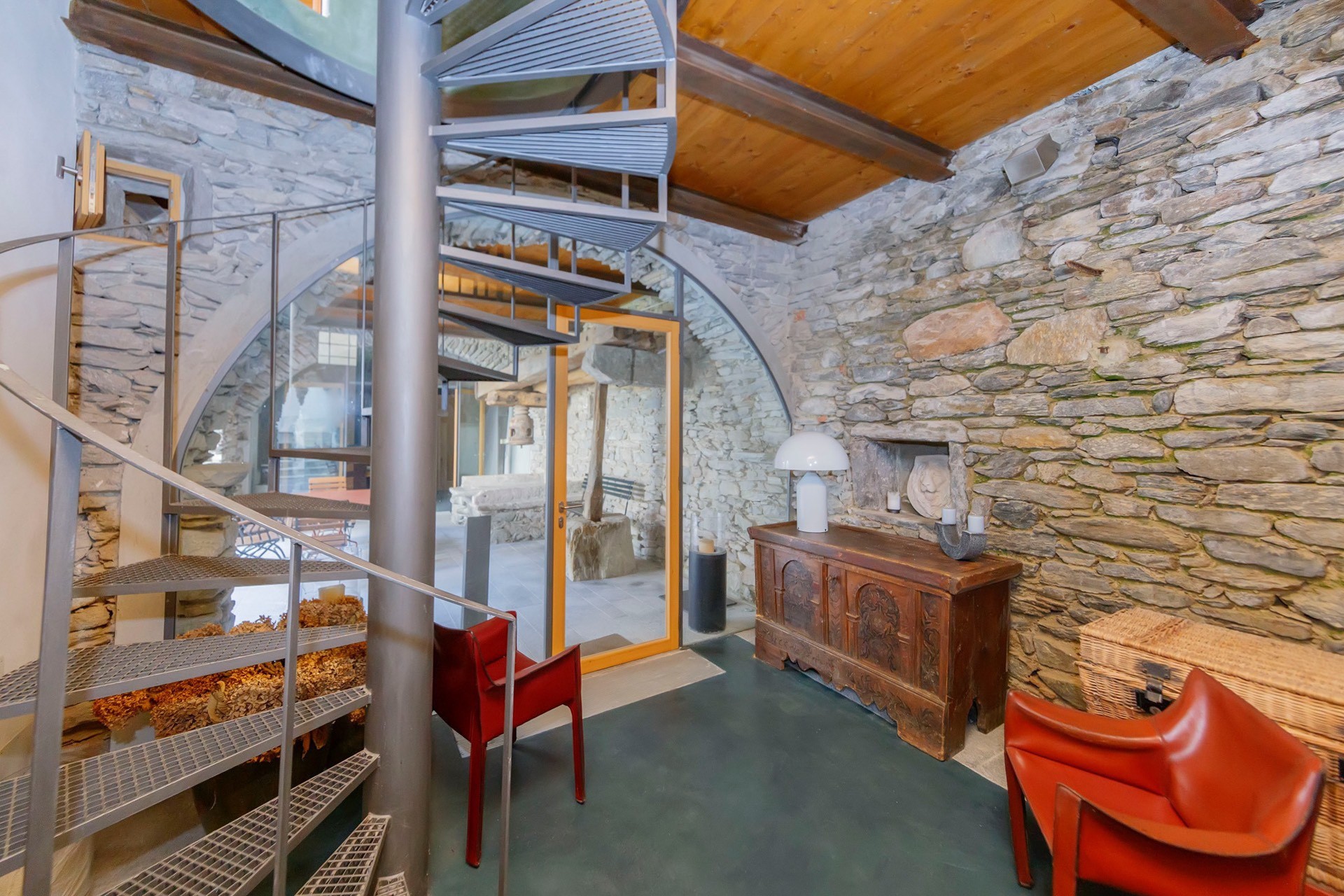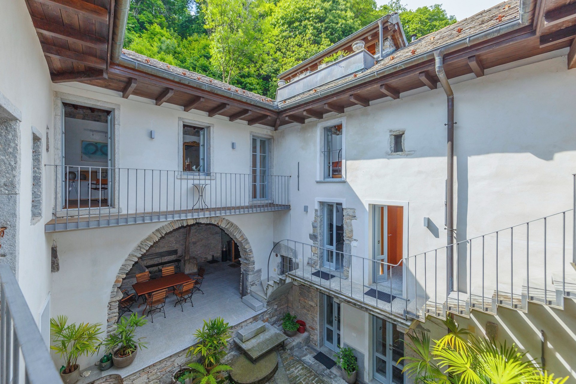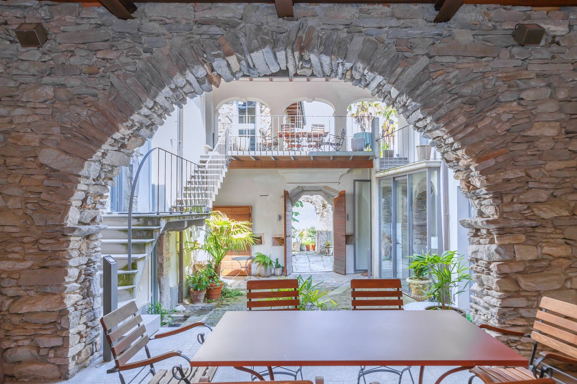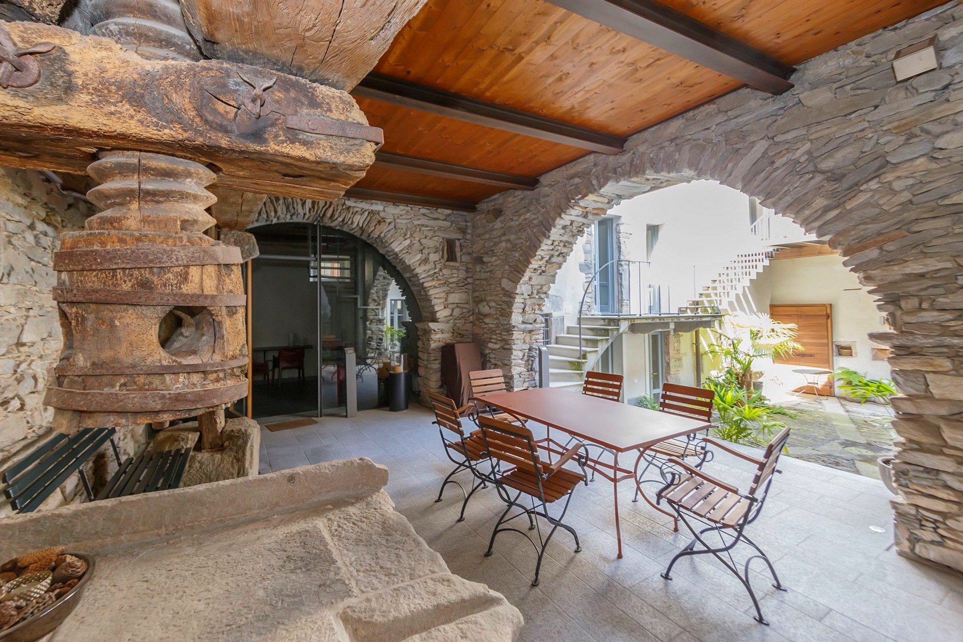 The stone arch courtyard, the wraparound first-floor gallery and the cantilevered timber beam ceilings with slate roofing are characteristic features of the vernacular architecture of the Lake Maggiore region. The conversion to residential use has been carried out with close attention to the historic fabric; contemporary interventions such as the glazed living area and access staircases have been kept deliberately understated. The covered courtyard serves as a private outdoor living area.