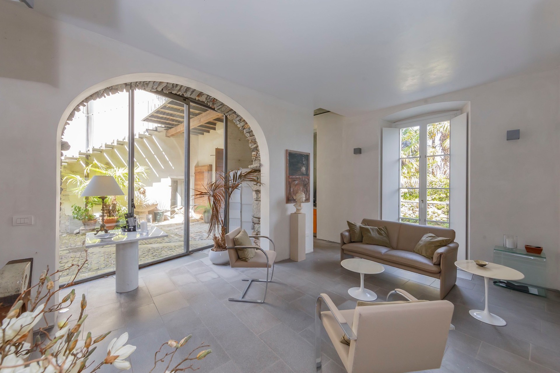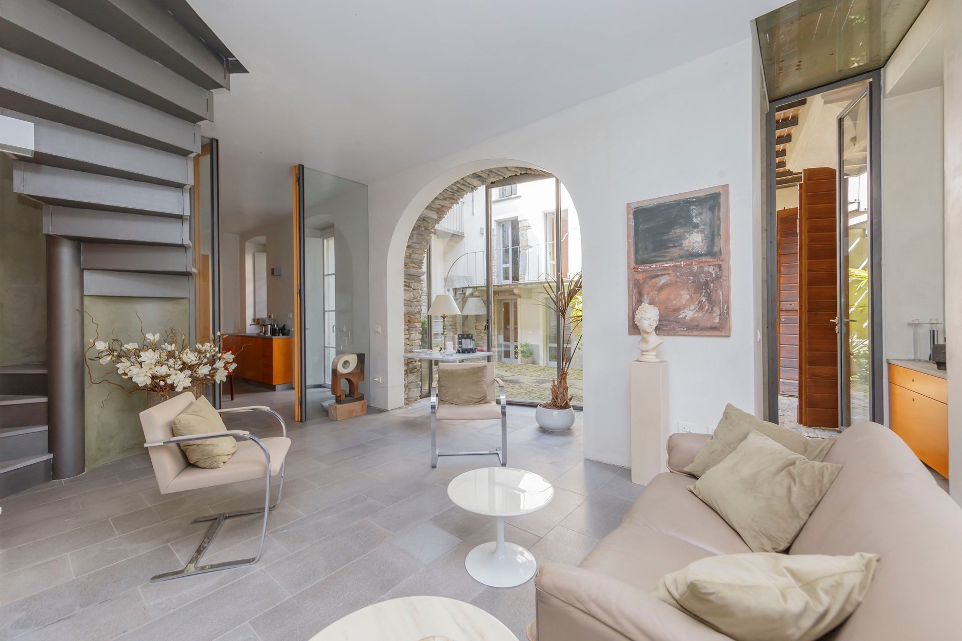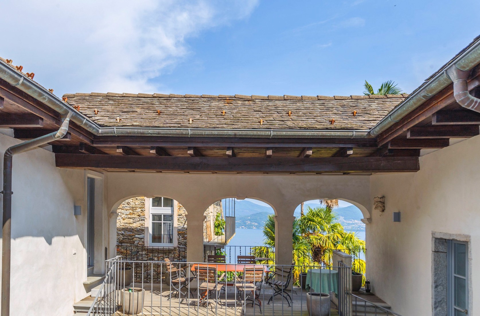 The stone arch courtyard, the wraparound first-floor gallery and the cantilevered timber beam ceilings with slate roofing are characteristic features of the vernacular architecture of the Lake Maggiore region. The conversion to residential use has been carried out with close attention to the historic fabric; contemporary interventions such as the glazed living area and access staircases have been kept deliberately understated. The covered courtyard serves as a private outdoor living area.