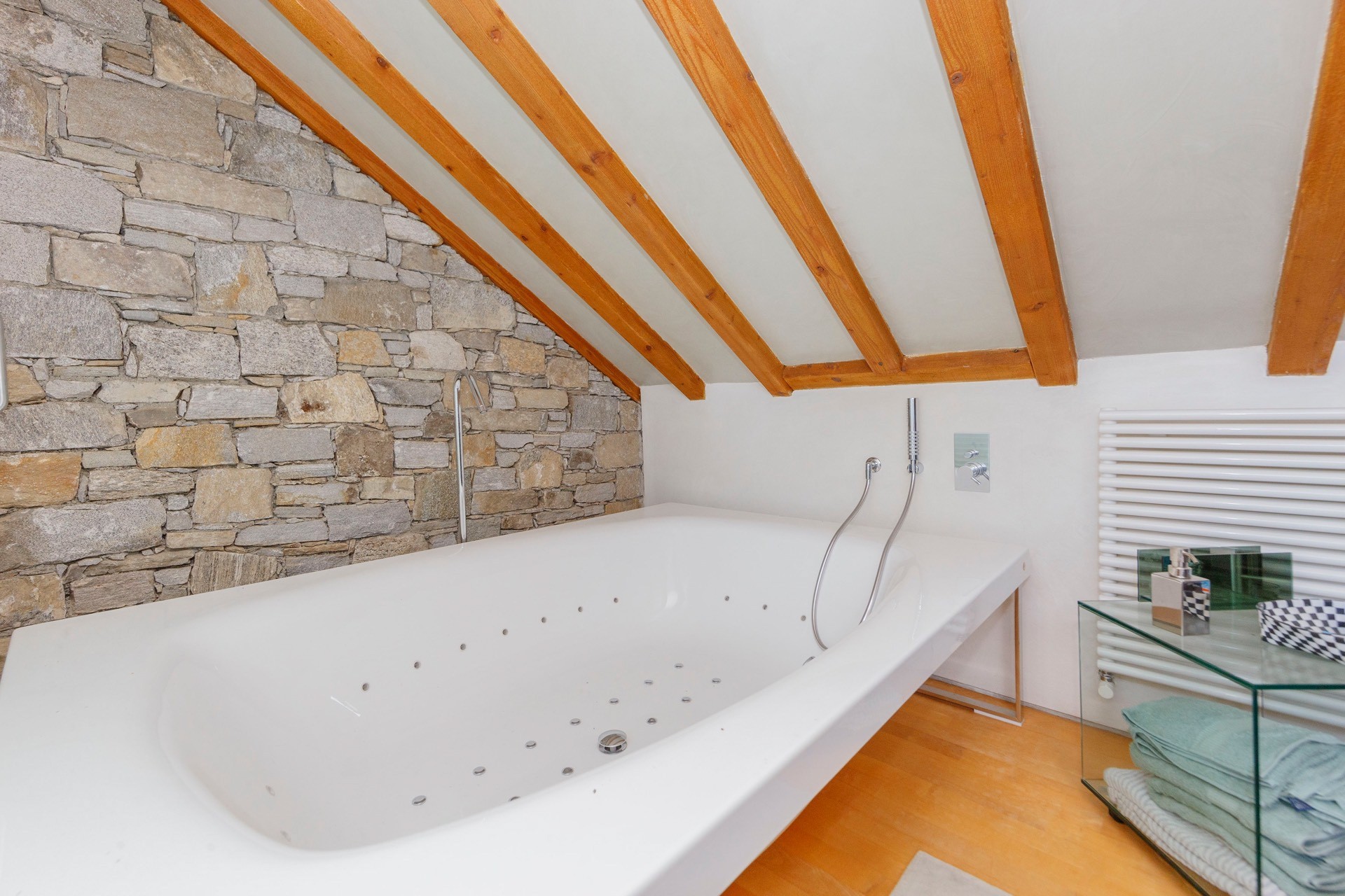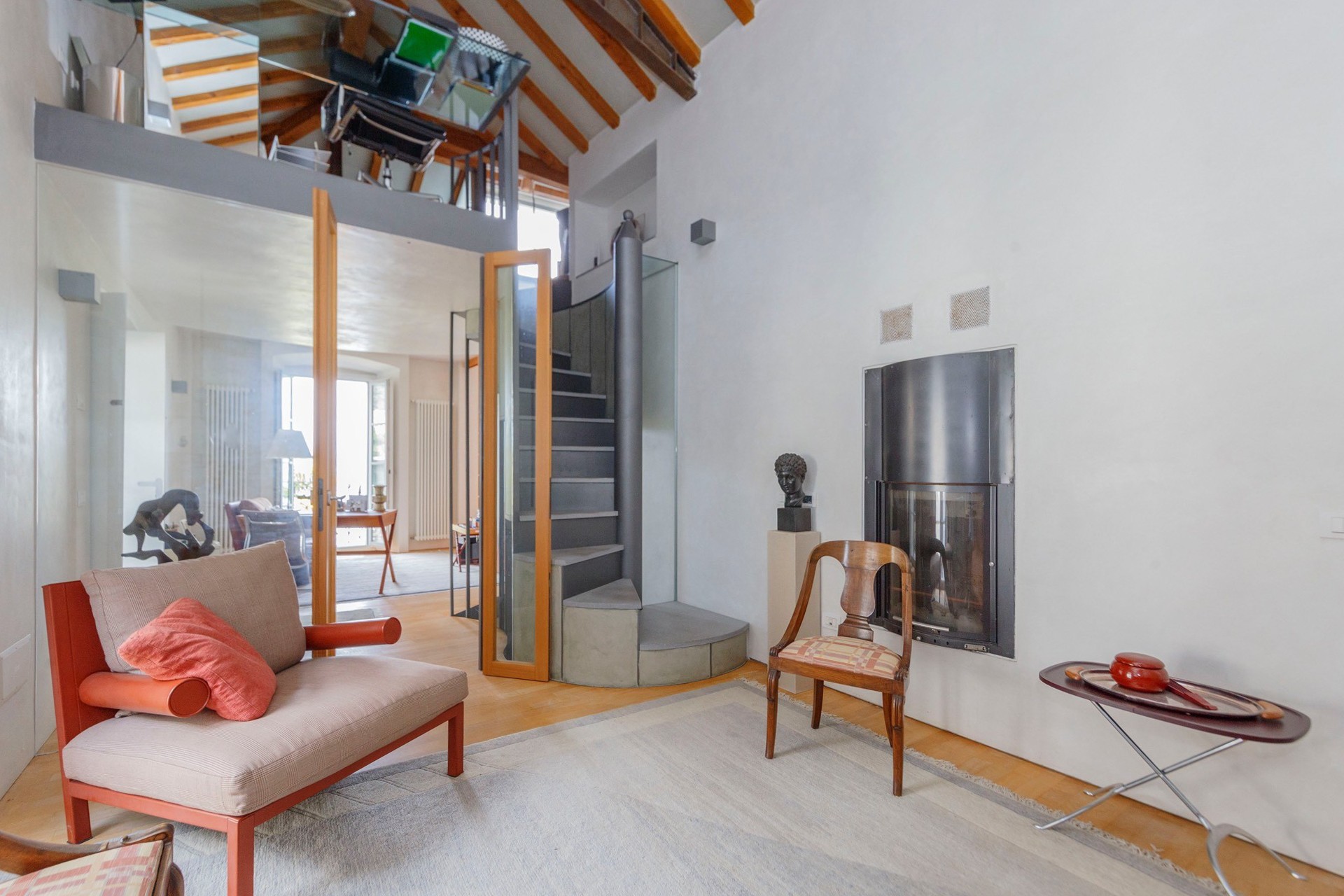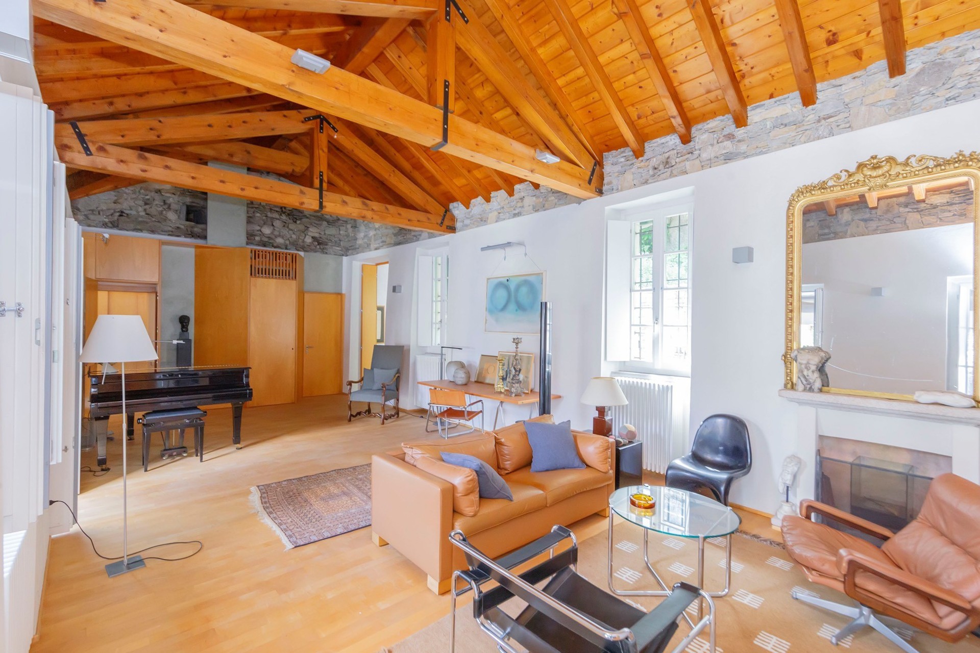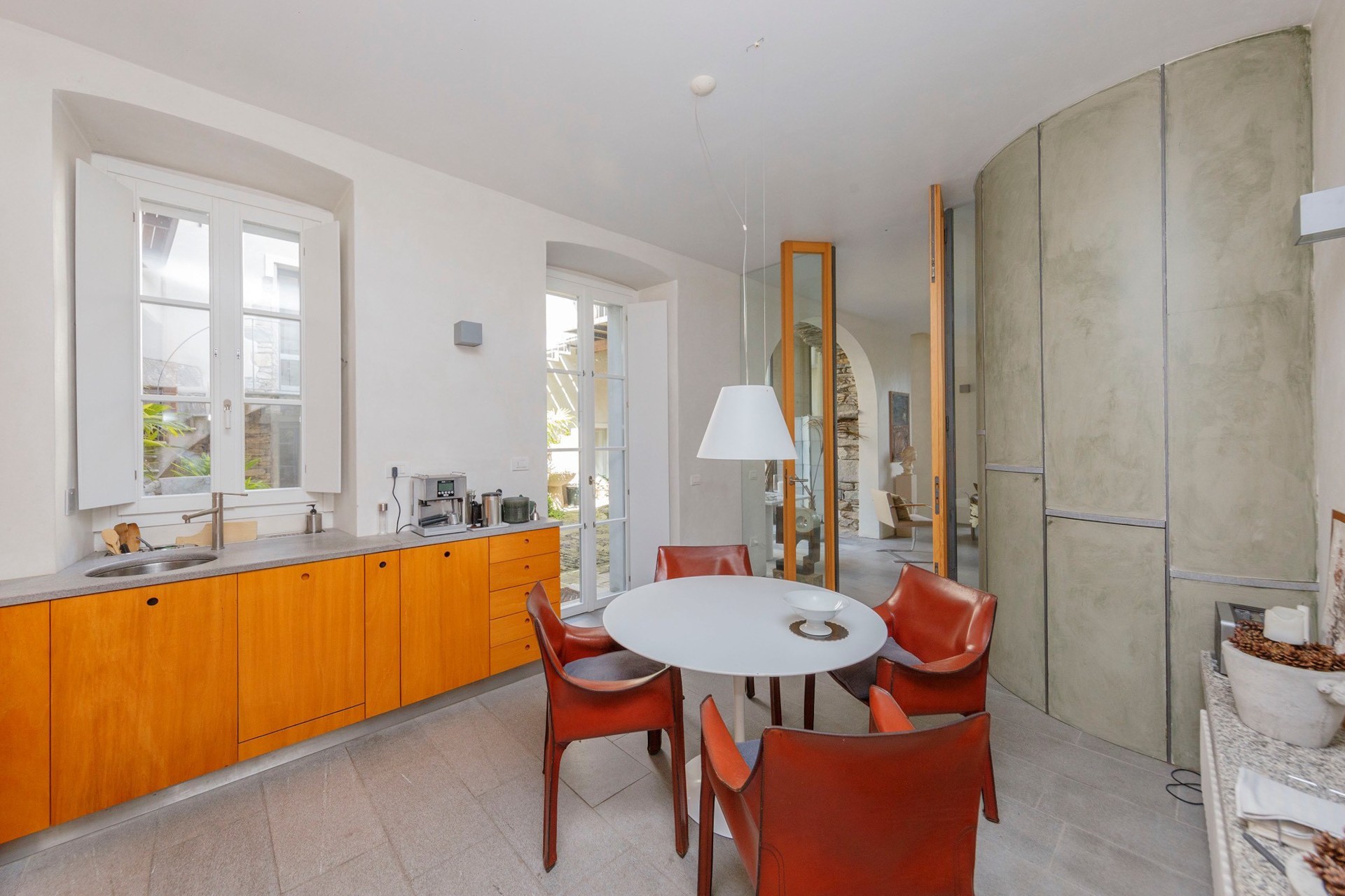 The stone arch courtyard, the wraparound first-floor gallery and the cantilevered timber beam ceilings with slate roofing are characteristic features of the vernacular architecture of the Lake Maggiore region. The conversion to residential use has been carried out with close attention to the historic fabric; contemporary interventions such as the glazed living area and access staircases have been kept deliberately understated. The covered courtyard serves as a private outdoor living area.
