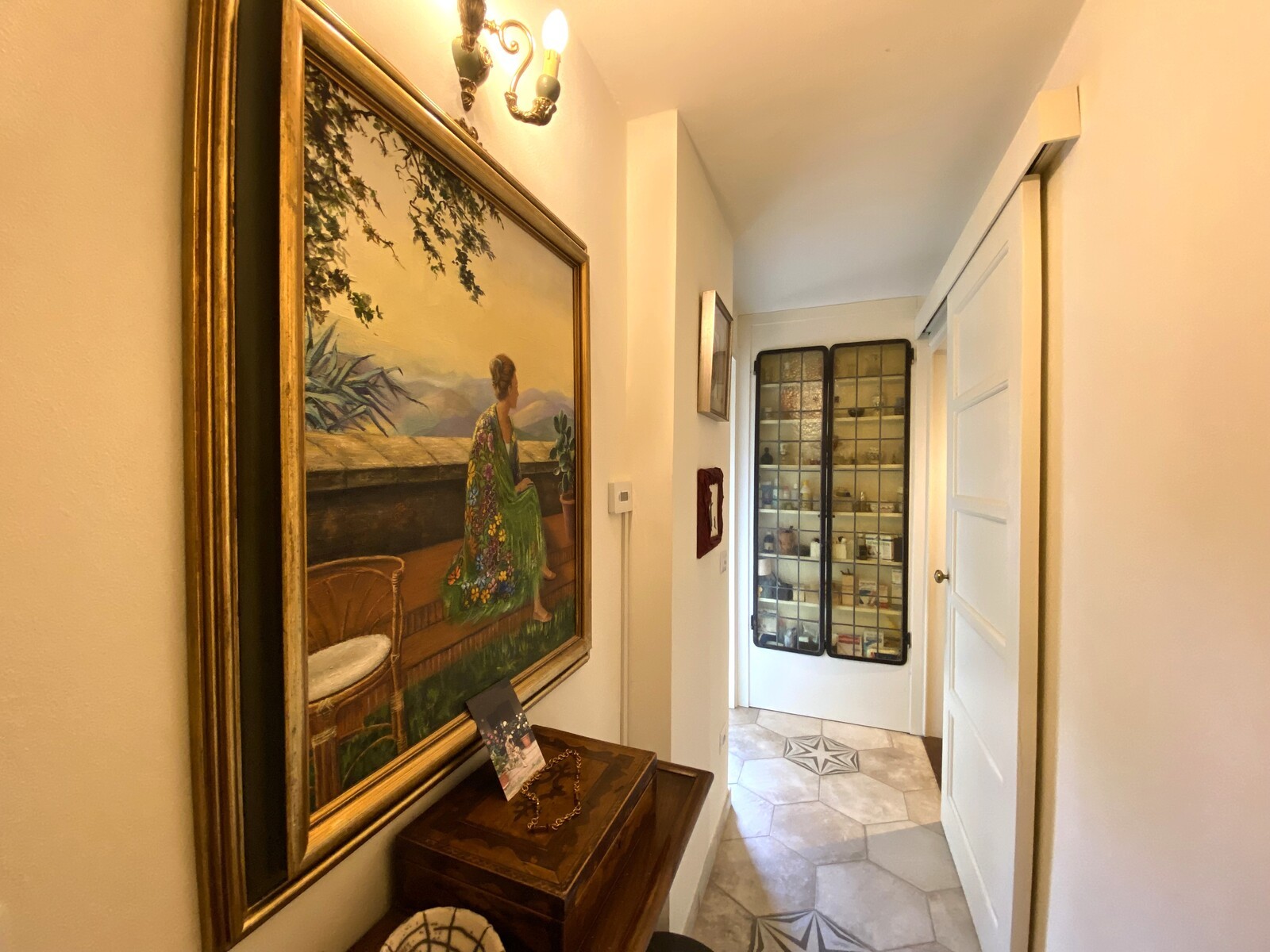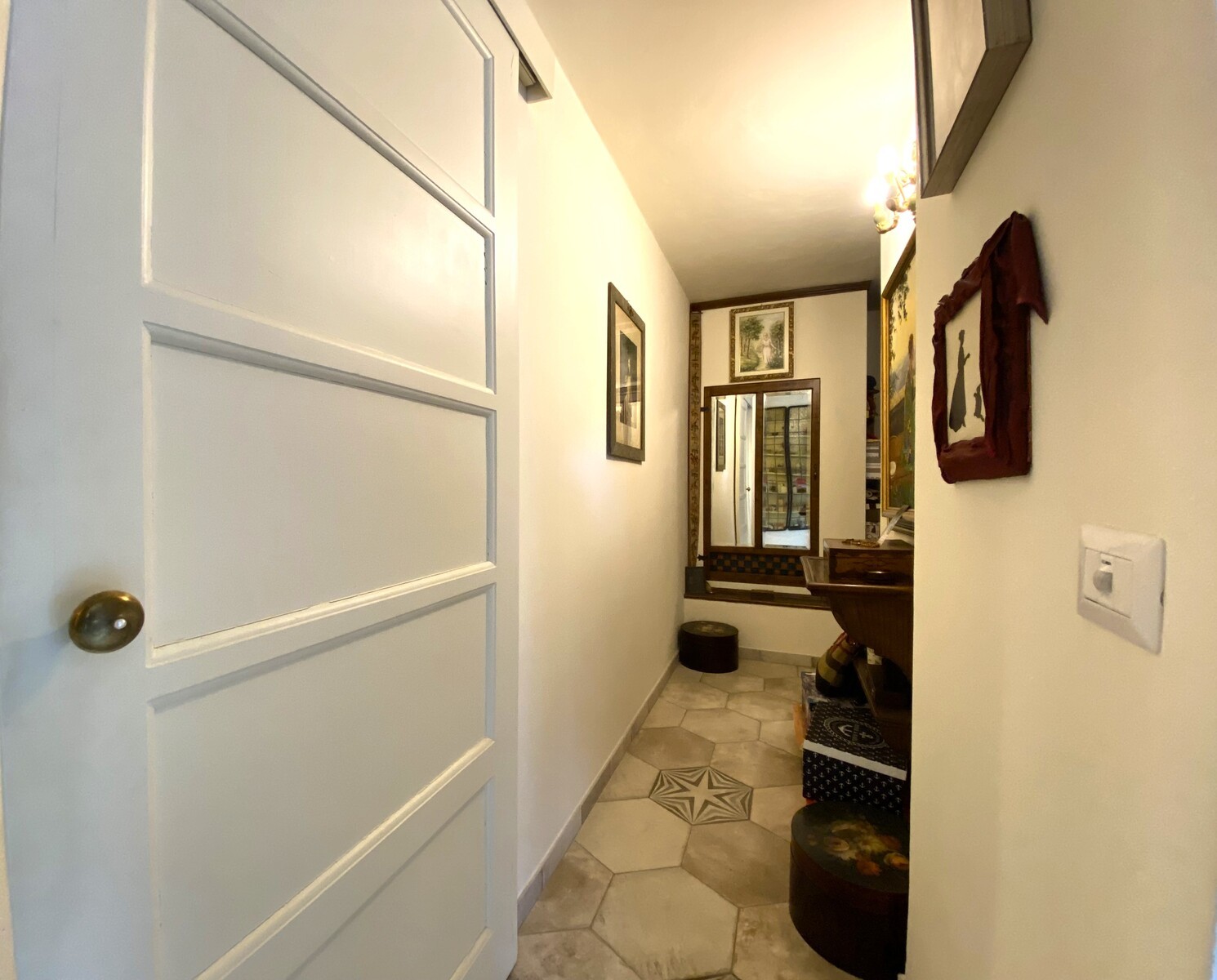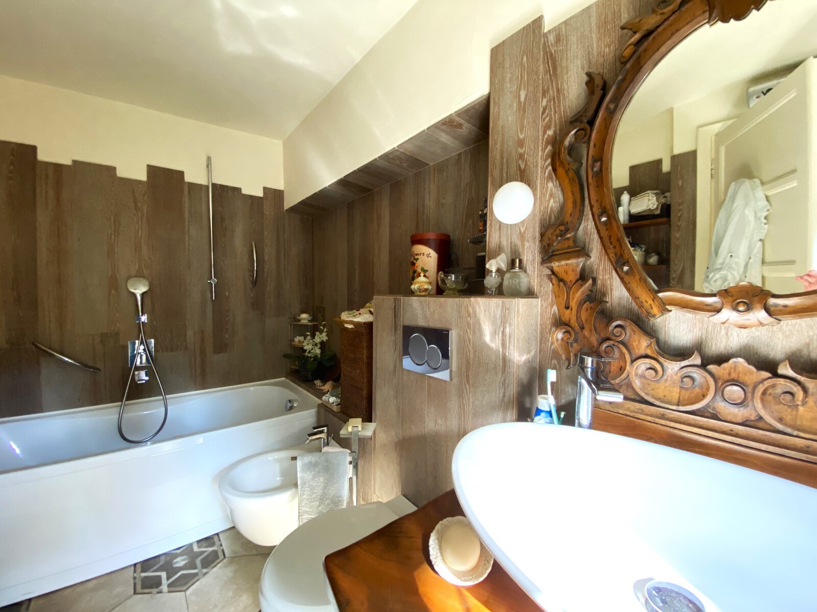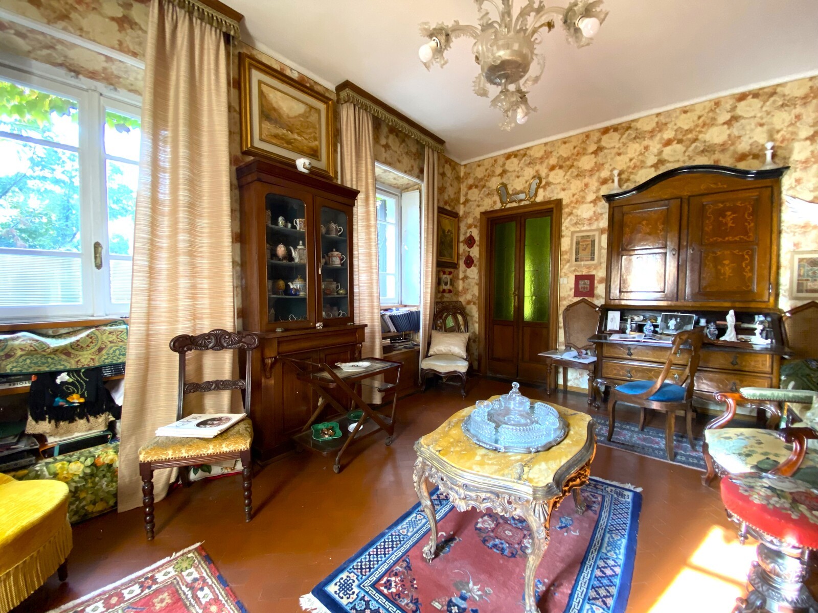 Notable features include original wooden double-glazed windows in Art Nouveau style, bespoke cabinetry, and fireplaces. The property is partly furnished and can easily be divided into three independent living units thanks to separate entrances. Heating is provided via an efficient gas system.