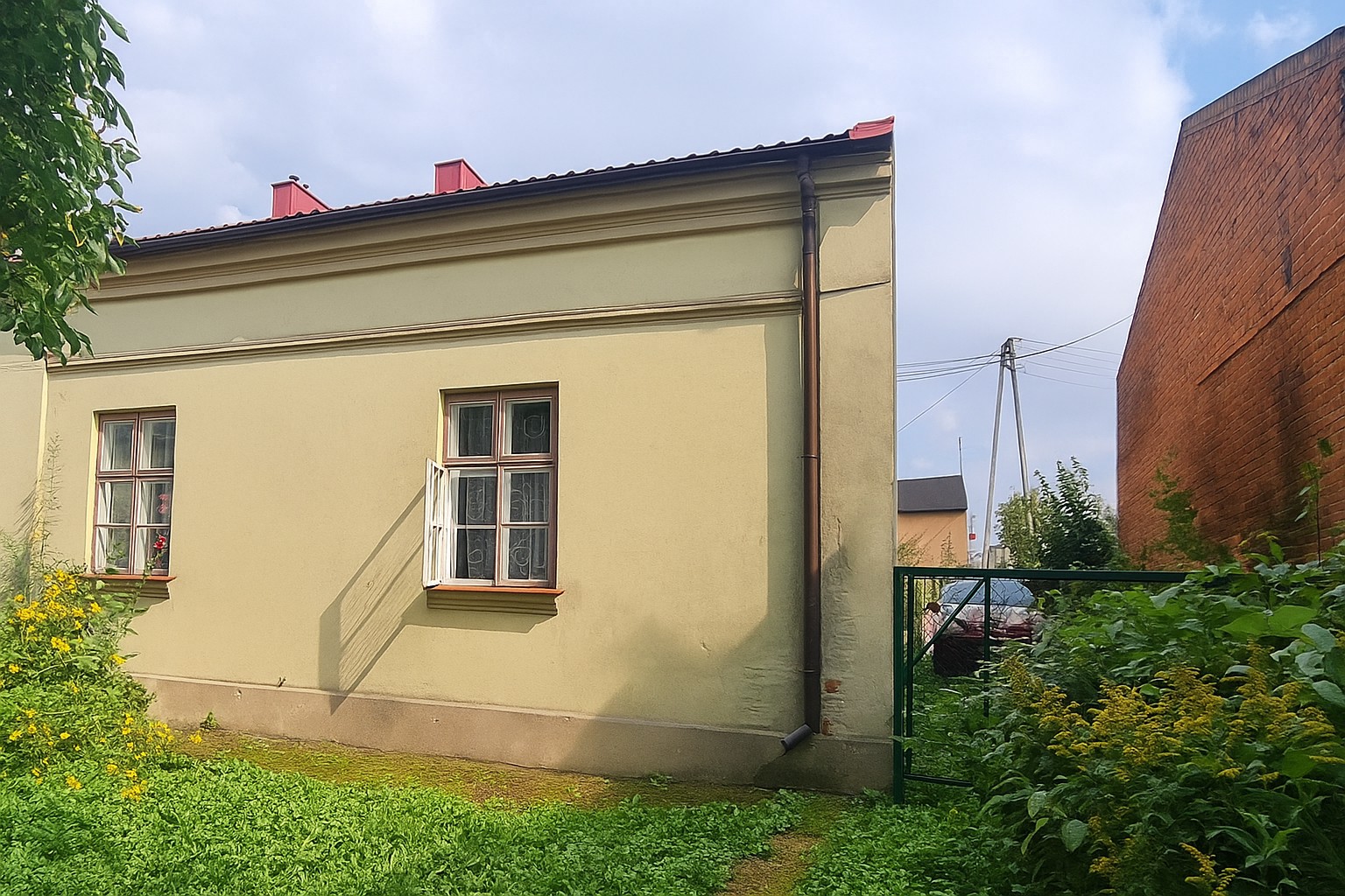 Built in 1920, the house was originally designed as a school with teacher housing. It is constructed of solid brick masonry with plastered and painted facades. Listed in the municipal register of historic buildings, it retains original details such as cornices, wooden staircases, and lofty 3.5-meter ceilings. The steep gable roof with wooden structure has already been renovated and is covered with sheet metal tiles.