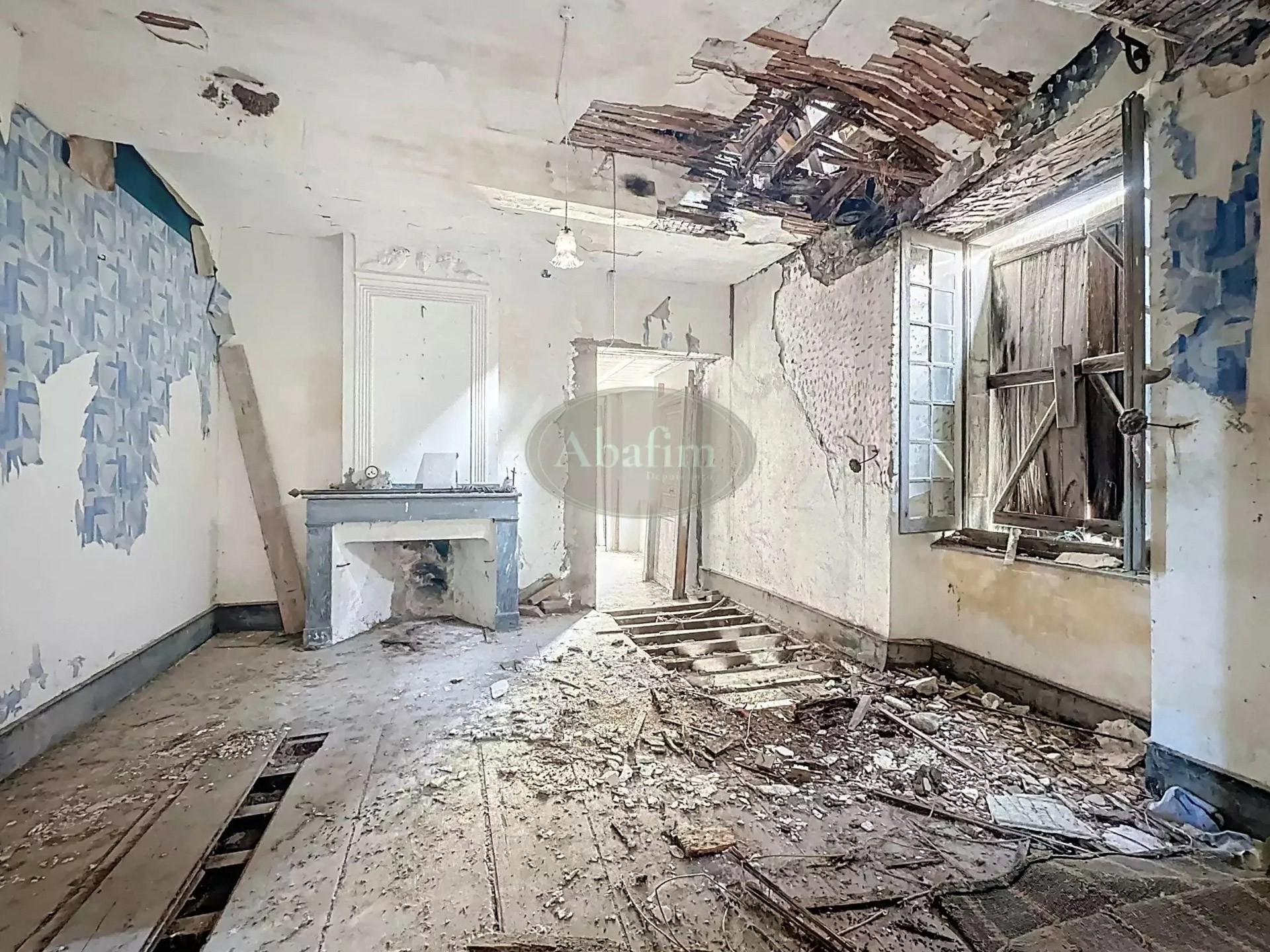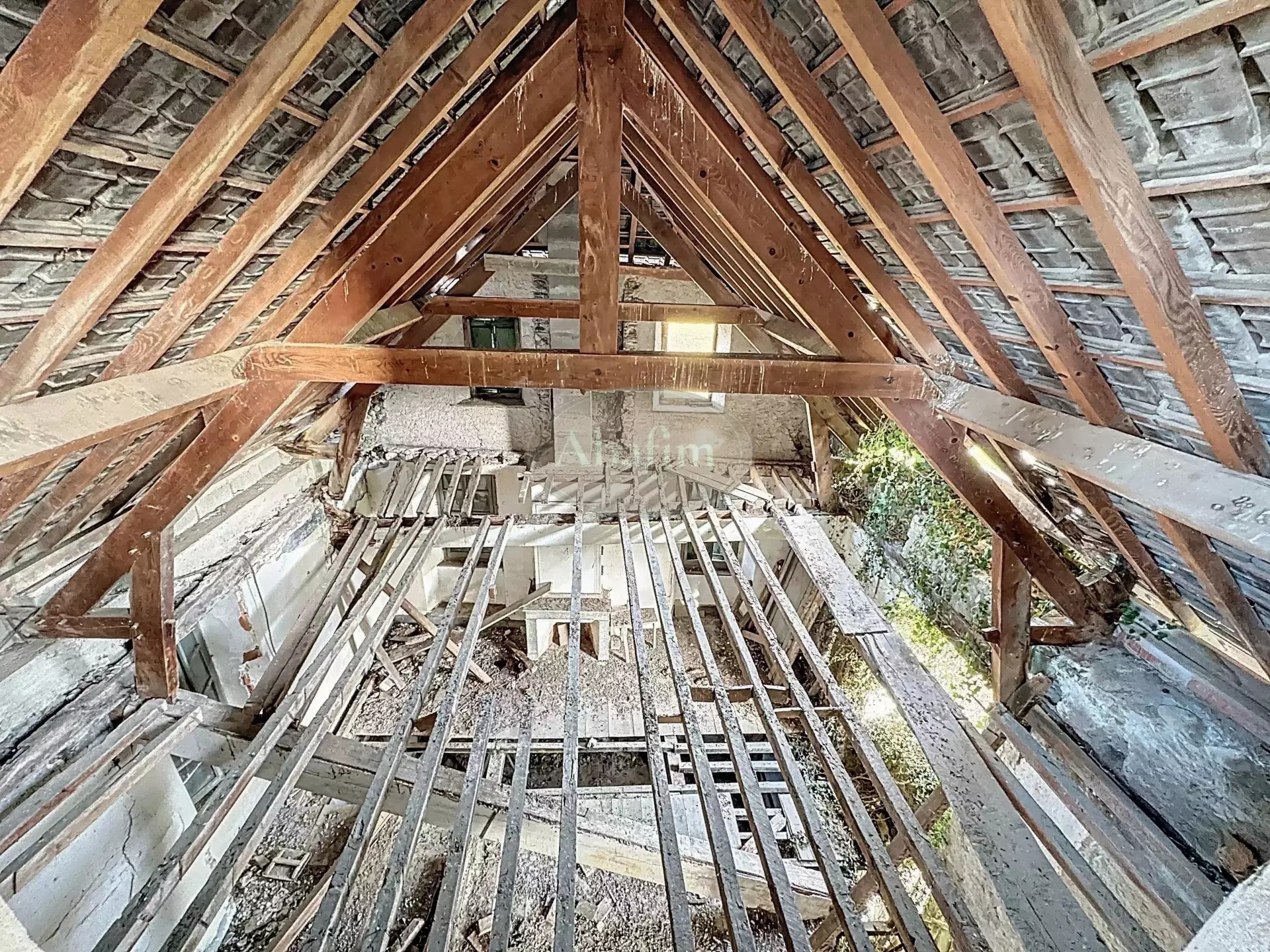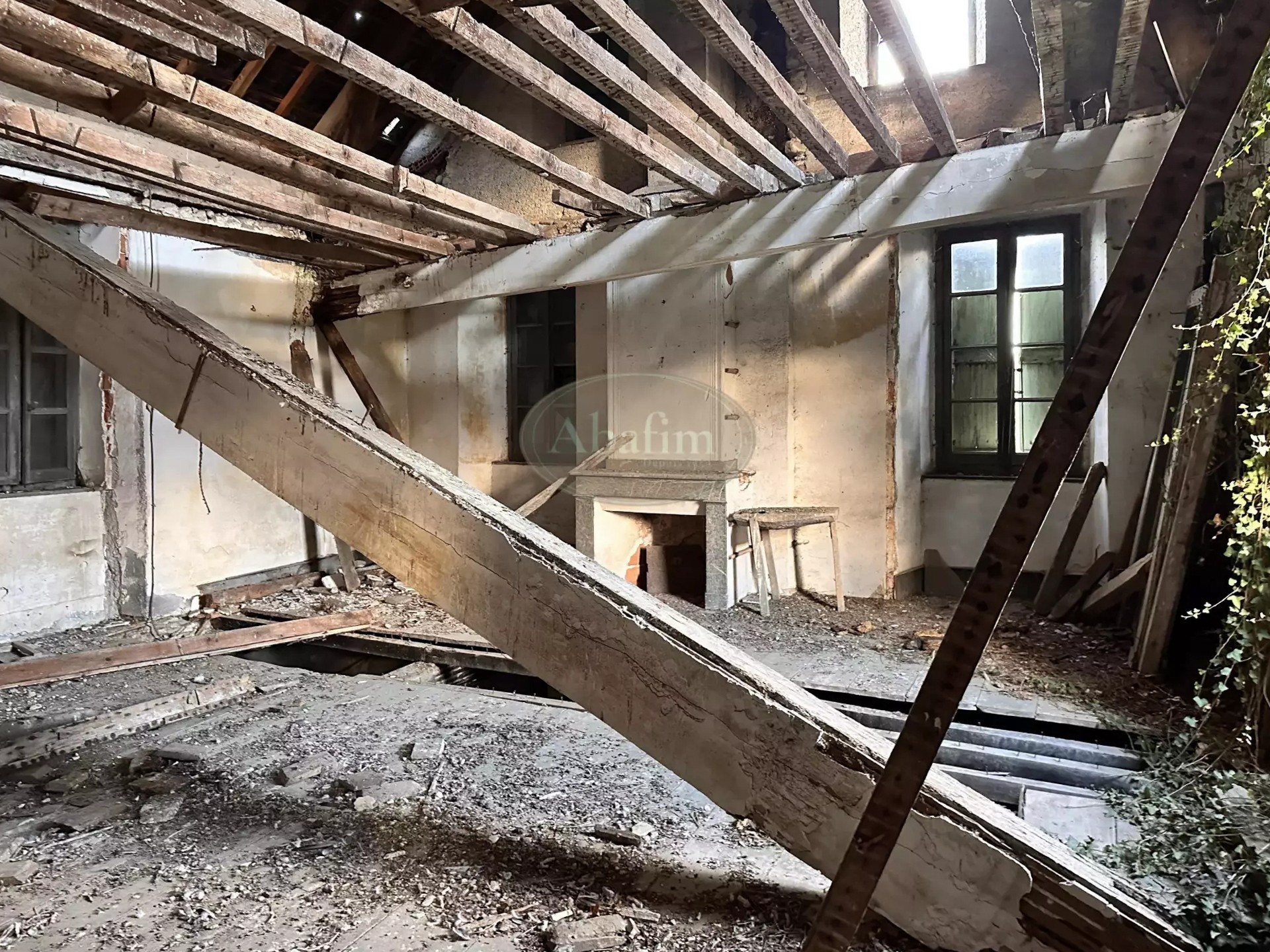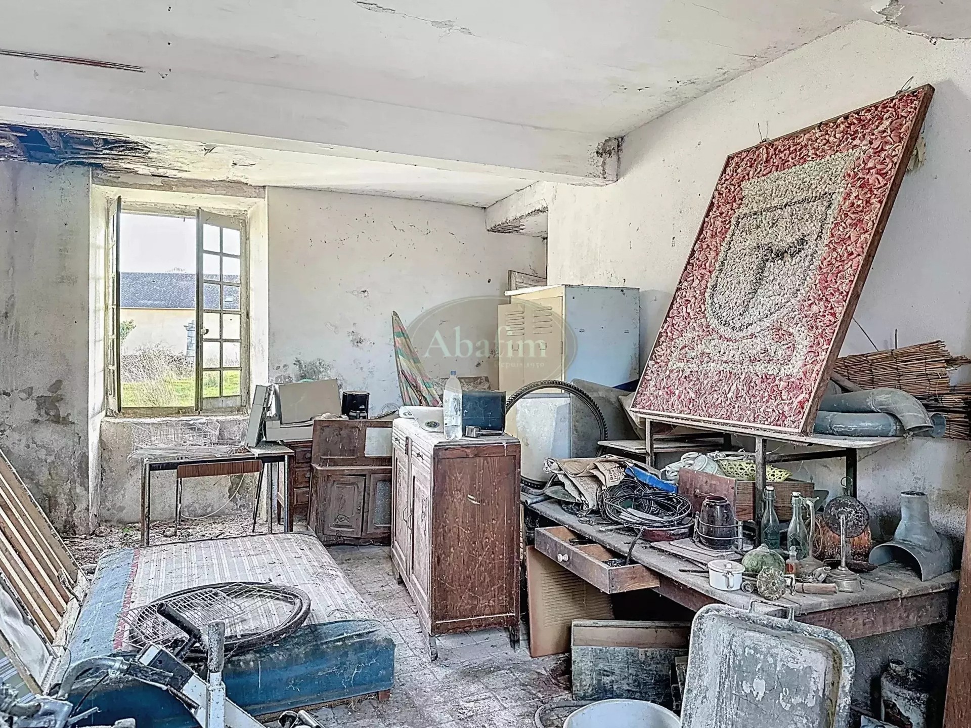 The tiled roof requires repair at the western end. Some windows and doors are missing or need replacement. Electricity and drinking water are connected, but the property still needs to be linked to the municipal sewer system.
