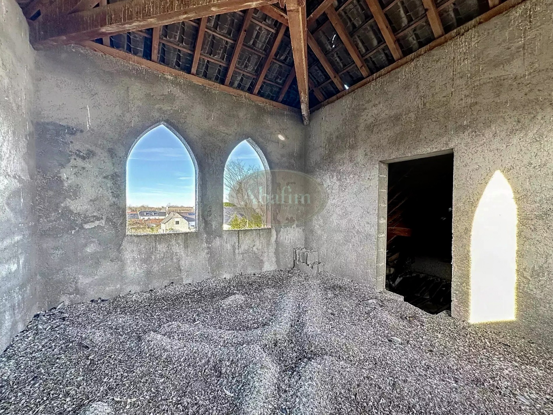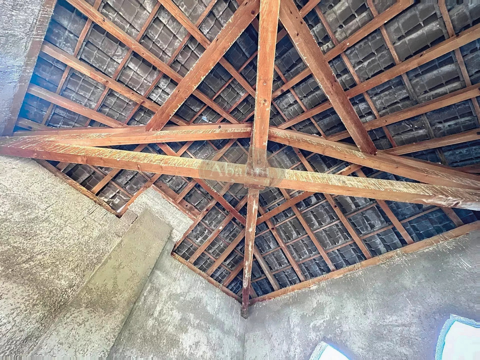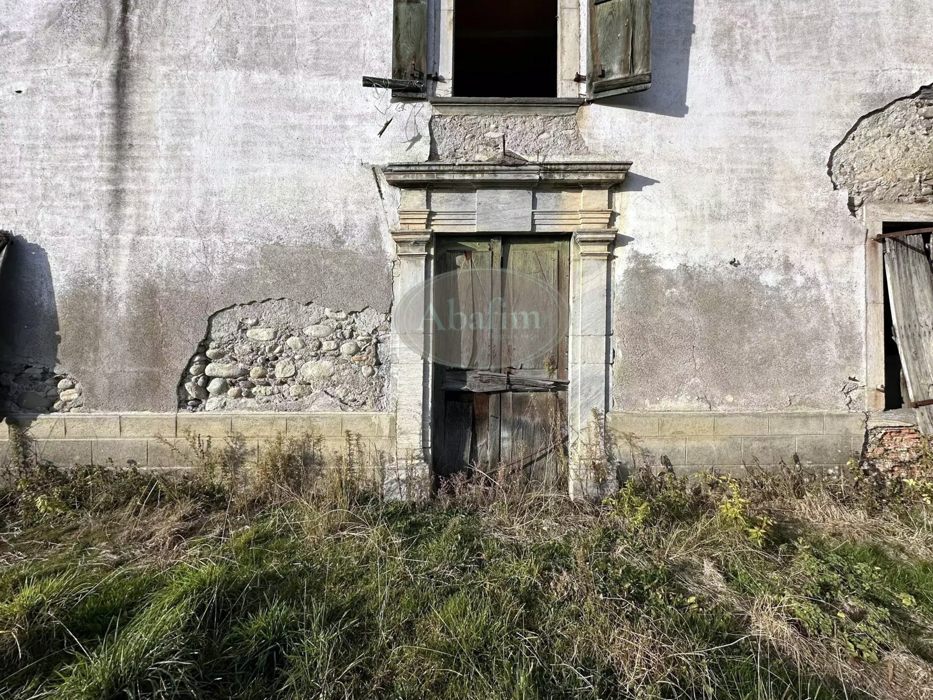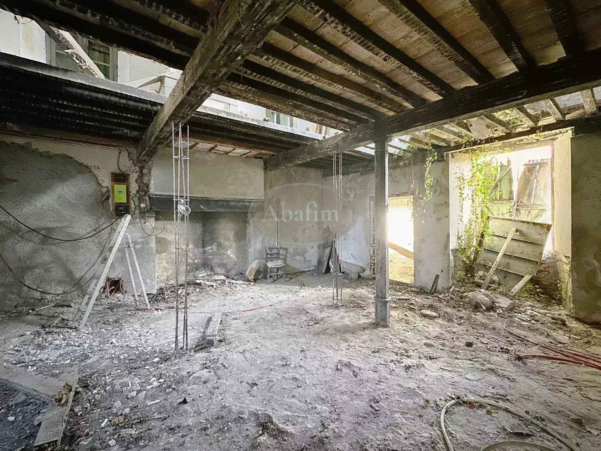 The tiled roof requires repair at the western end. Some windows and doors are missing or need replacement. Electricity and drinking water are connected, but the property still needs to be linked to the municipal sewer system.