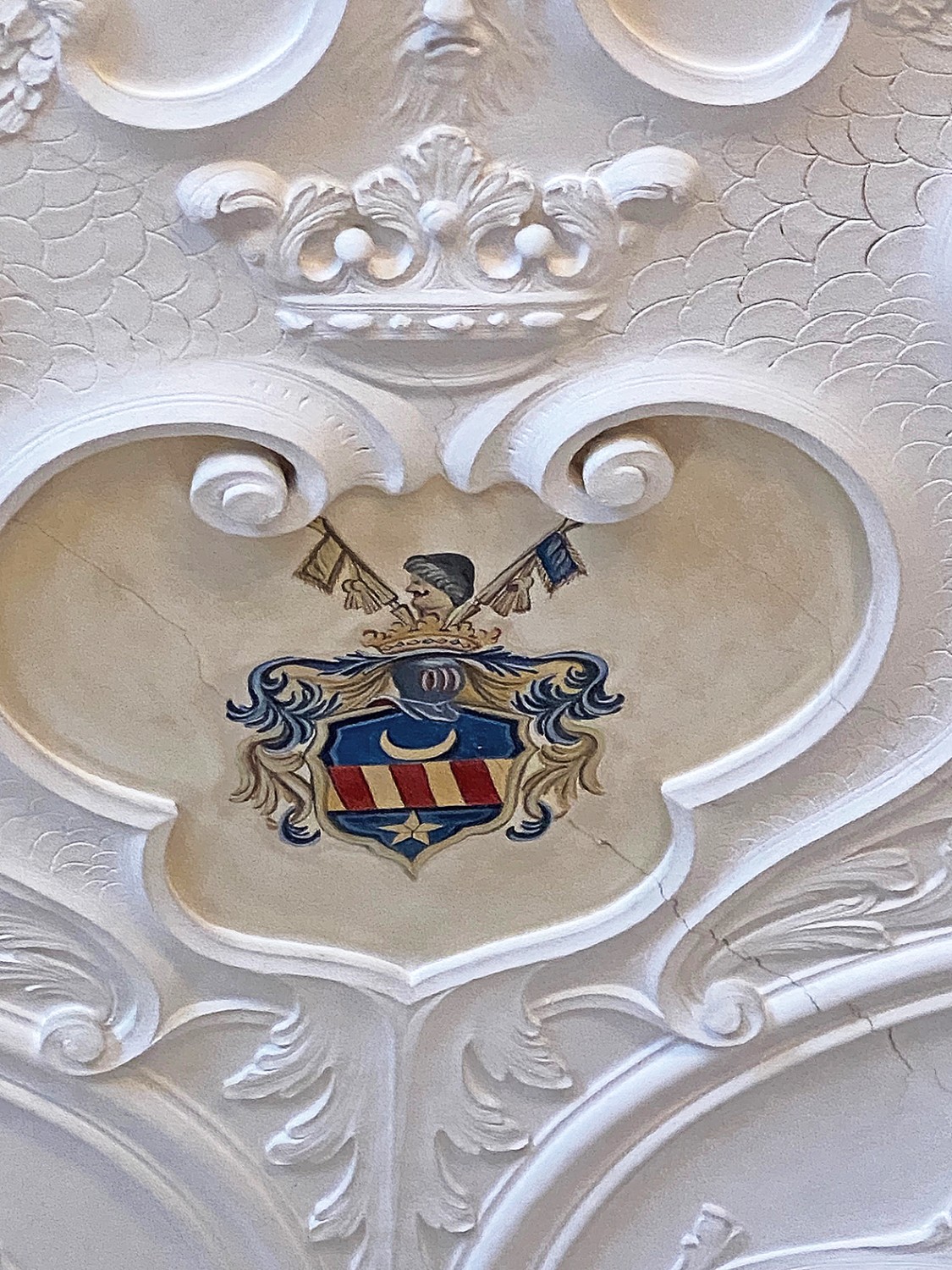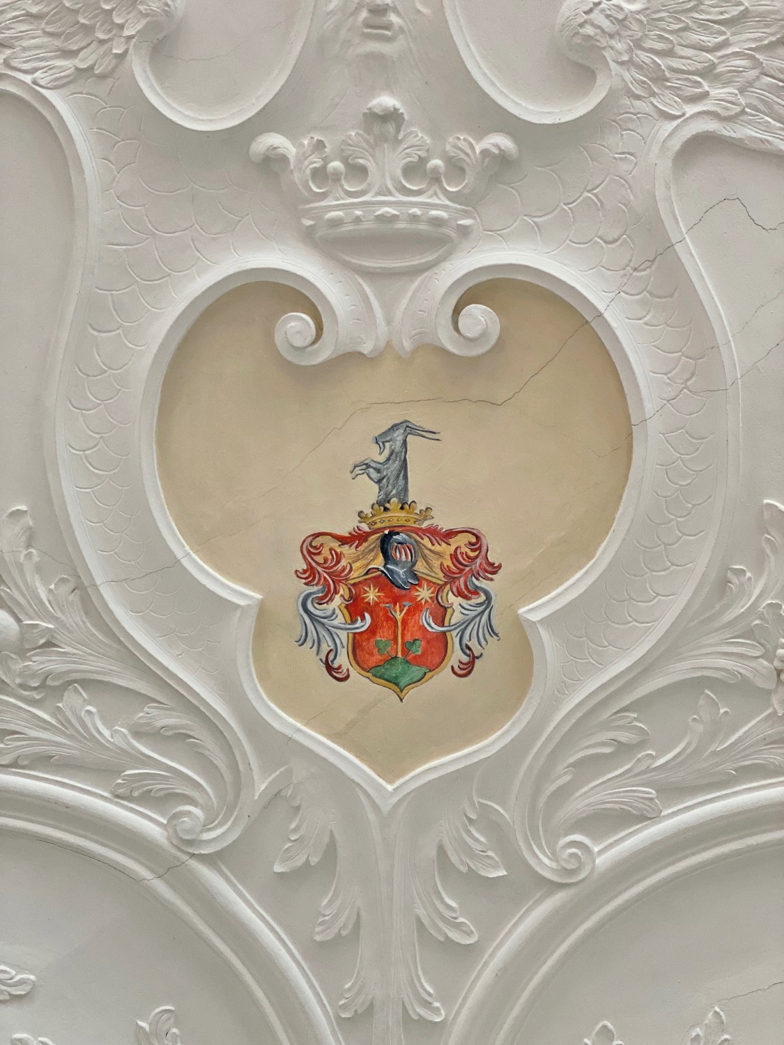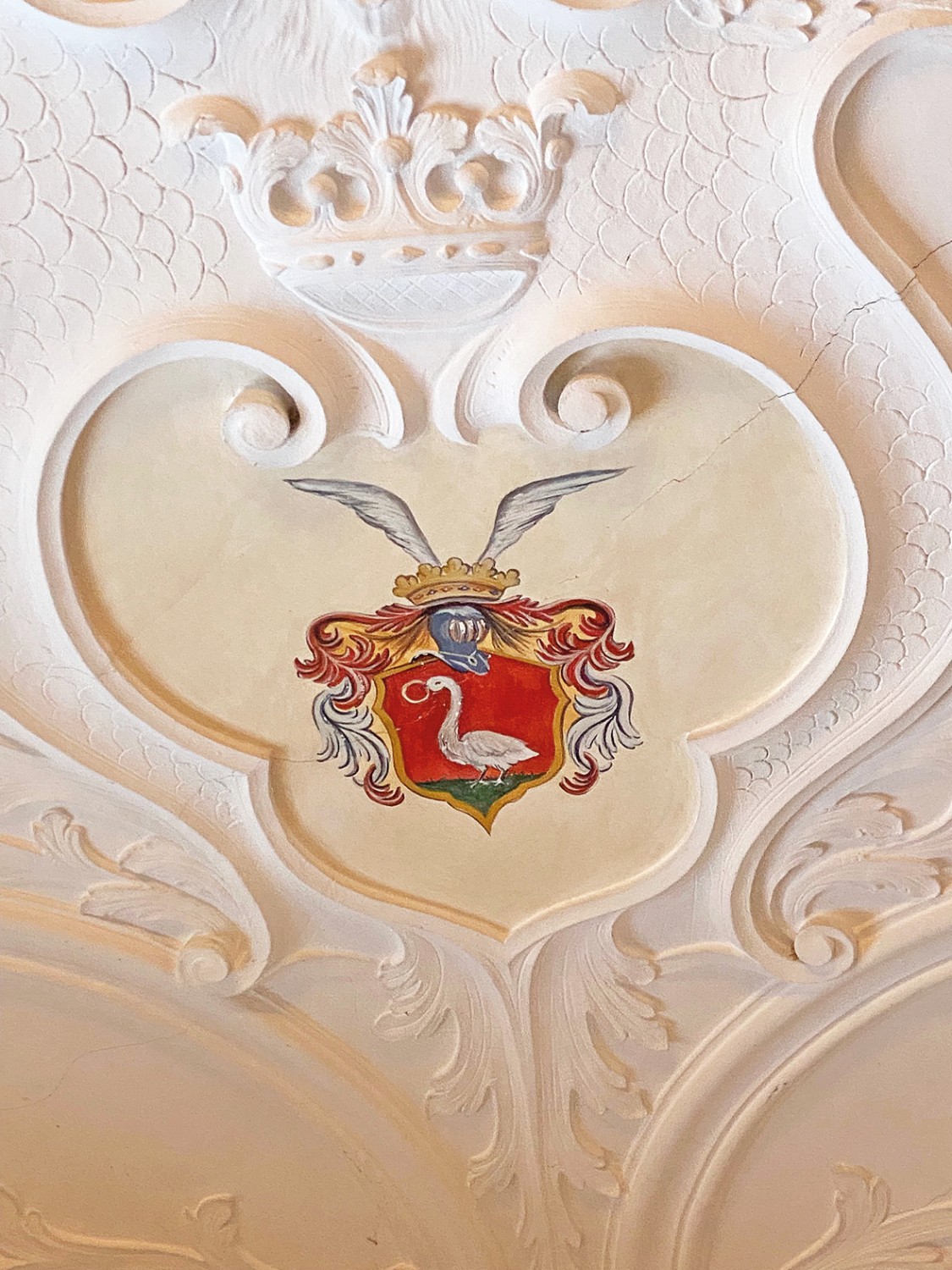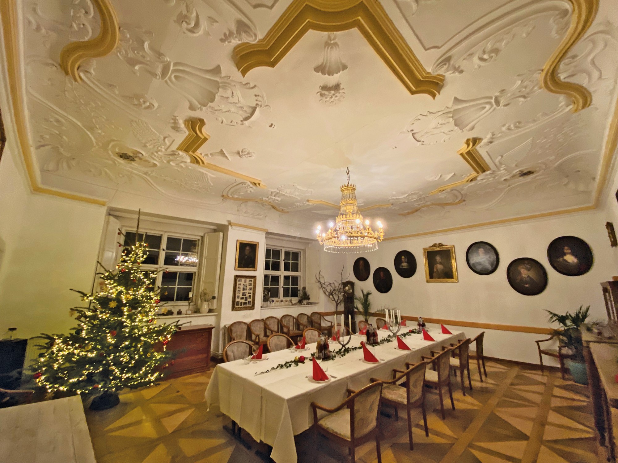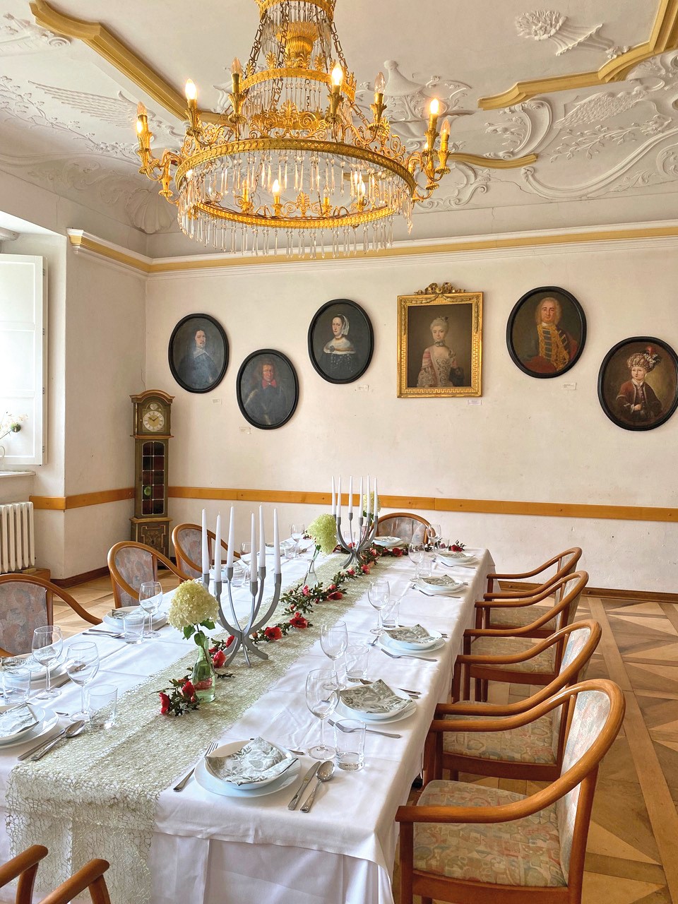 - Besonderheiten: historische Kapelle mit handbemalten Leinwandtapeten (arkadische Landschaften) aus dem 18. Jh., Festsaal mit italienischer Renaissance Stuckdecke, Eichenparkett, Kronleuchter und Ölgemälden