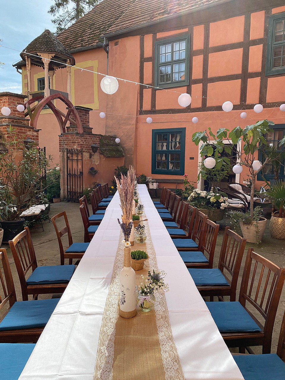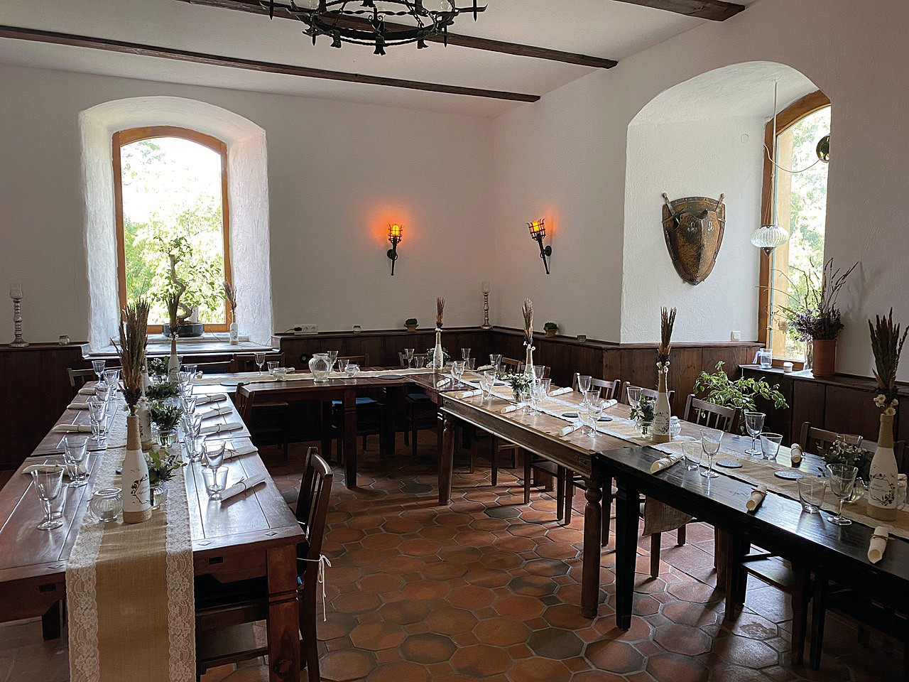 - Insgesamt ca. 2.692 m² Wohn- und Nutzfläche; Hauptburg ca. 1.248 m², ca. 420 m² Ausbaureserve im Dachgeschoss. 15 Gästezimmer (12 renoviert) in den 2 Obergeschossen und im Turm, untere Ebene mit Rittersaal, Salons, Festsaal und Kapelle, Gastro-Küche Torhaus ca. 200 m² Grundfläche + 180 m² im 1. OG, Einbau moderner Sanitäranlagen mit Duschen und WCs 2022 Scheune ca. 424 m² Grundfläche + ausbaufähiges OG Kornspeicher ca. 120 m² als Veranstaltungsraum im EG, Dachgeschoss ausbaubar