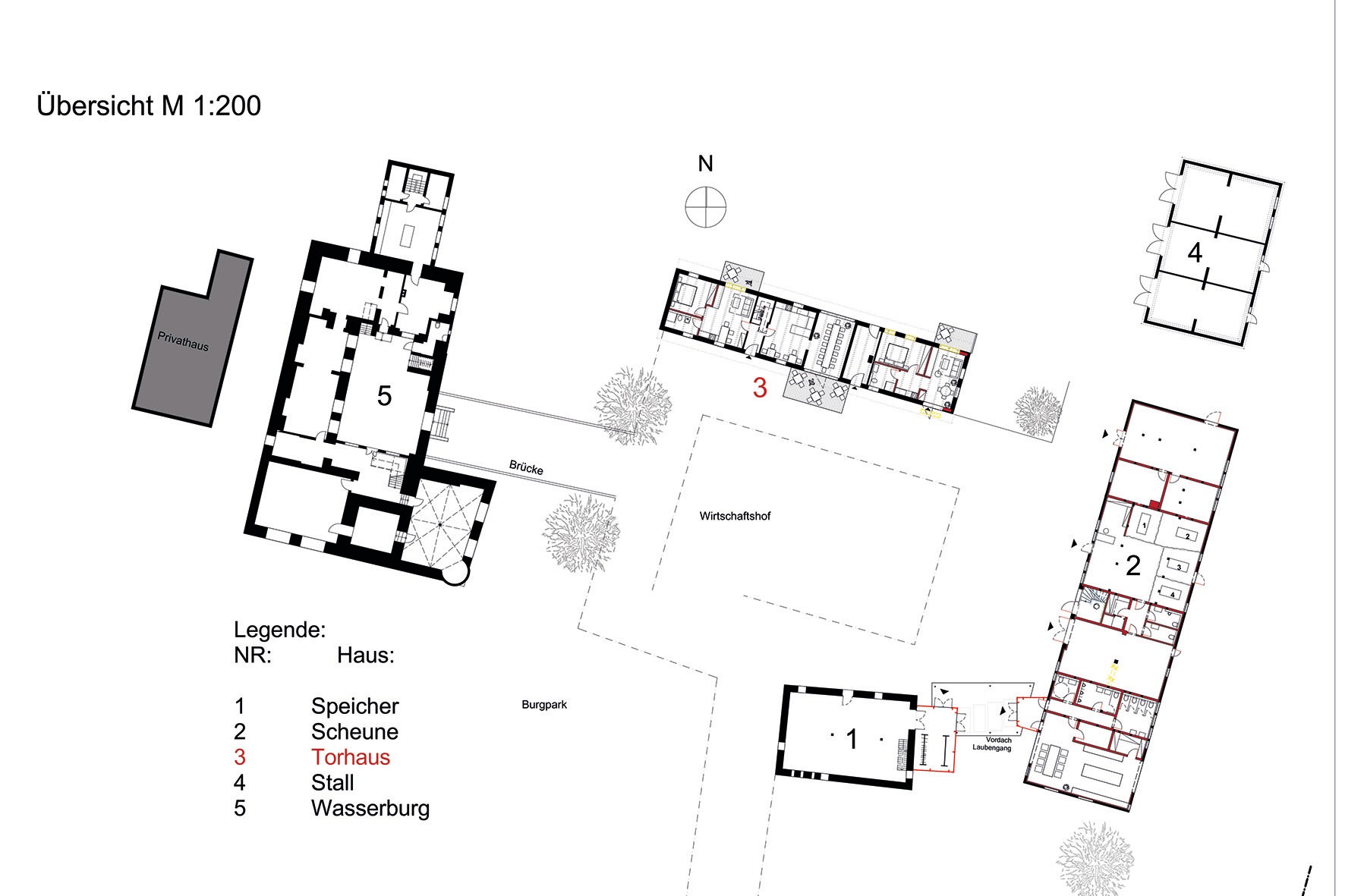 - Abwasser: Anschluss an öffentliches Netz; im Torhaus Genehmigung mit Versickerungsoption