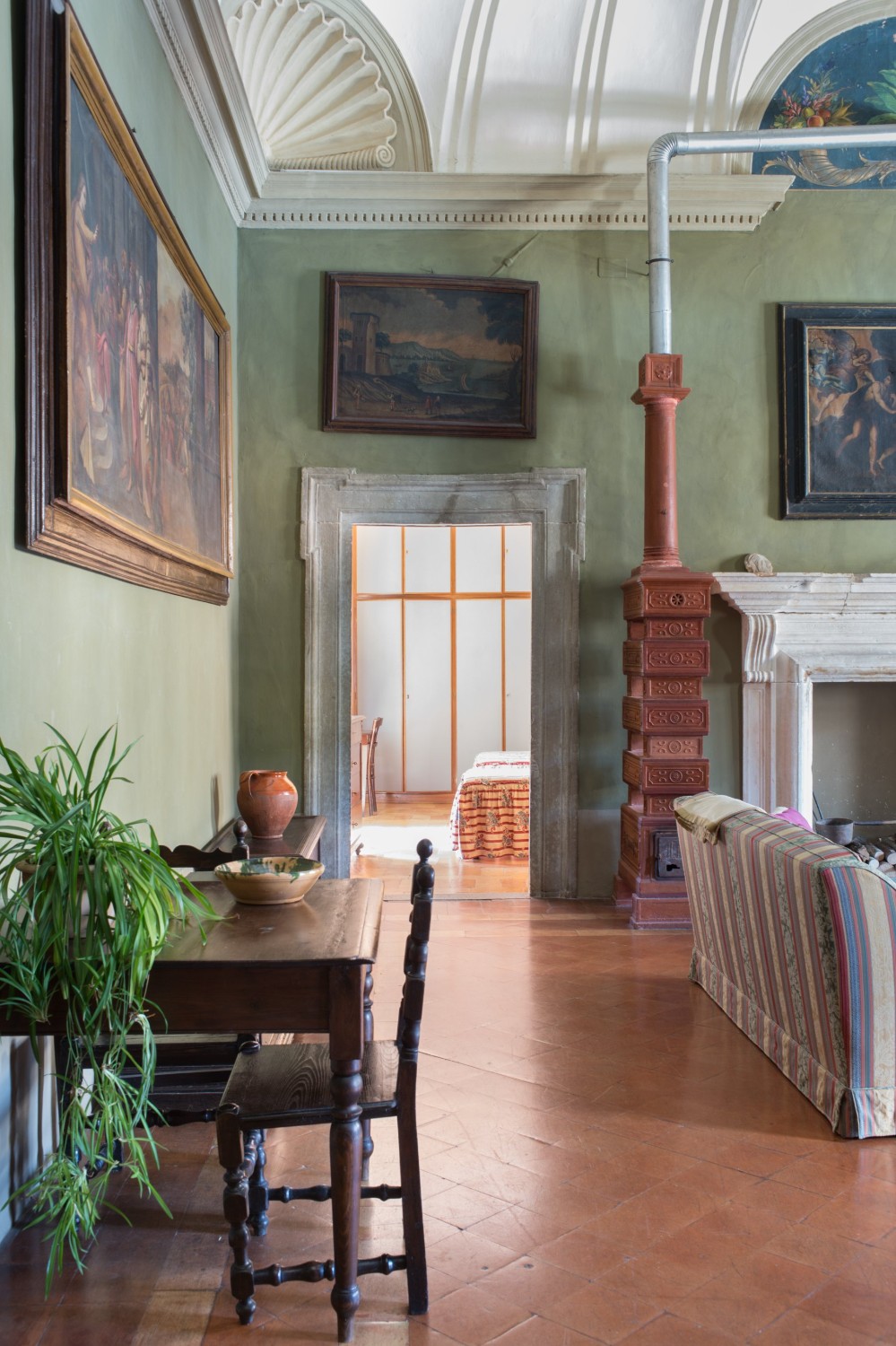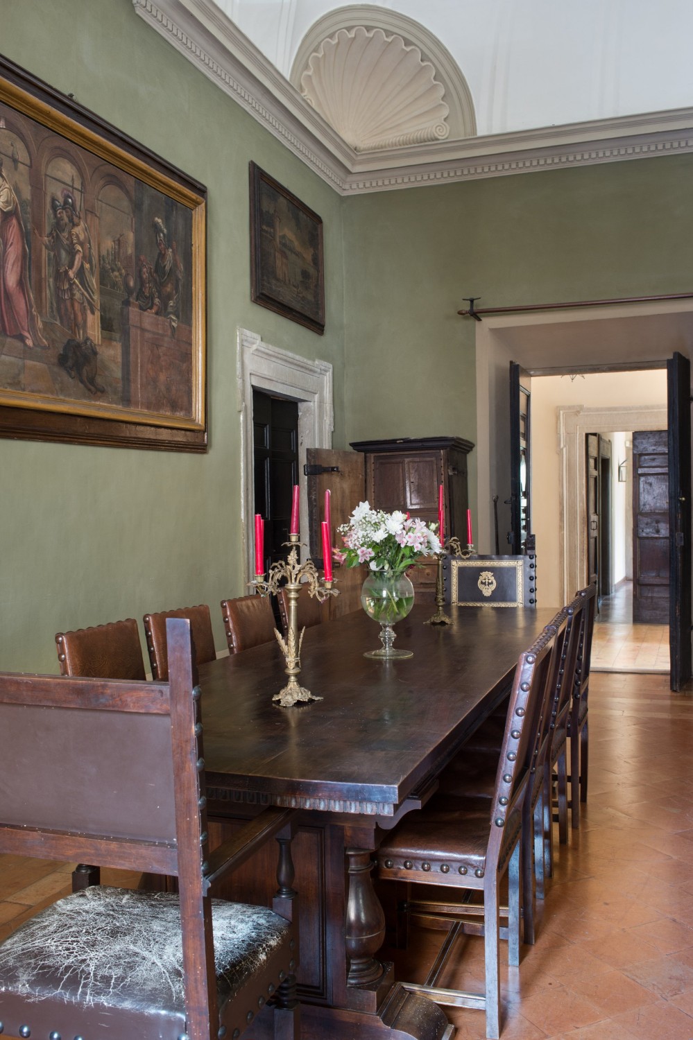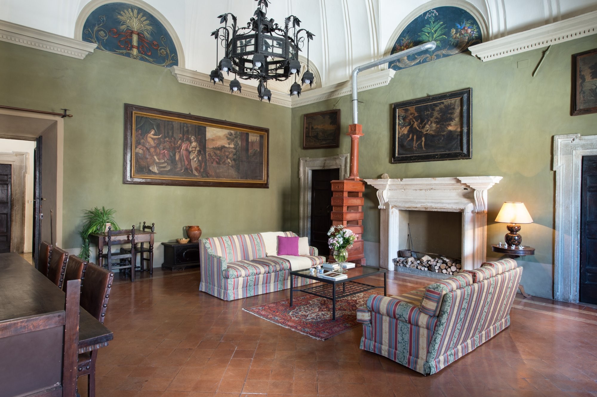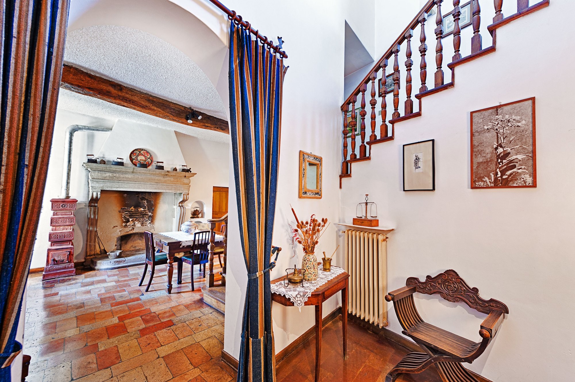 The palace’s architecture reflects its medieval origins and Renaissance flourish, with elegant proportions and well-preserved details. Spanning approximately 1,600 square metres, it is divided into two wings, accessible via a polished stone staircase. The left wing houses a splendid piano nobile hall with high ceilings, hand-painted frescoes, and walls that echo centuries of Italian history. The right wing offers two floors of refined living spaces, blending historic charm with modern comforts, including arched doorways, ornate cornices, and tall windows overlooking the square and private gardens.