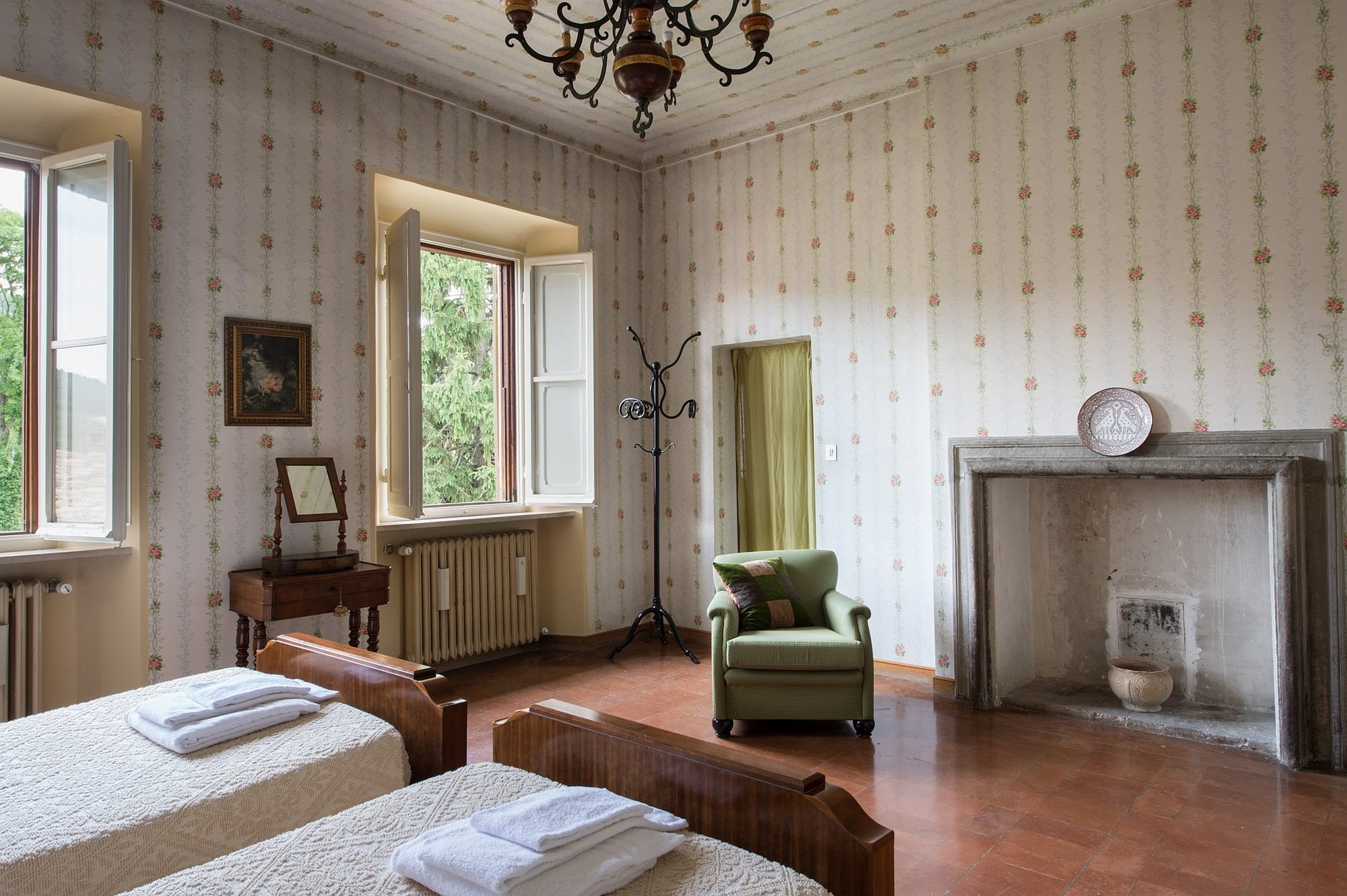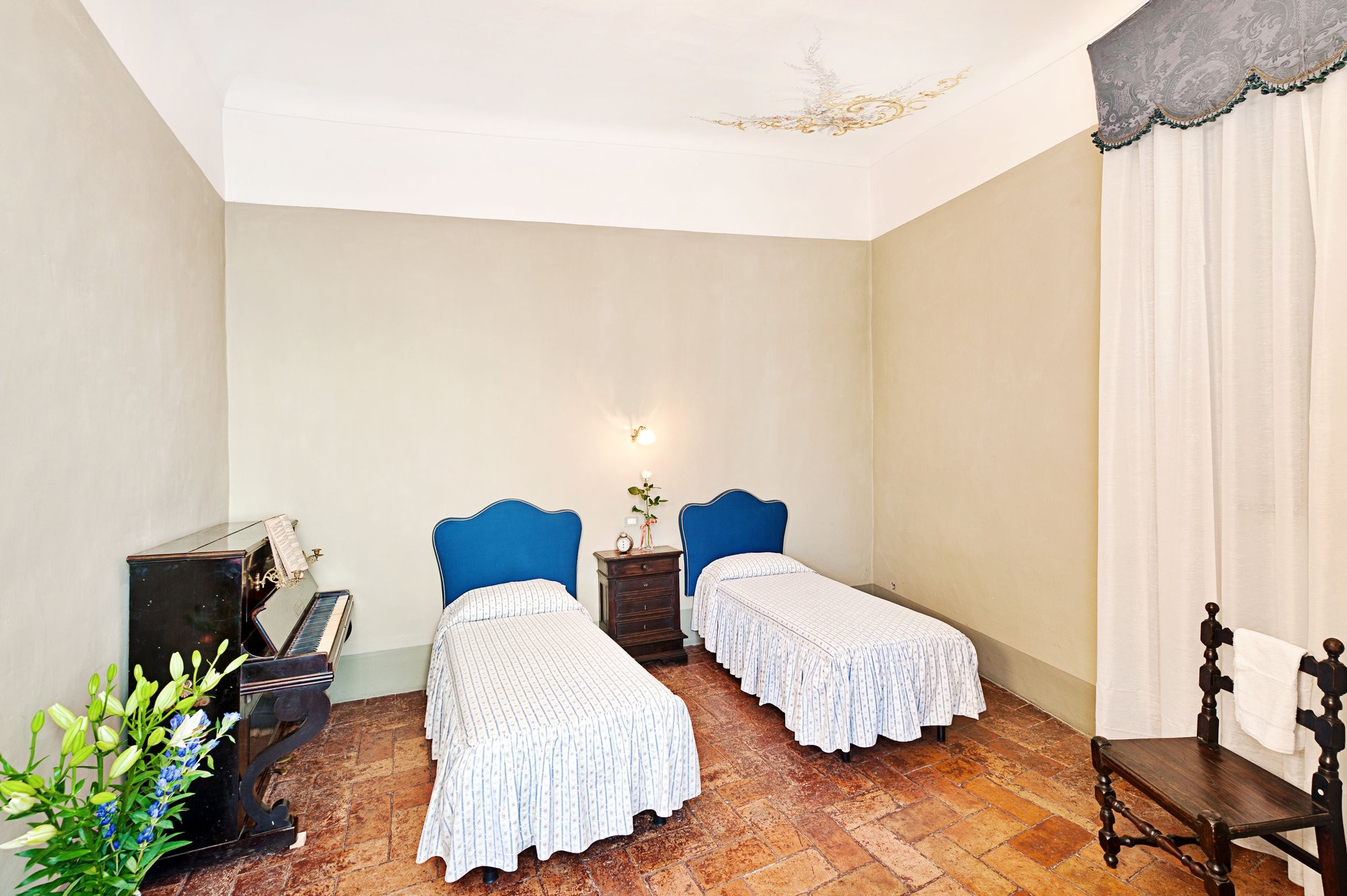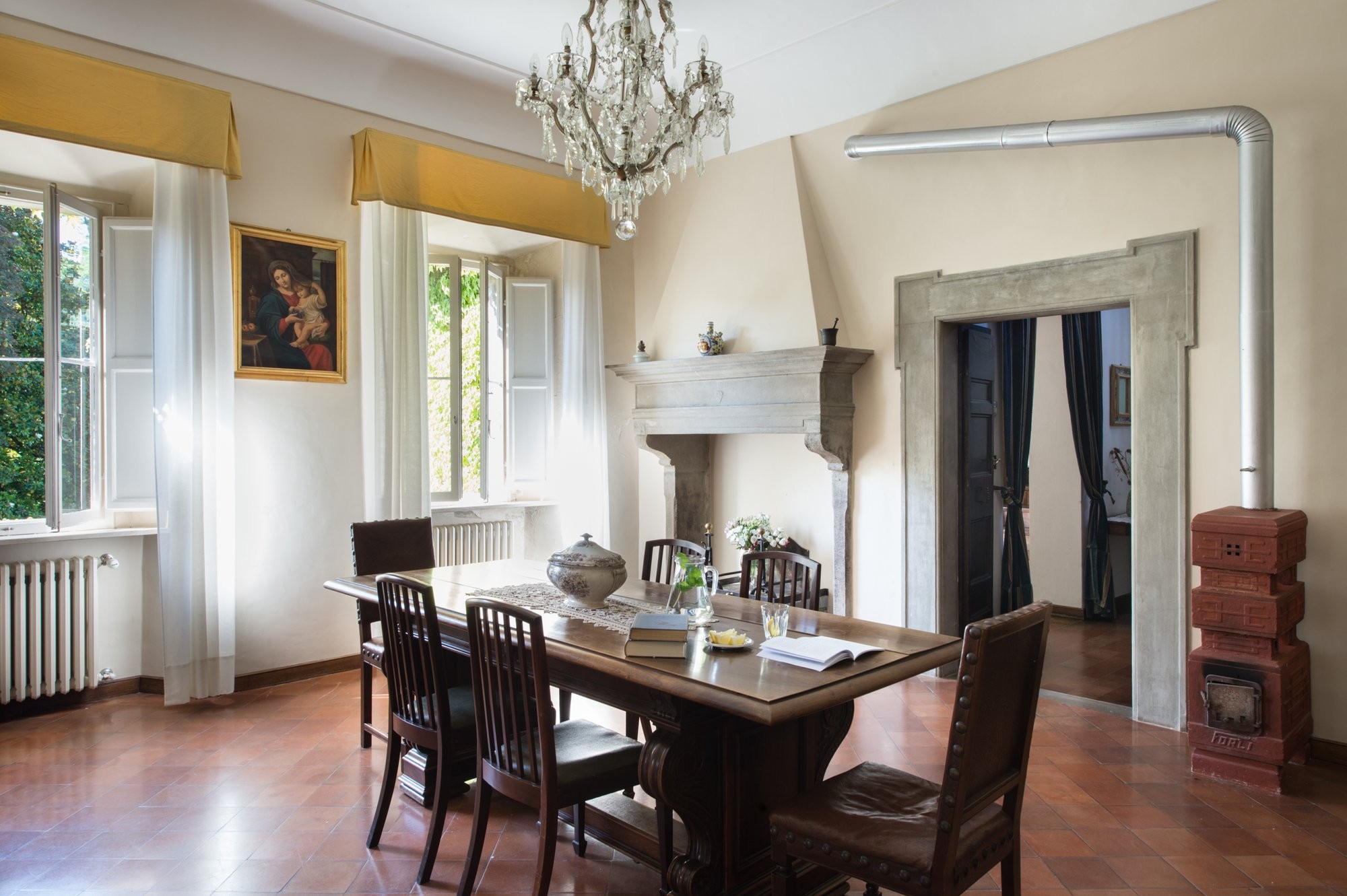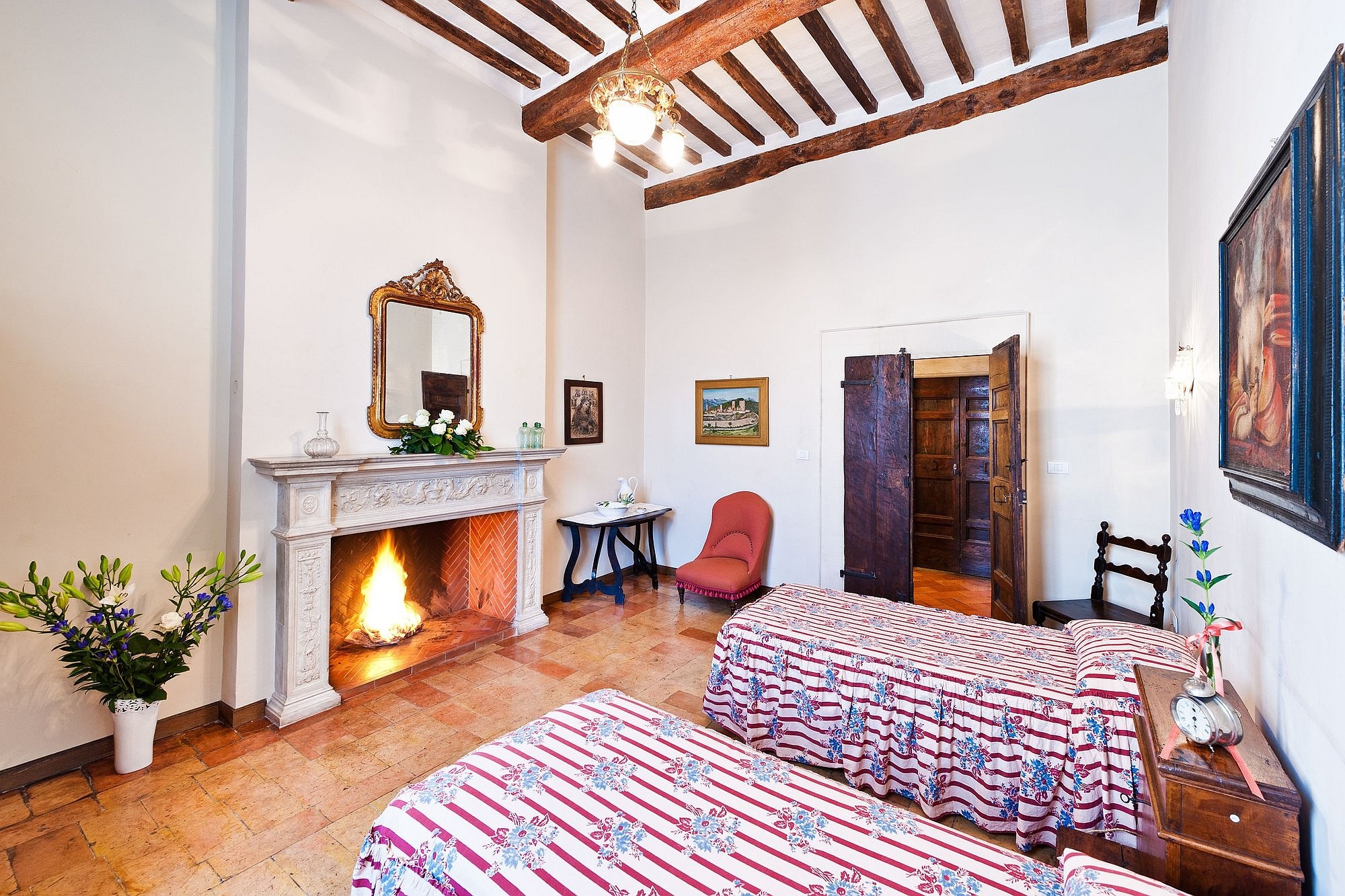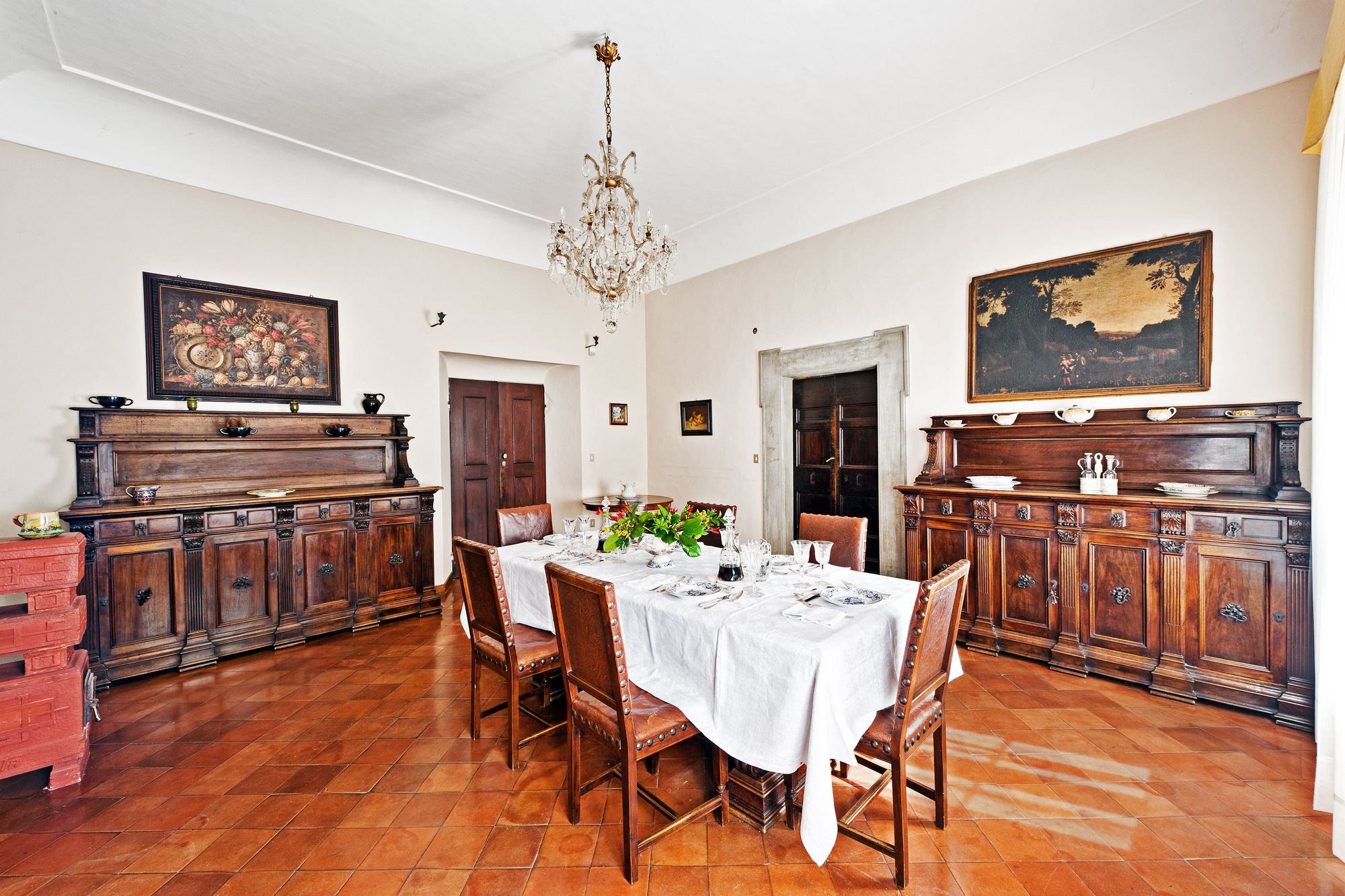 The palace’s architecture reflects its medieval origins and Renaissance flourish, with elegant proportions and well-preserved details. Spanning approximately 1,600 square metres, it is divided into two wings, accessible via a polished stone staircase. The left wing houses a splendid piano nobile hall with high ceilings, hand-painted frescoes, and walls that echo centuries of Italian history. The right wing offers two floors of refined living spaces, blending historic charm with modern comforts, including arched doorways, ornate cornices, and tall windows overlooking the square and private gardens.
