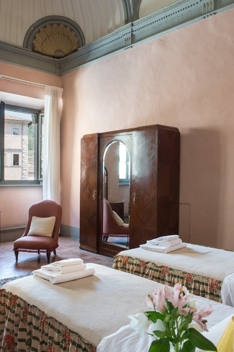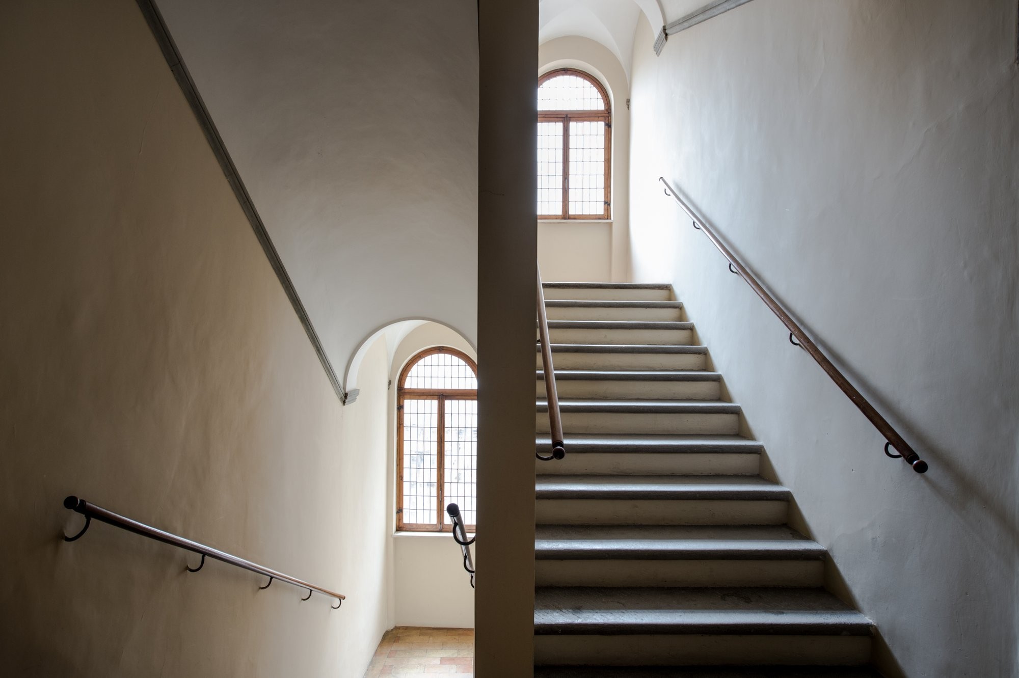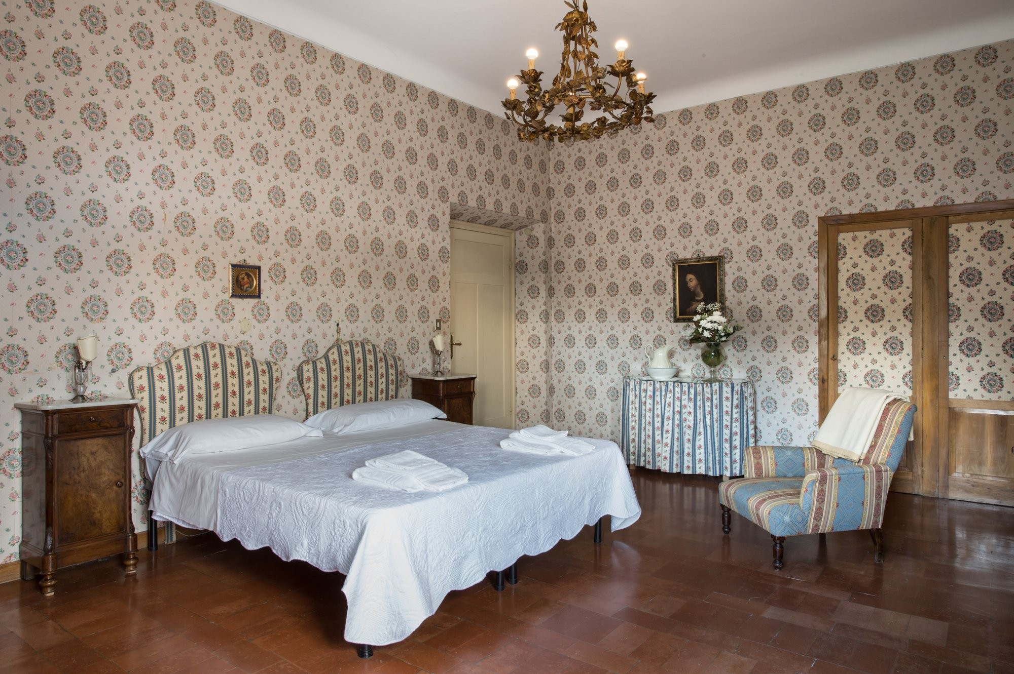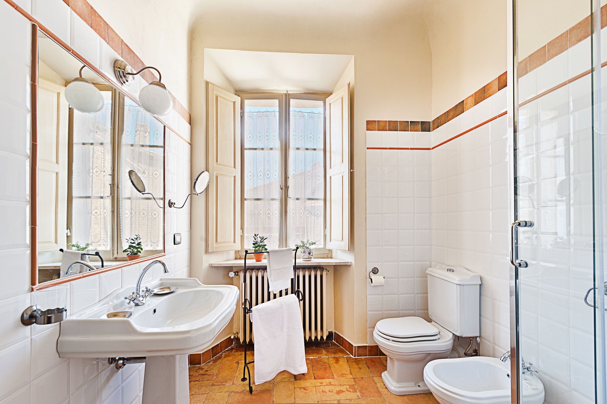 The palace’s architecture reflects its medieval origins and Renaissance flourish, with elegant proportions and well-preserved details. Spanning approximately 1,600 square metres, it is divided into two wings, accessible via a polished stone staircase. The left wing houses a splendid piano nobile hall with high ceilings, hand-painted frescoes, and walls that echo centuries of Italian history. The right wing offers two floors of refined living spaces, blending historic charm with modern comforts, including arched doorways, ornate cornices, and tall windows overlooking the square and private gardens.