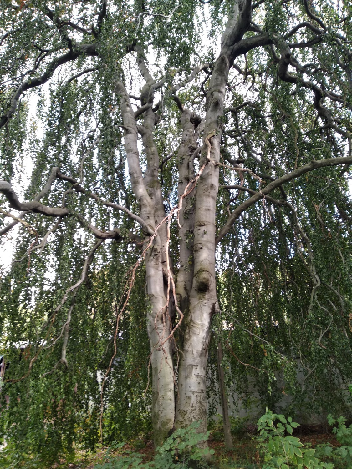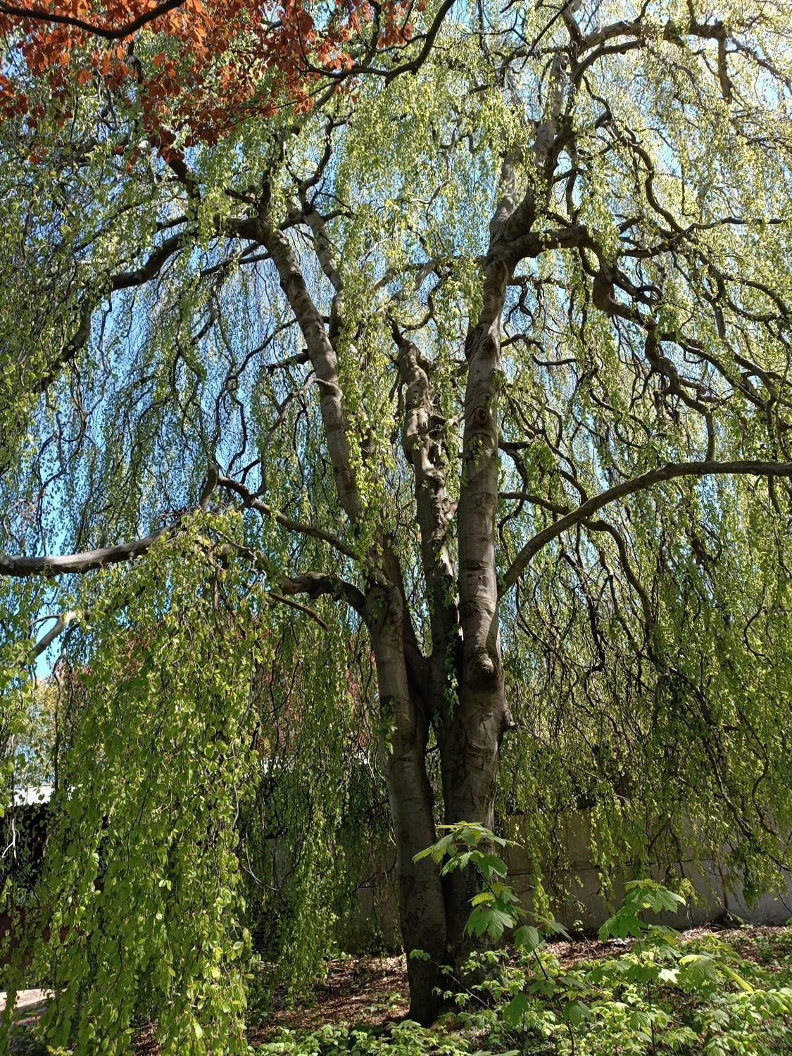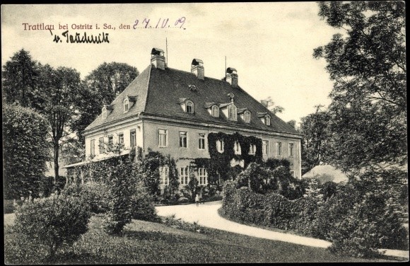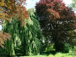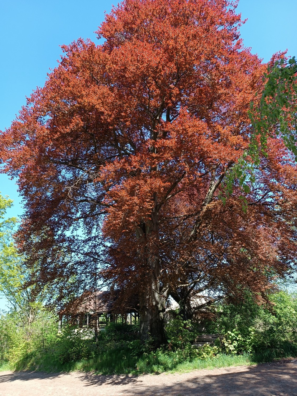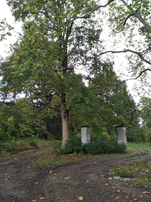 A 150-year-old linden avenue creates a formal visual axis through the estate, connecting the palace to the adjoining woodland. The parkland contains mature specimen trees including weeping beeches and a red oak. A raised driveway with stone retaining wall separates the formal palace grounds from the farm courtyard. A levelled area to the east marks the site of a former ornamental garden.
