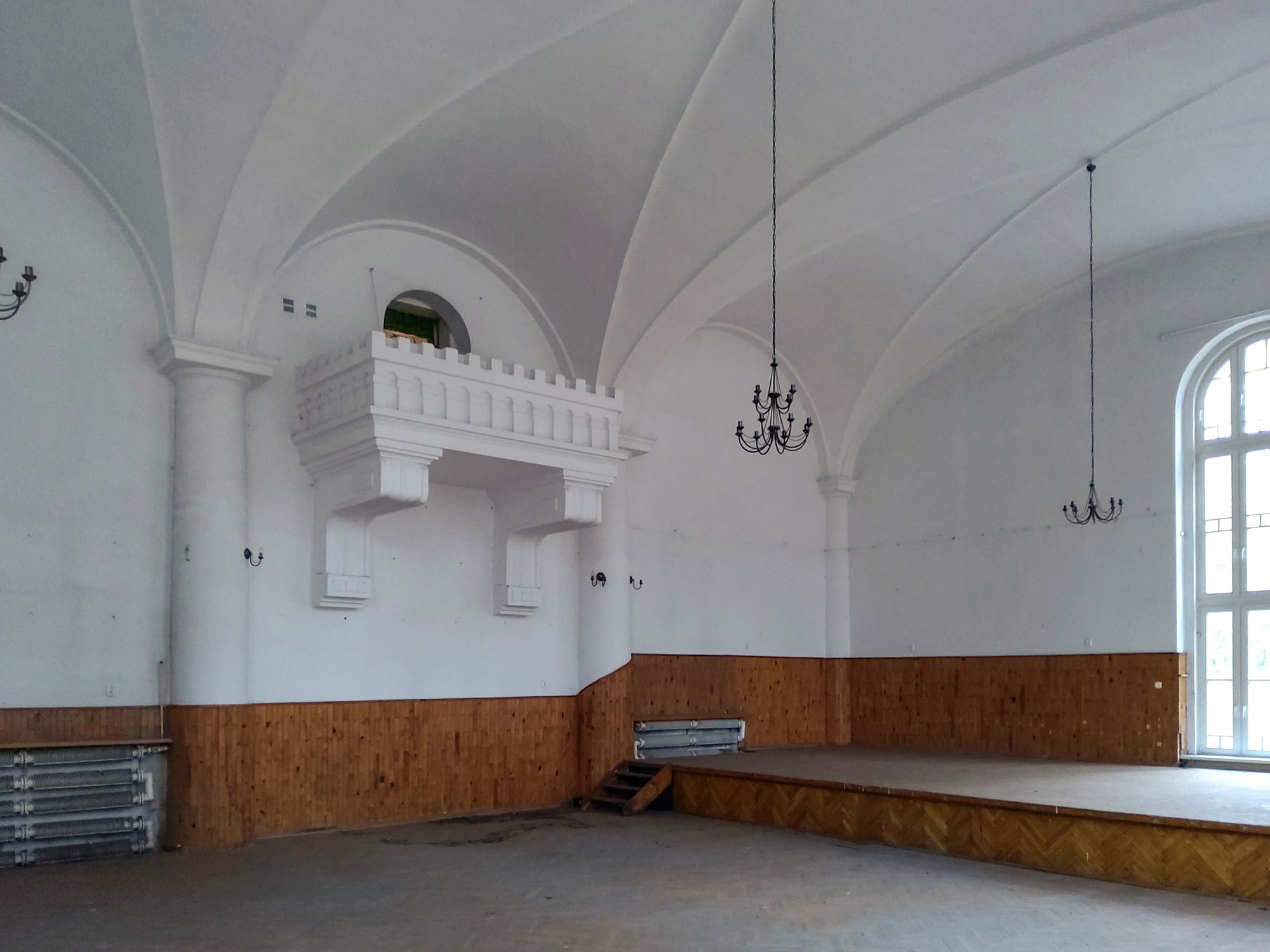 The decorative former stable in the neoclassical style, with a portico, currently houses four apartments. Originally, a sports hall with adjoining sanitary facilities was located in the centre of the building. The attic remains unused, and the building is partially basemented. The total usable area of the former stable is 470 m².