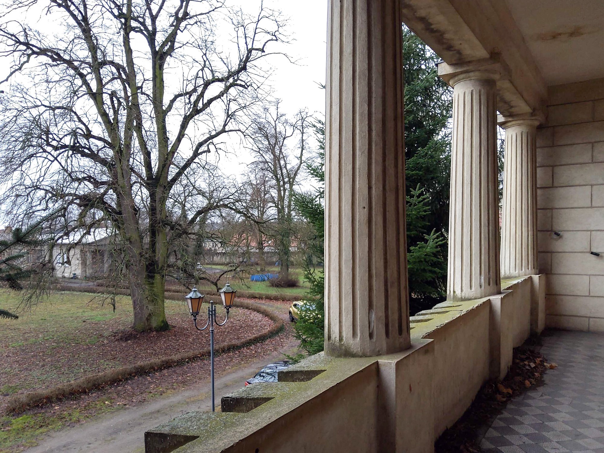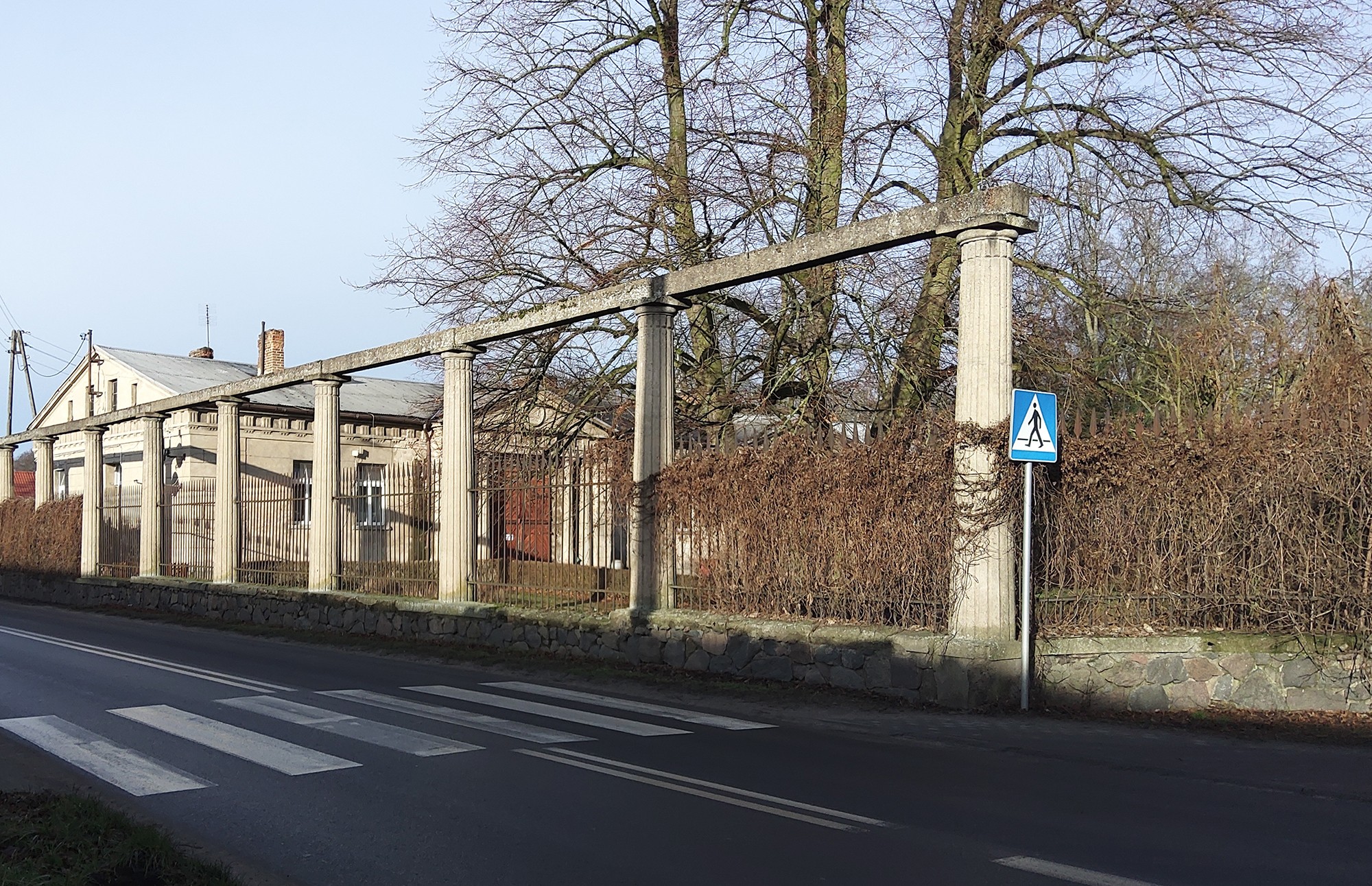 Access to the former estate is through an imposing gate adorned with two columns featuring lion statues and a family crest. The gate is framed by an elegant Doric colonnade. The property is enclosed by a representative wall from 1913.