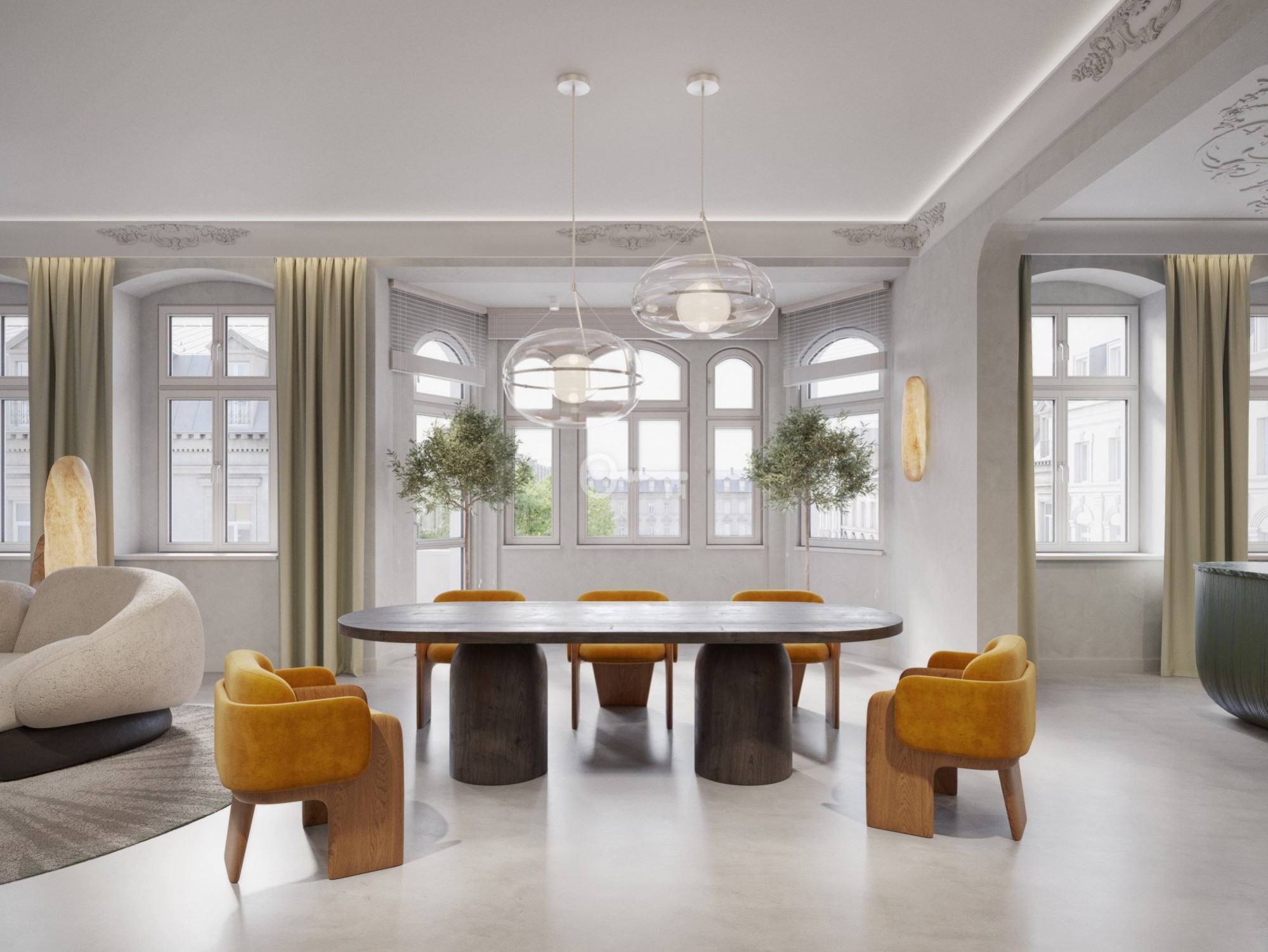 The original splendor of the building has been meticulously restored, with attention to every detail – from the renovated façade and decorative cornices and pilasters to the elegant staircase with preserved original elements. The façade, inspired by architect Georg Rzechulka’s design, harmoniously combines classical elegance with subtle modern tones, selected with additional feng shui consultation.
