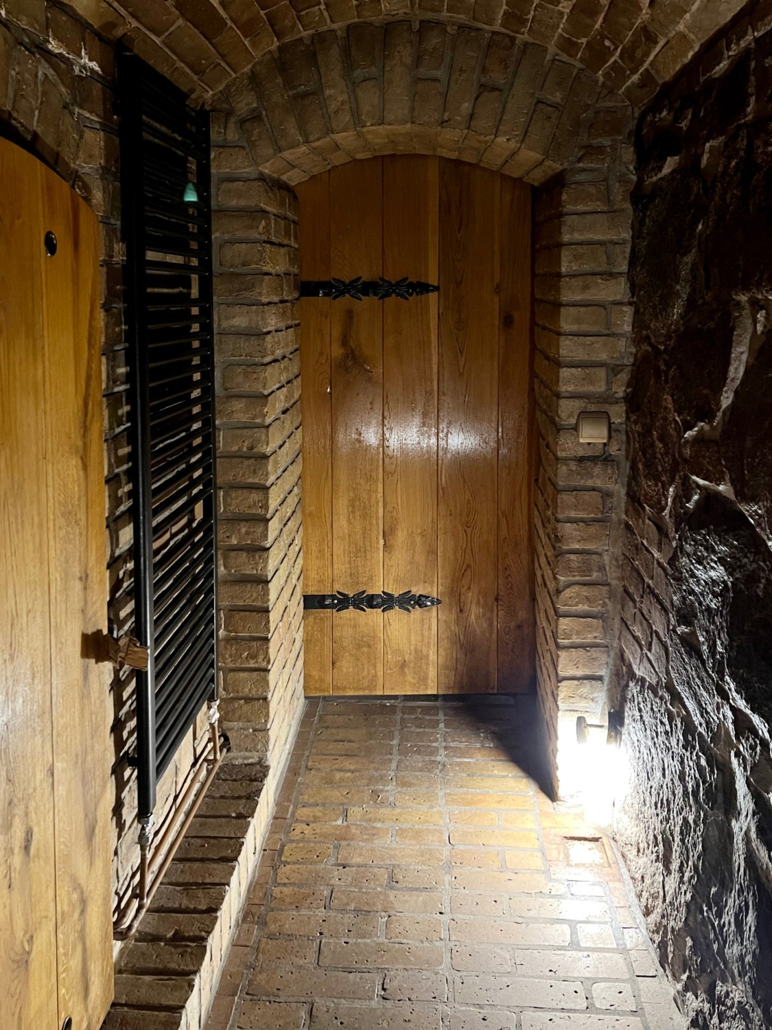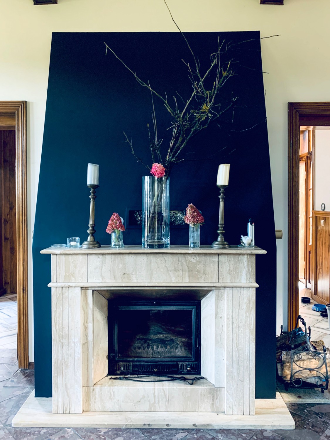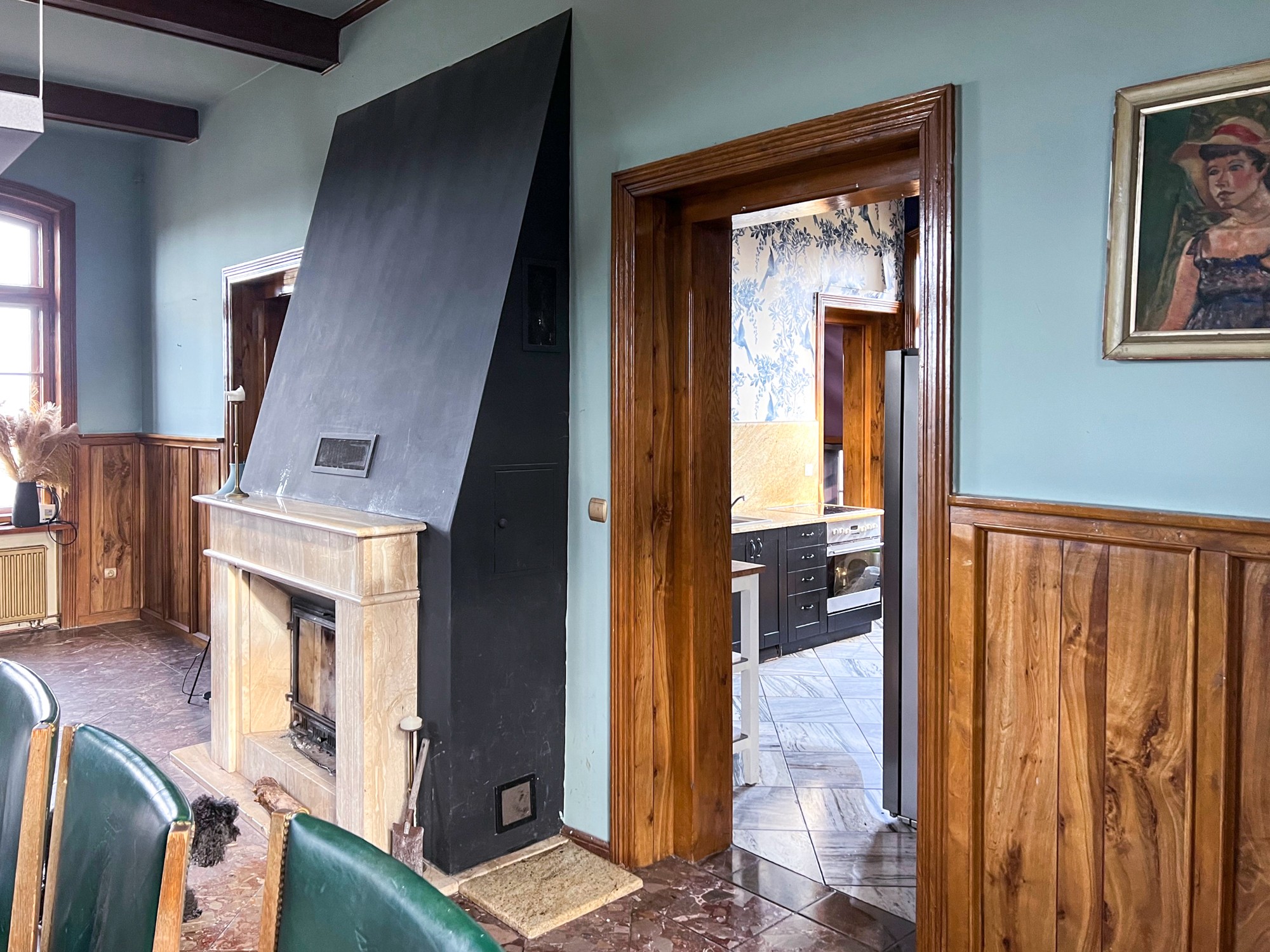 The property comprises two bedrooms, a bathroom, a spacious, light-filled living room with an open fireplace, a kitchen, and a cellar, also featuring a fireplace.