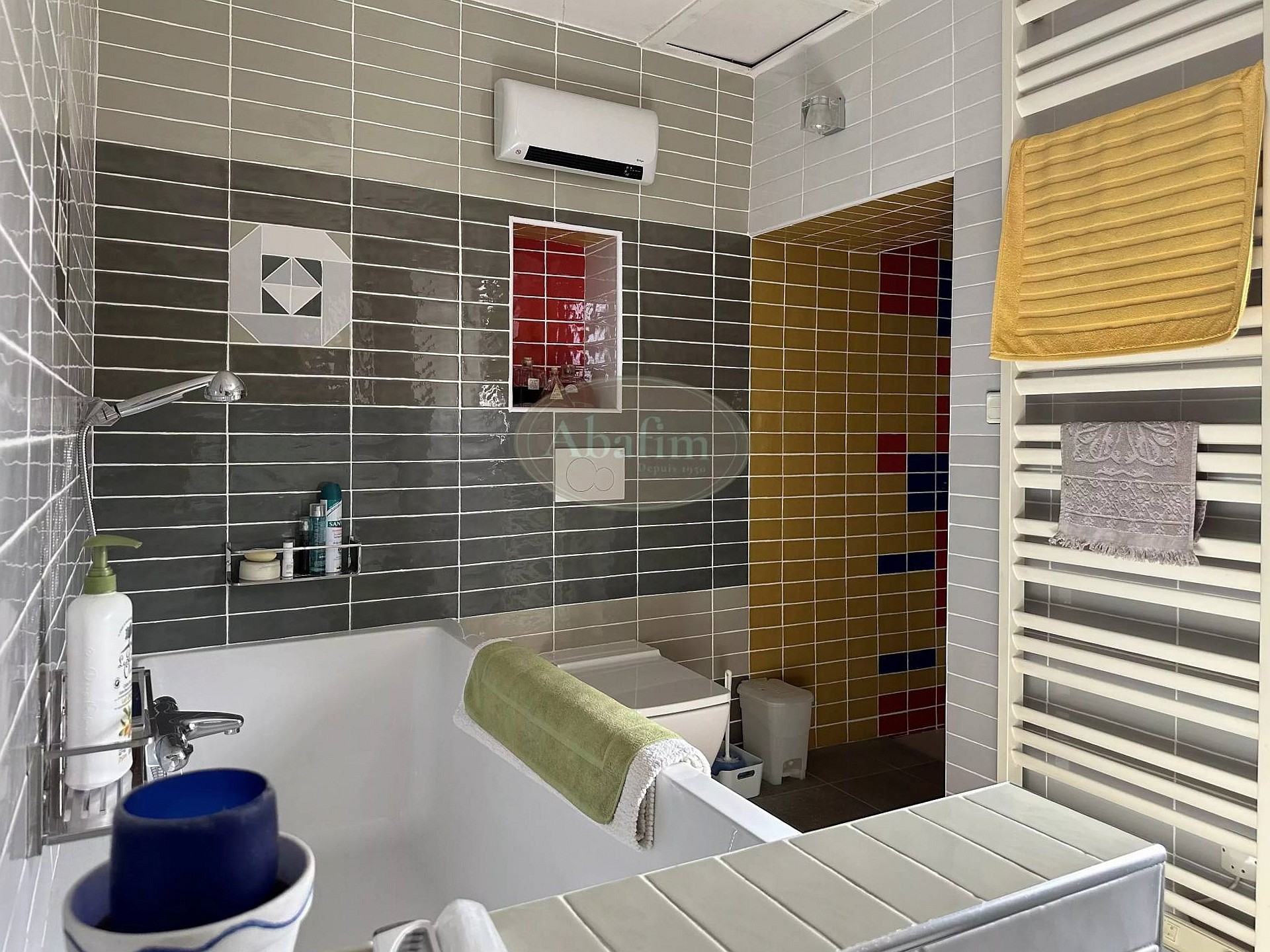 A central staircase leads to a mezzanine landing occupied by the primary suite. This 538 sq ft space comprises a bedroom, a bathroom with shower and a dressing room.