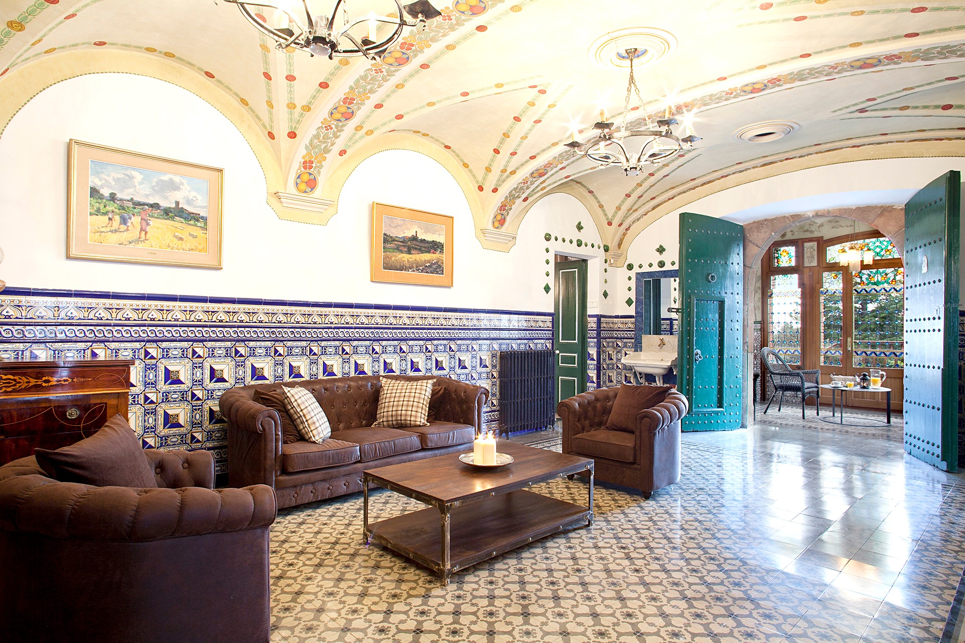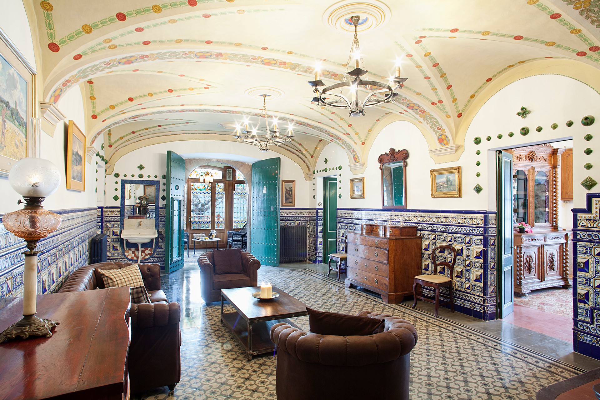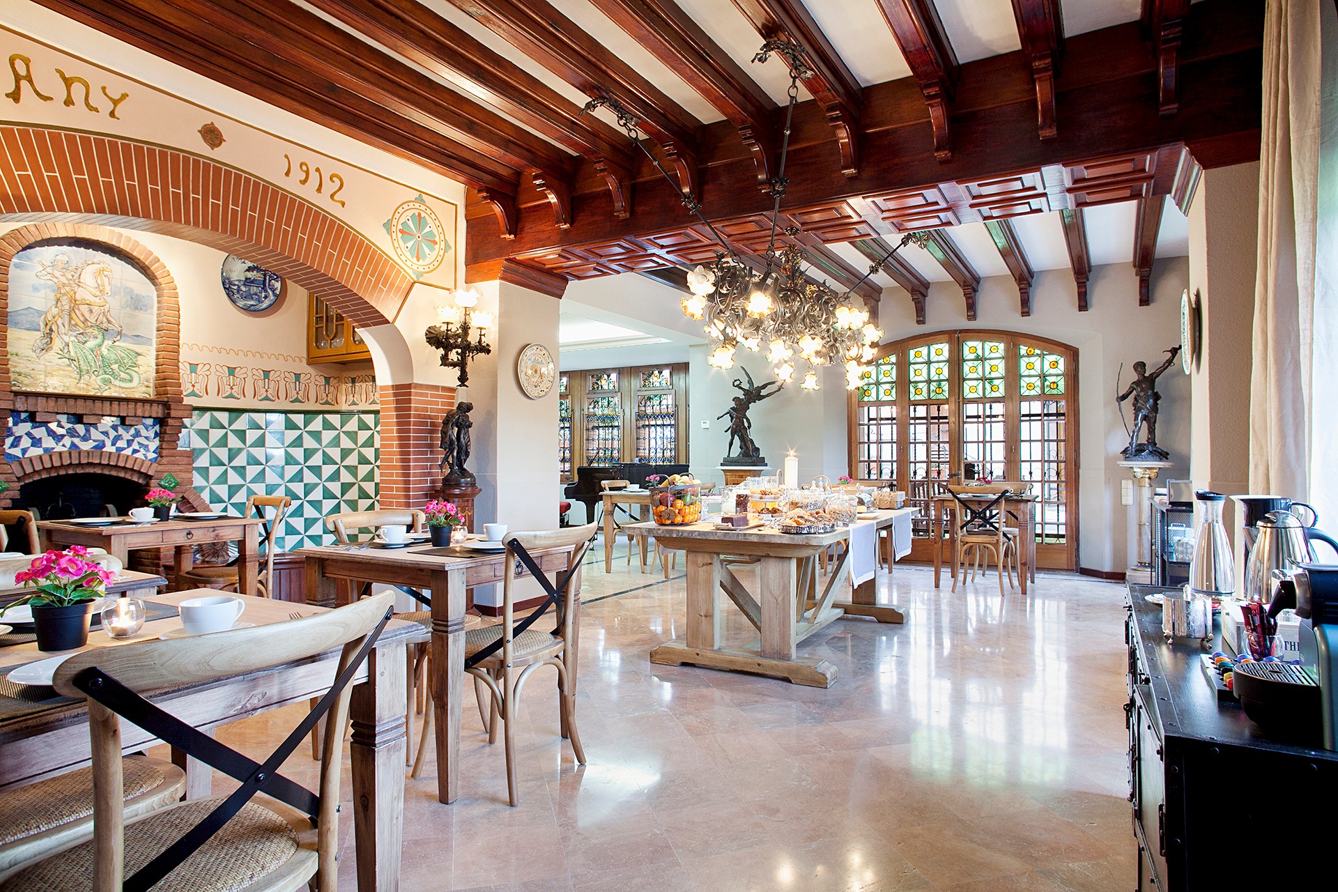 The main villa, built in 1912 and designed by Juli Batllevell, a student of Domènech i Montaner, has been extensively renovated. Original features such as the façade, stained glass, hydraulic floors, decorative ceilings, frescoes, and mosaics have been preserved. The villa includes spacious reception rooms, a chapel, suites with terraces, and event spaces accommodating up to 70 guests.