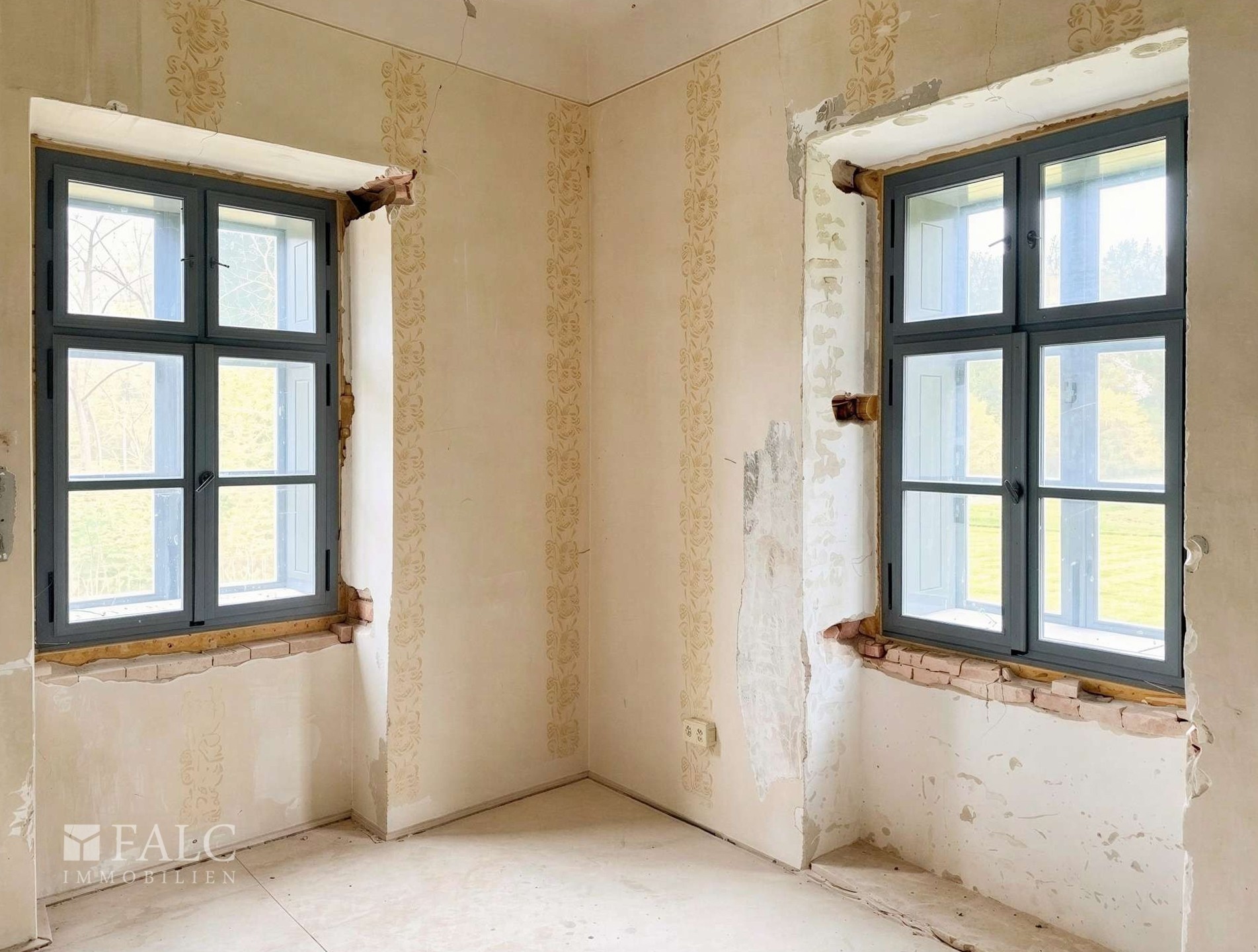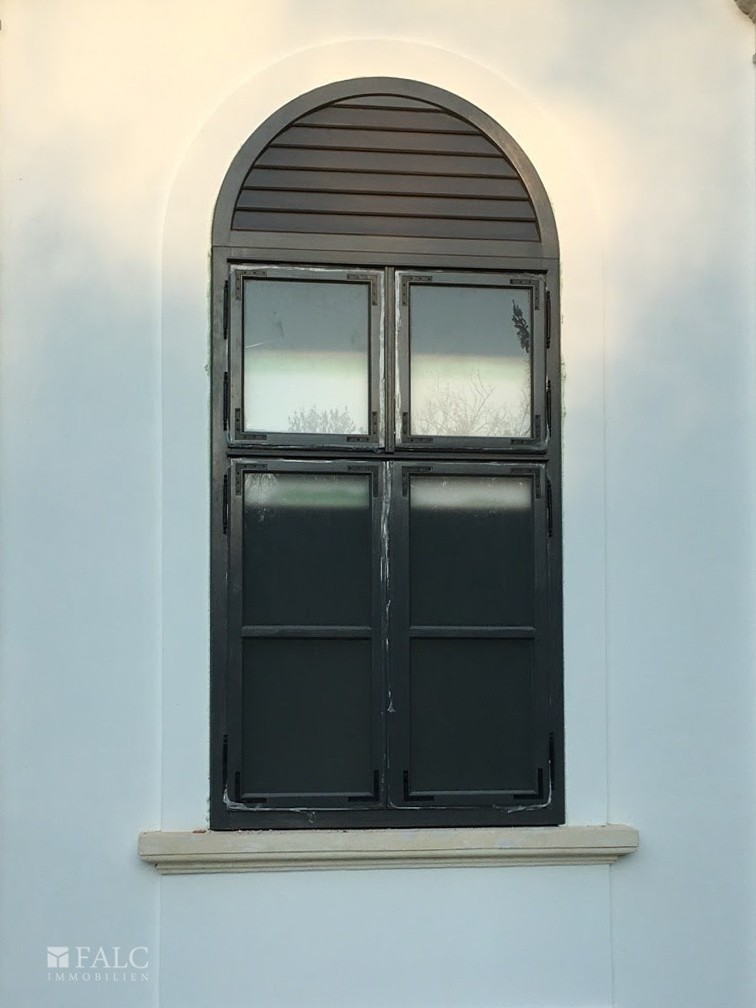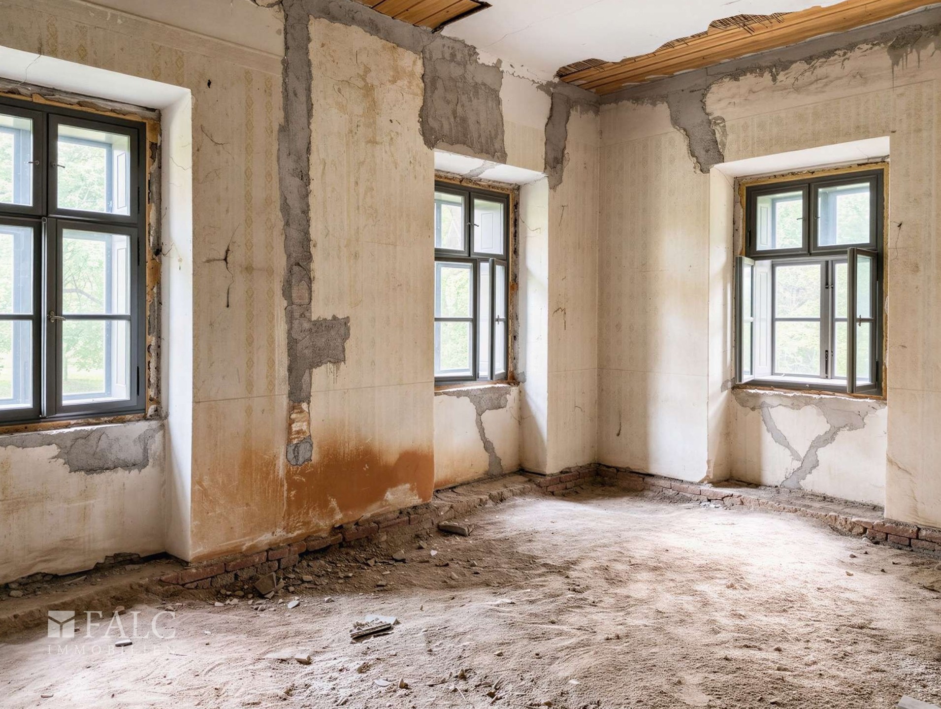The exterior of the building has been fully reinstated, including a complete replacement of the roof structure and tiling, chimney reconstruction, and a full facade restoration. All windows and doors have been replaced with bespoke, period-accurate reproductions. Technical improvements also include comprehensive structural sealing and the installation of a new stone-paved driveway. Internally, the property retains its original timber-beamed ceilings, and current works are focused on restoring the floor surfaces and installing a modern gas heating system.