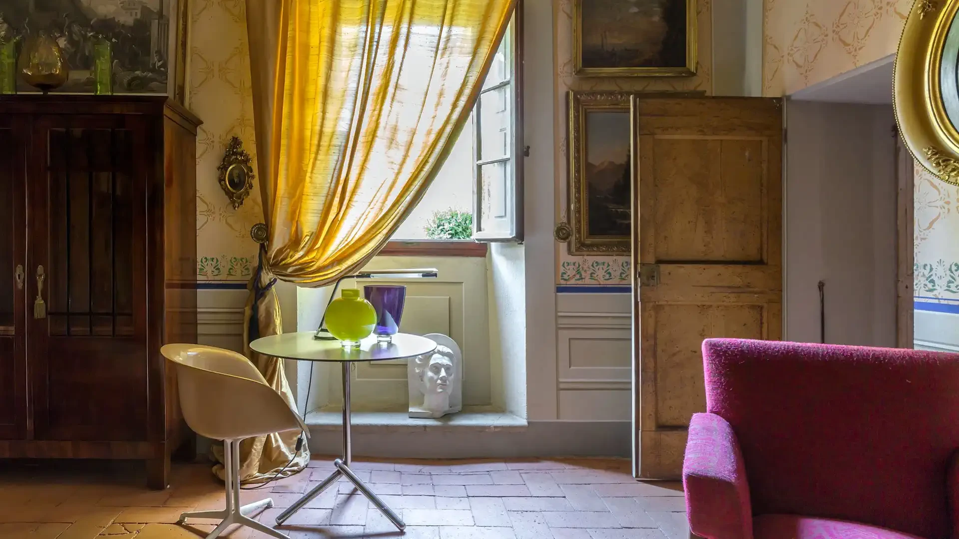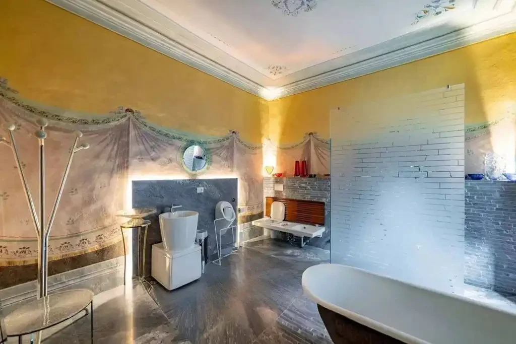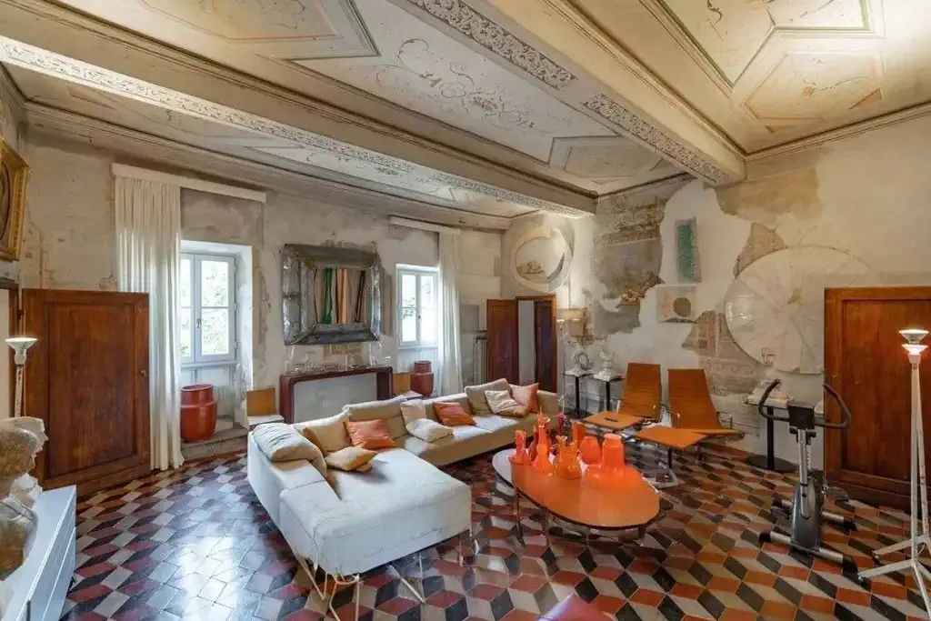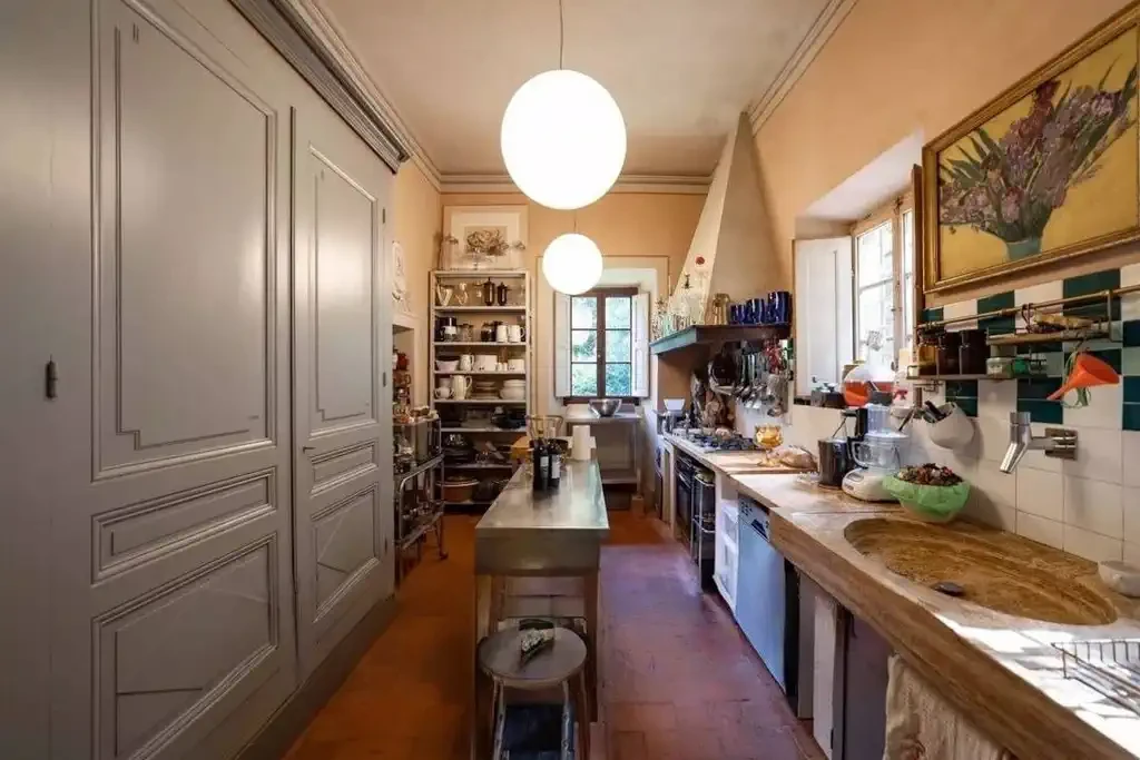 Original terracotta floors and historic wooden doors have been preserved, seamlessly integrating with the overall aesthetic.