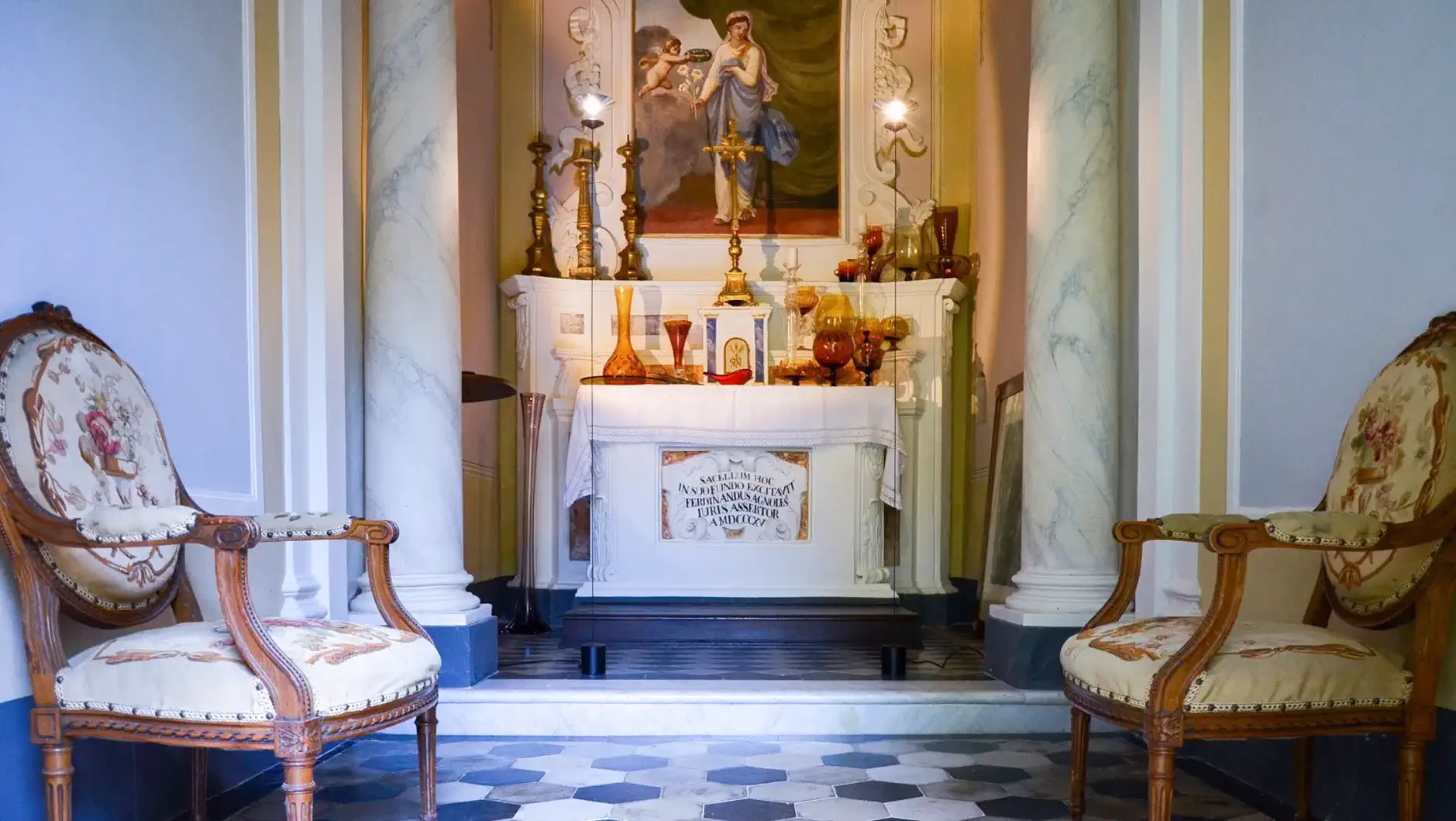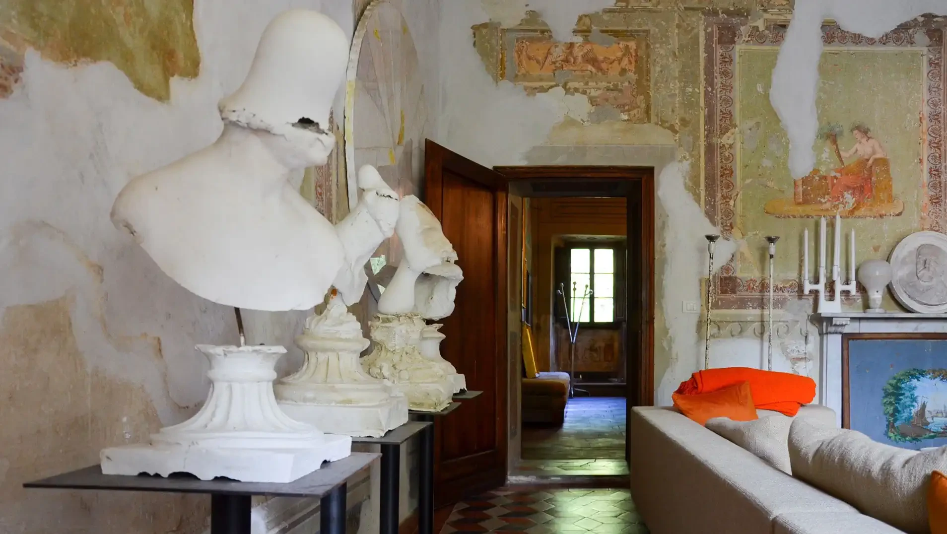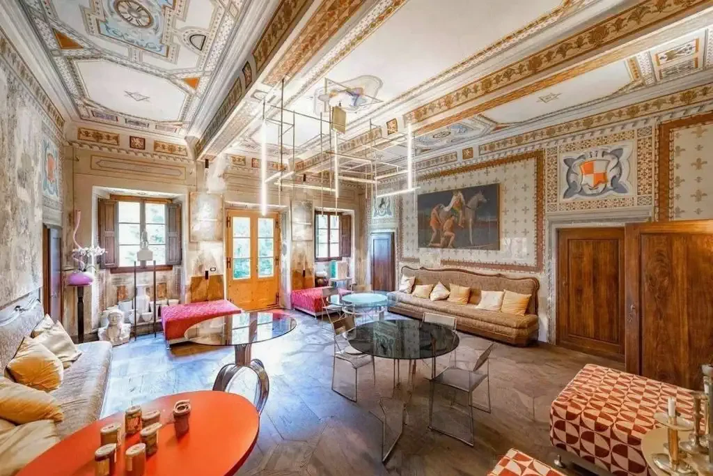 During the most recent restoration, fresco cycles were uncovered decorating the living and reception rooms. The murals feature floral and geometric motifs as well as trompe-l'œil architecture. A cycle depicting the four seasons once existed; part of it was lost due to 19th-century structural changes.