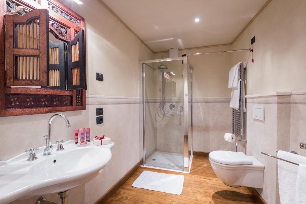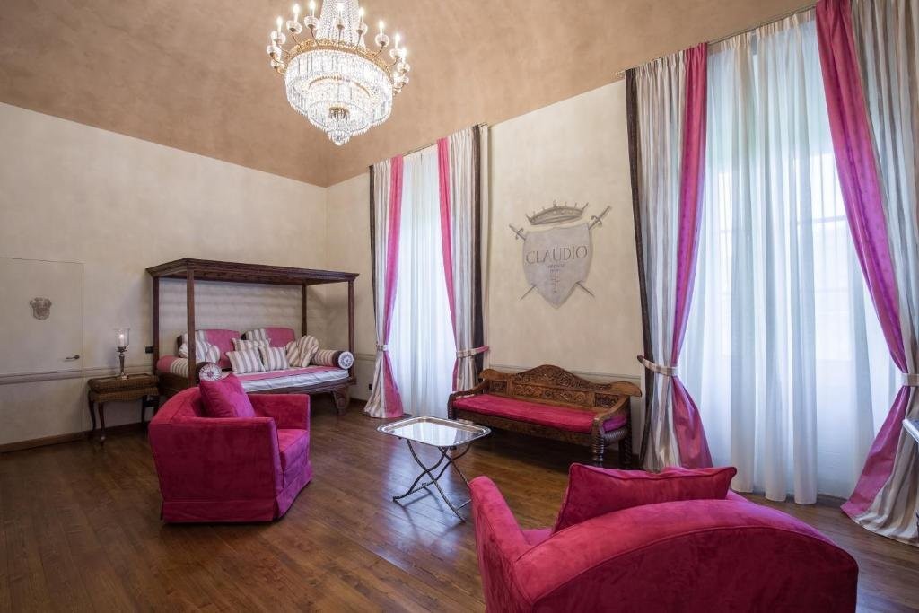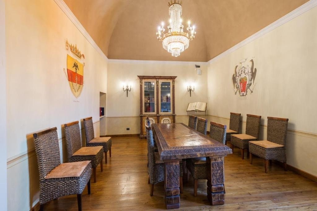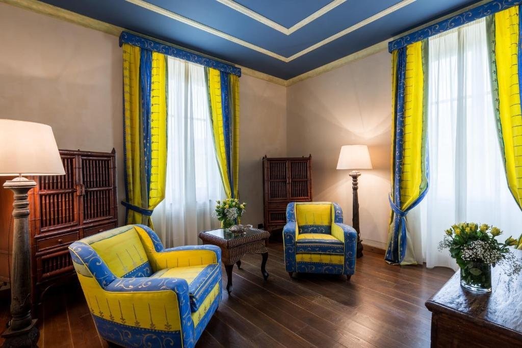 At the centre of the property lies a spacious courtyard that floods the lower levels with natural light, creating a welcoming environment for guests. On the ground floor, visitors are greeted by the elegant restaurant, which accommodates 120 diners indoors and 32 on the terrace, alongside a lounge bar and comfortable seating areas. The reception area exudes warmth and sophistication, while the spa, complete with sauna, experience shower, and massage room, provides a tranquil retreat. The first floor houses fourteen individually designed suites, each with a private bathroom, some featuring separate sitting areas or extending across multiple levels. Reception rooms for private events, business meetings, and celebrations offer flexible spaces, and a covered terrace presents panoramic views of the Tuscan-Emilian Apennines, blending indoor and outdoor living.