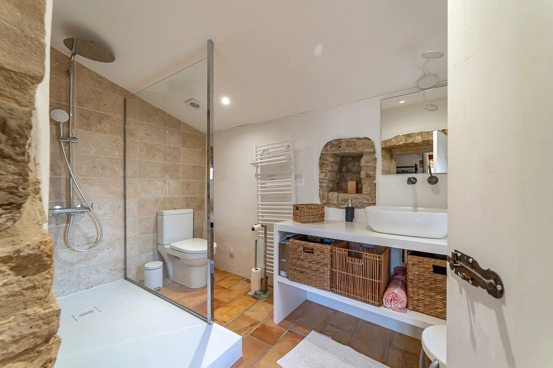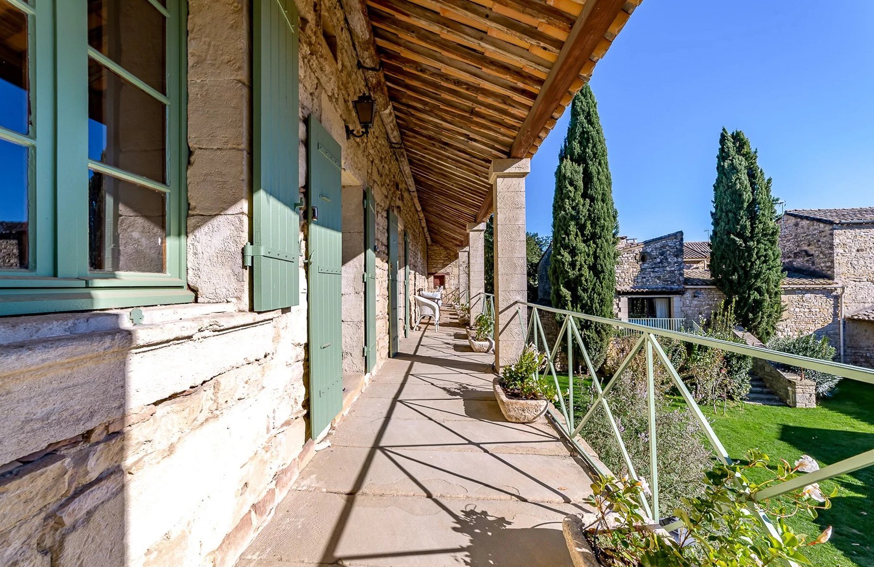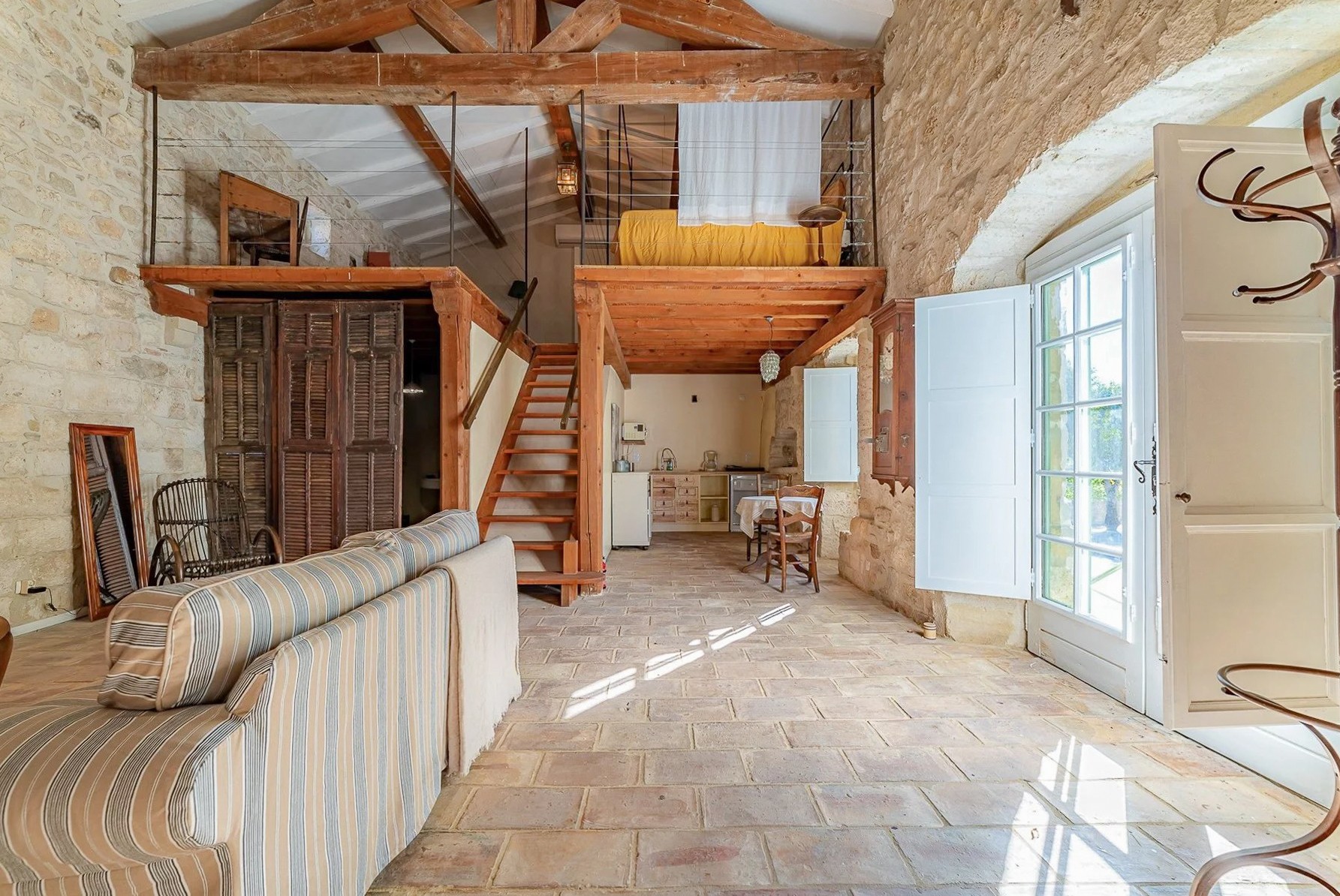The principal house offers both authenticity and light across approximately 320 m² of living space: a sequence of handsome vaulted rooms, including sitting room, dining room and kitchen, all opening directly onto the garden. The stone vaulting lends warmth and character without diminishing the natural brightness. Upstairs, the sleeping quarters are arranged around a shaded gallery: two en-suite bedrooms, a spacious dormitory, and several additional rooms that could readily serve as a studio or study for those in search of inspiration.