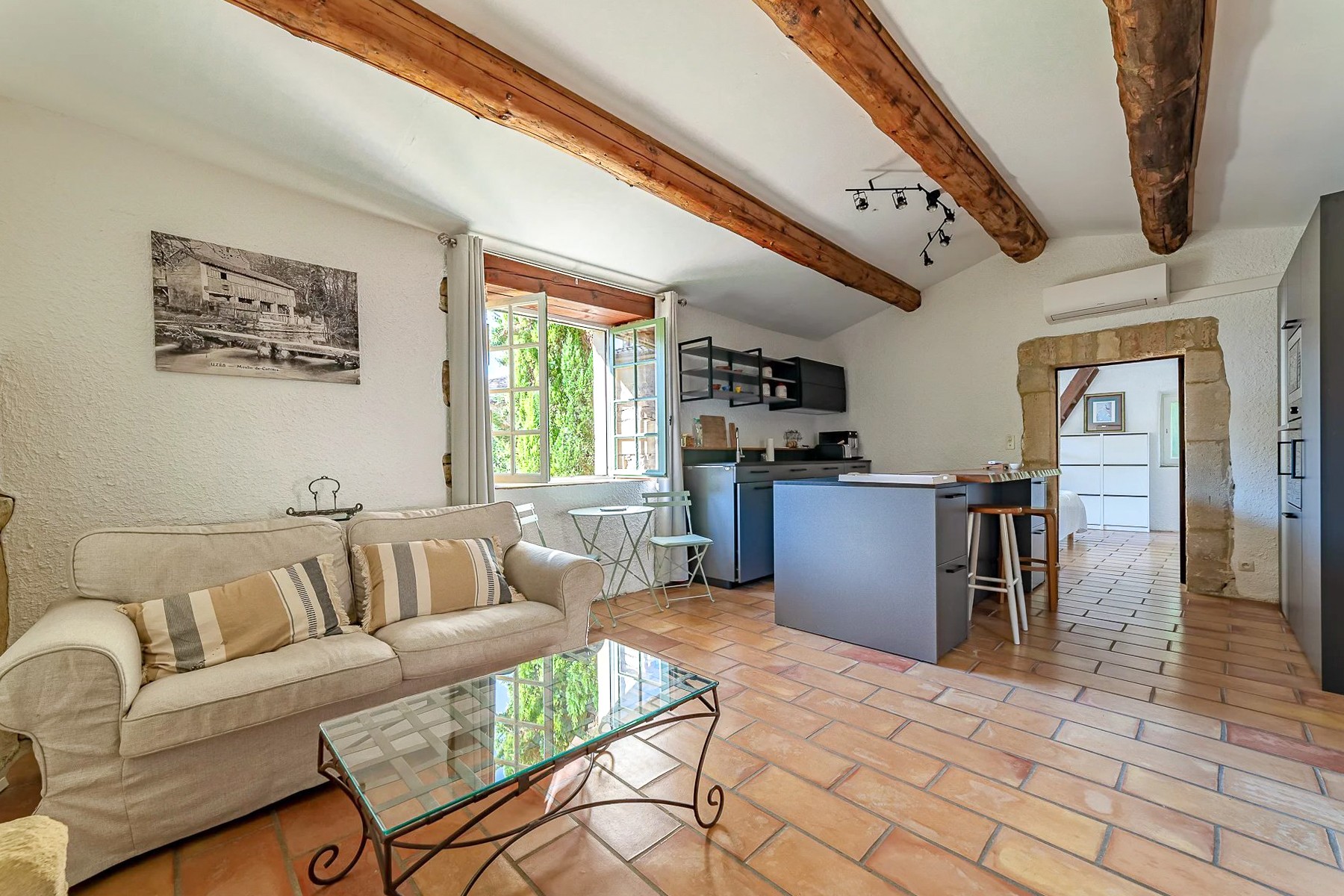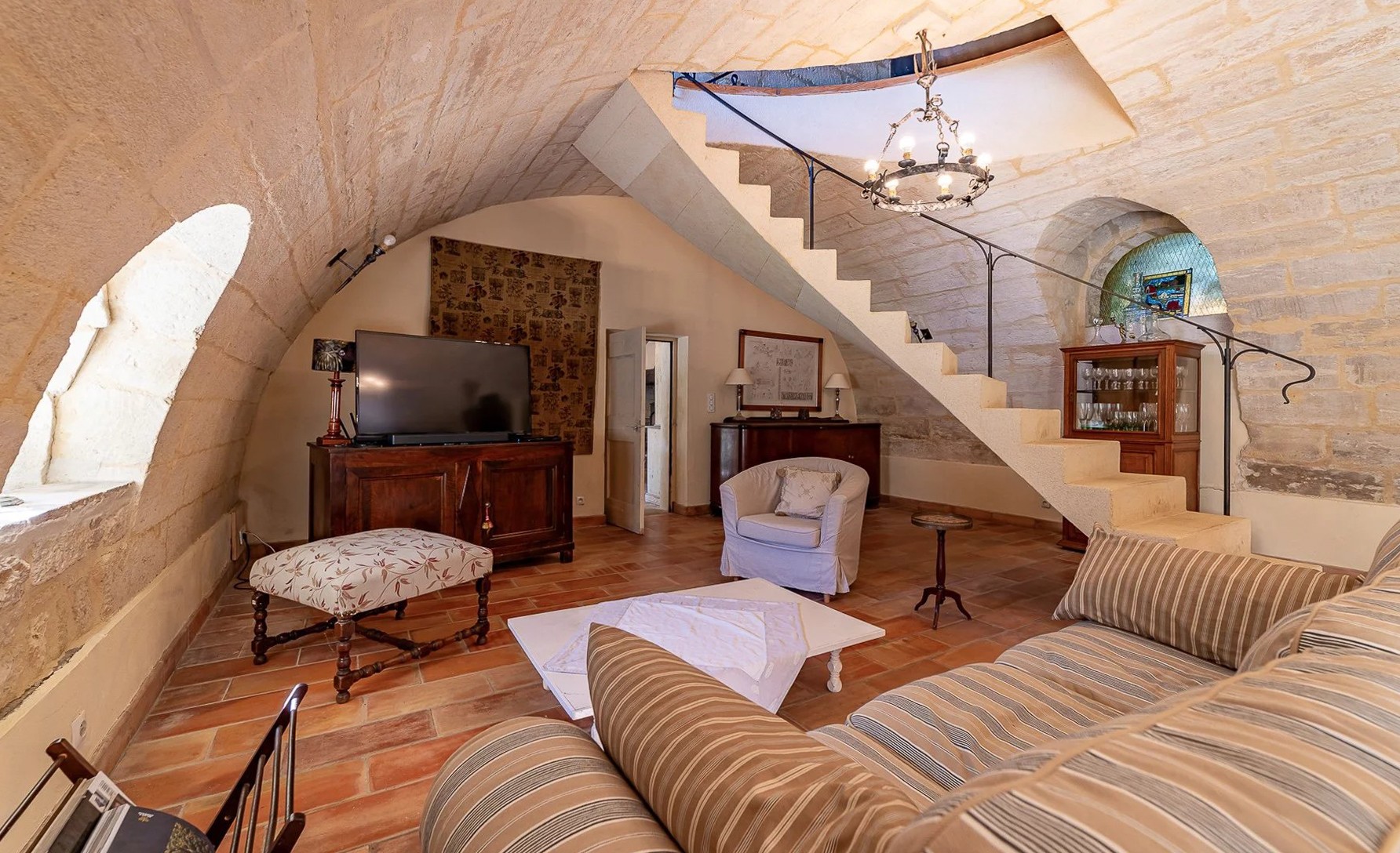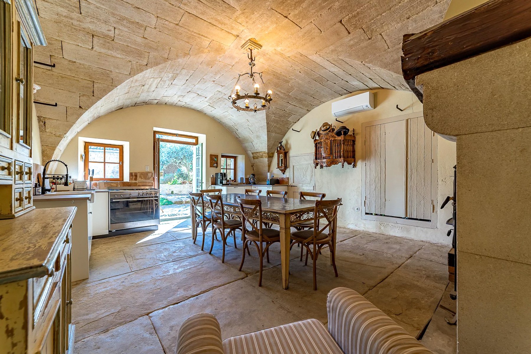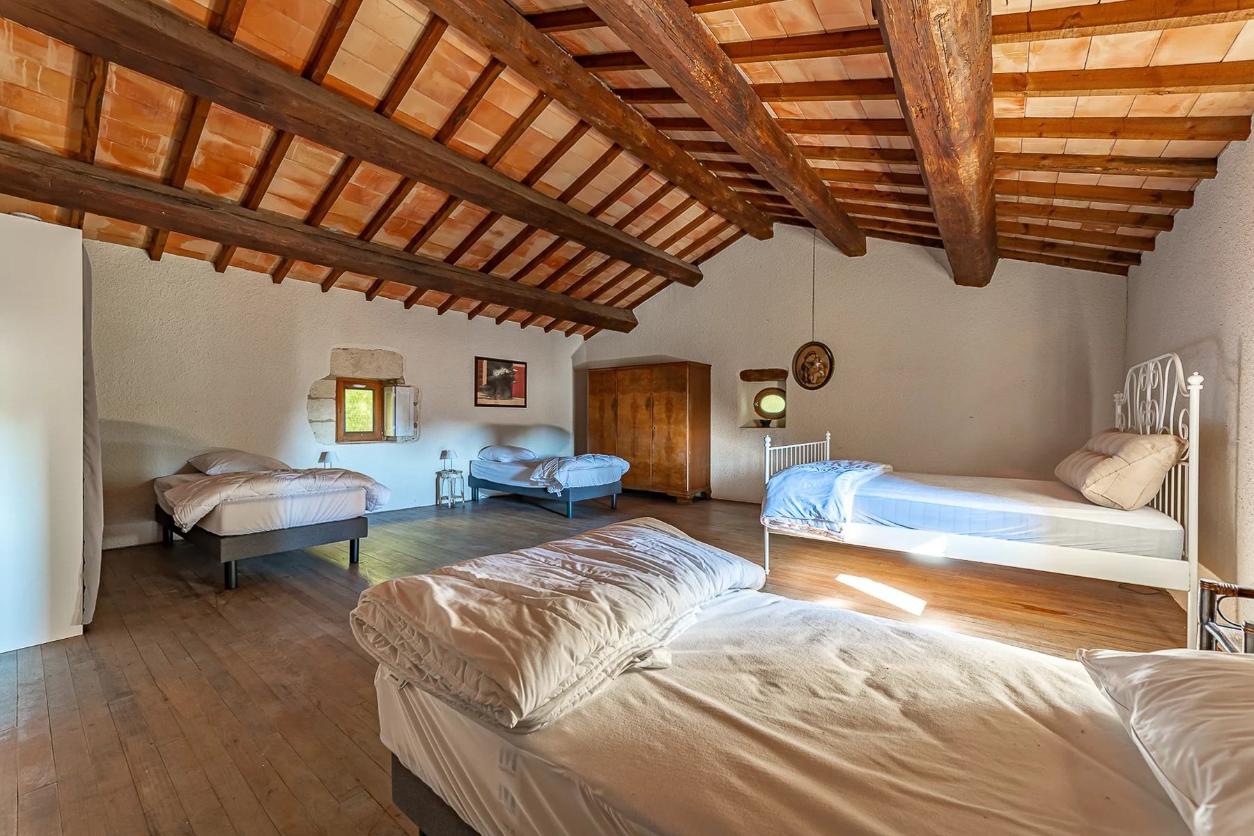 The principal house offers both authenticity and light across approximately 320 m² of living space: a sequence of handsome vaulted rooms, including sitting room, dining room and kitchen, all opening directly onto the garden. The stone vaulting lends warmth and character without diminishing the natural brightness. Upstairs, the sleeping quarters are arranged around a shaded gallery: two en-suite bedrooms, a spacious dormitory, and several additional rooms that could readily serve as a studio or study for those in search of inspiration.