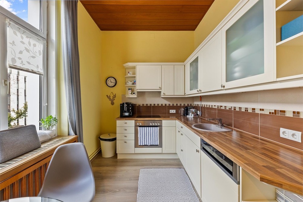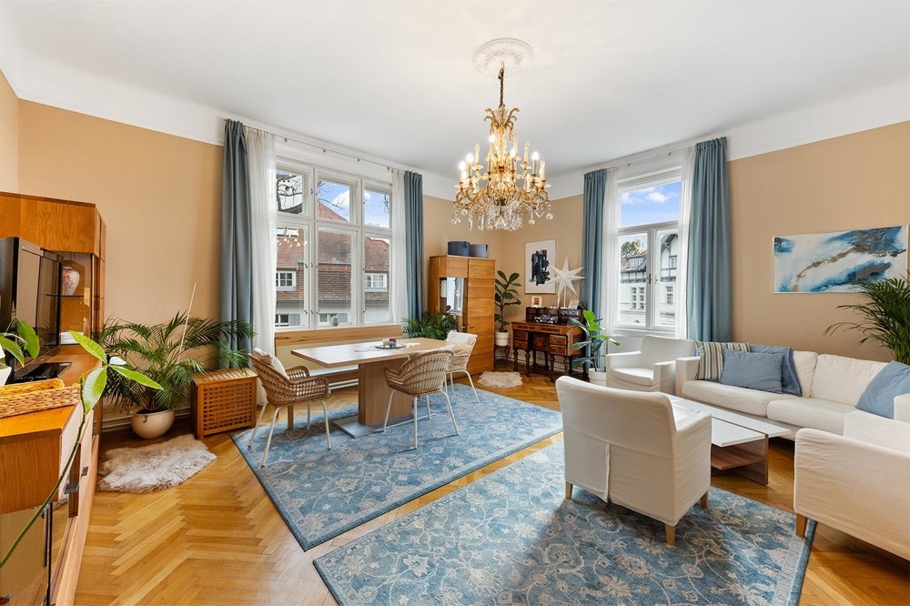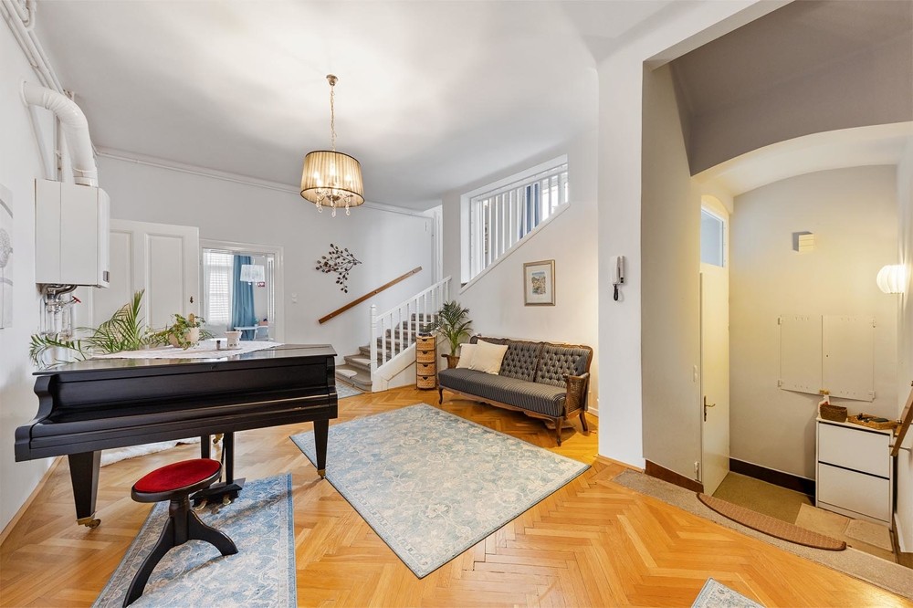 The first floor impresses with a bright entrance hall and generously proportioned rooms. Large windows allow ample natural light, enhancing the refined atmosphere of the turn-of-the-century design.
