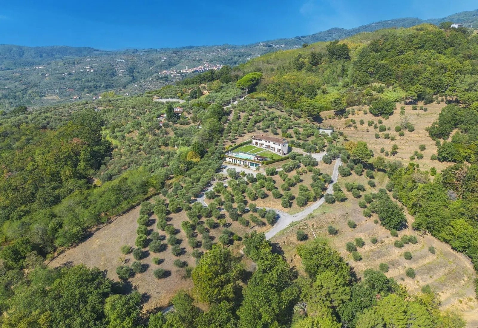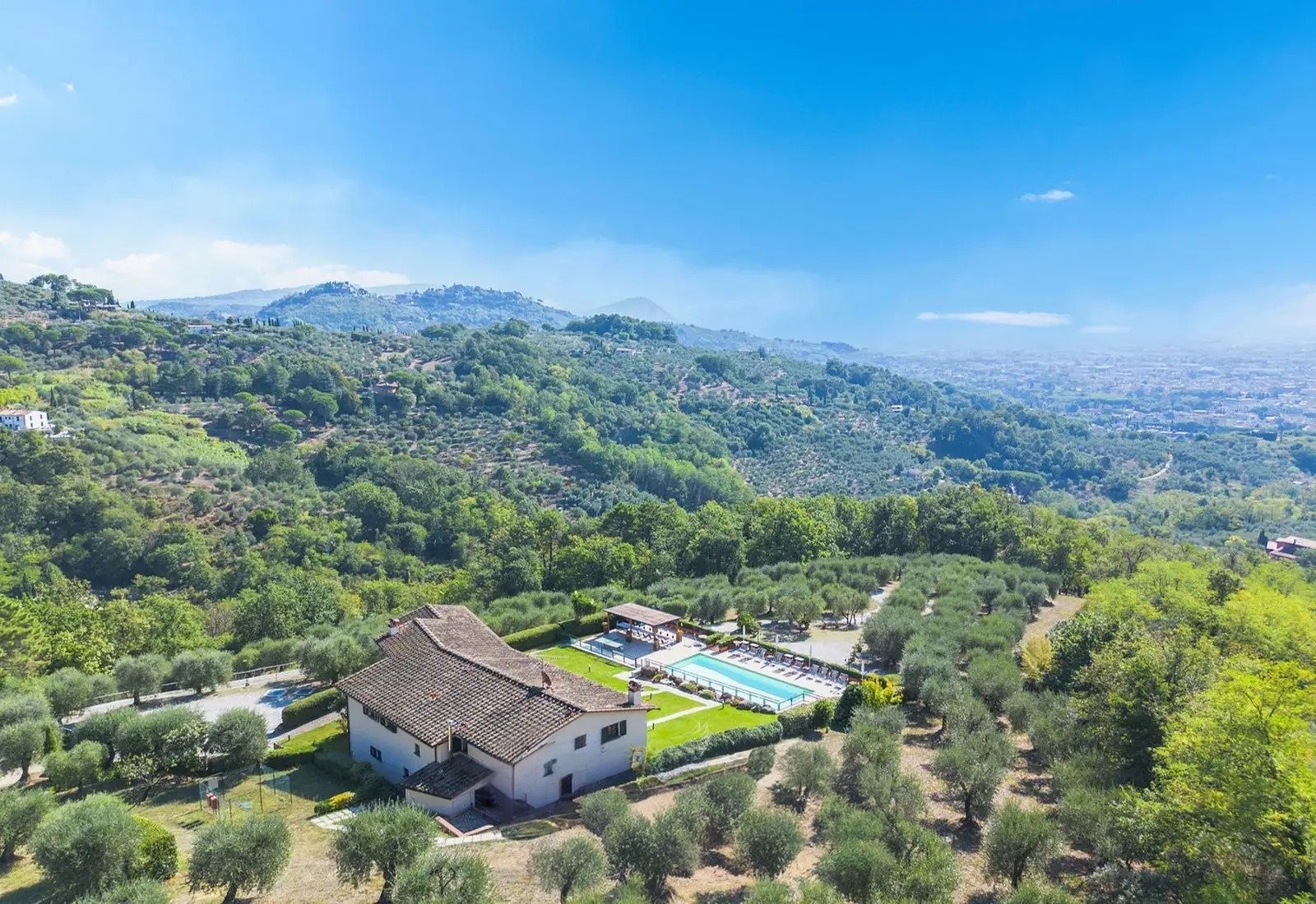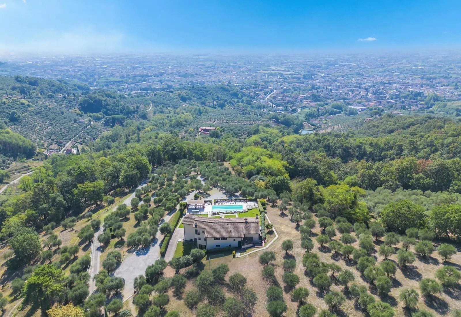 Villa Marsetti occupies an elevated position on the ridge above Montecatini Terme, surrounded by 10 hectares of private land comprising olive groves (over 500 trees), orchards, and established pine forest. The property combines residential infrastructure with agricultural terrain in a setting characteristic of the Tuscan hill landscape.
