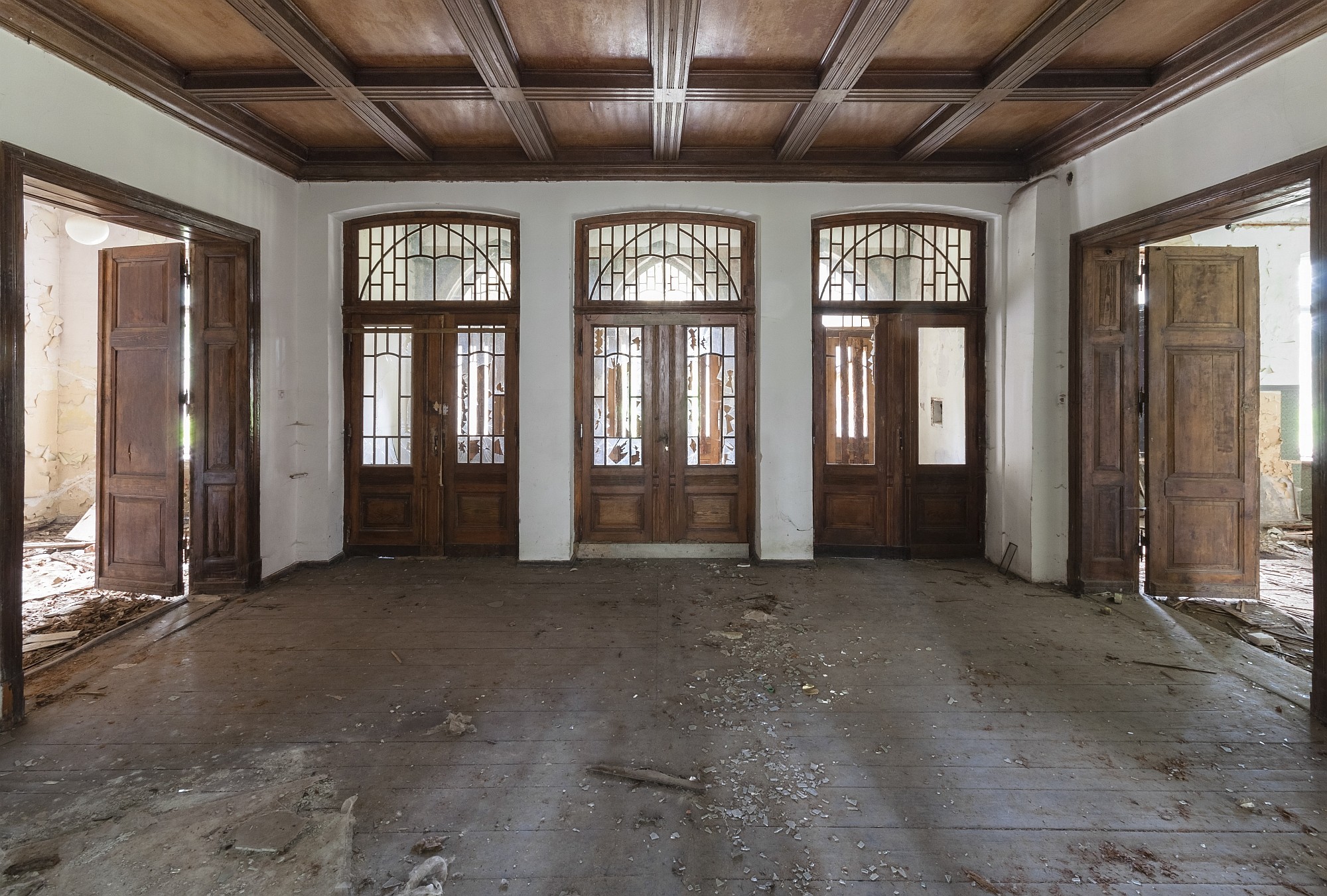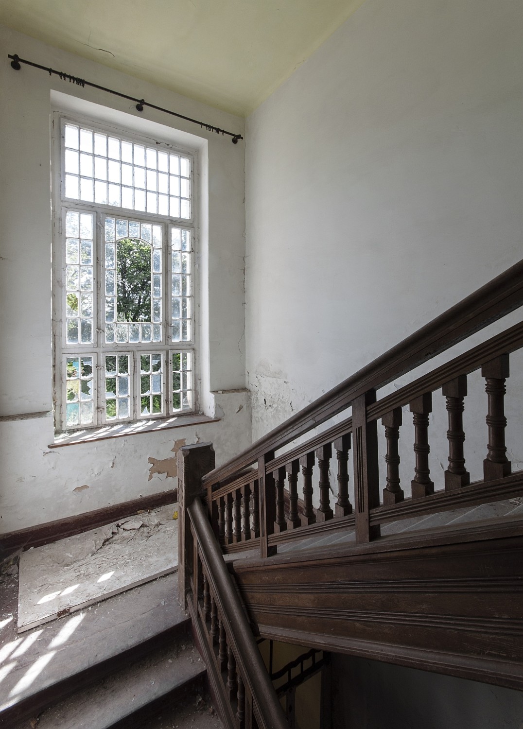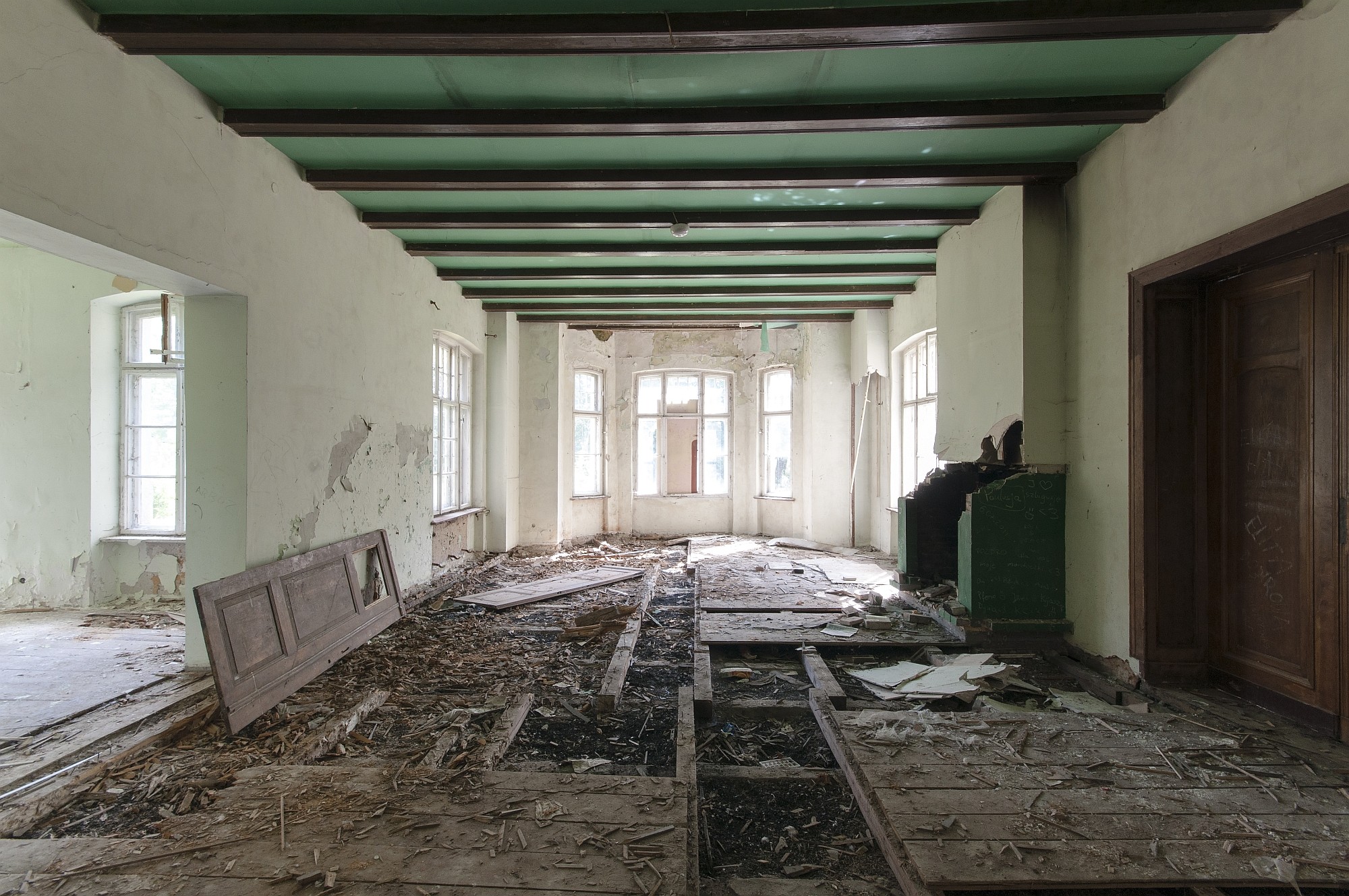 After World War II, the castle was converted into a school. The former room and ceiling decorations were lost during post-war renovation work. Some historical elements, including doors, ceiling beams, and wood paneling in the entrance hall, are sporadically preserved. However, due to prolonged vacancy and vandalism, large parts of the interior have been destroyed over time. From the entrance hall, a decorative oak staircase leads to a long corridor, and behind the tower is another external spiral staircase that extends from the basement through all floors.